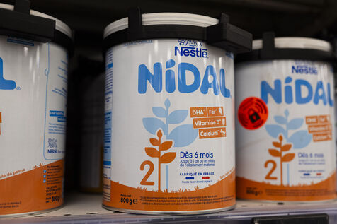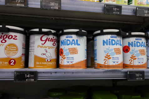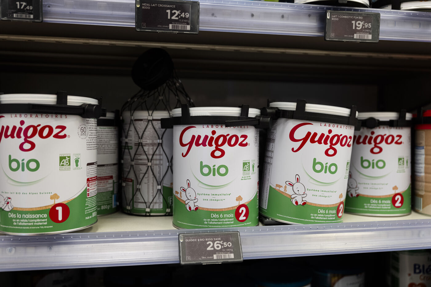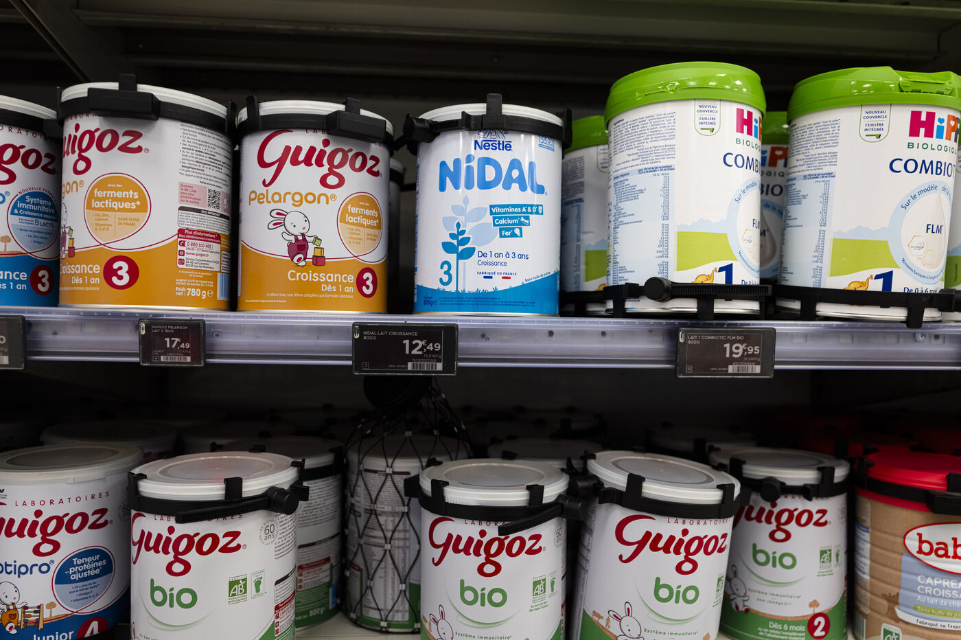 View of shelves stocked with baby milk powder tins from Guigoz and Nidal brands in a supermarket in France on January 21, 2026. The image shows infant formula products labeled Croissance 3 with visible brand logos Guigoz and Nestle Nidal