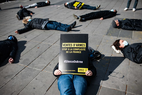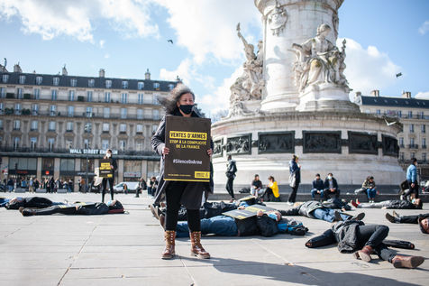 Launch of the "Silence On Arme" campaign by Amnesty International France, every Thursday until March 25, anniversary of the conflict in Yemen. Activist action that aims to denounce the lack of control and transparency on the illegal sale of French weapons. Paris 11 March 2021.