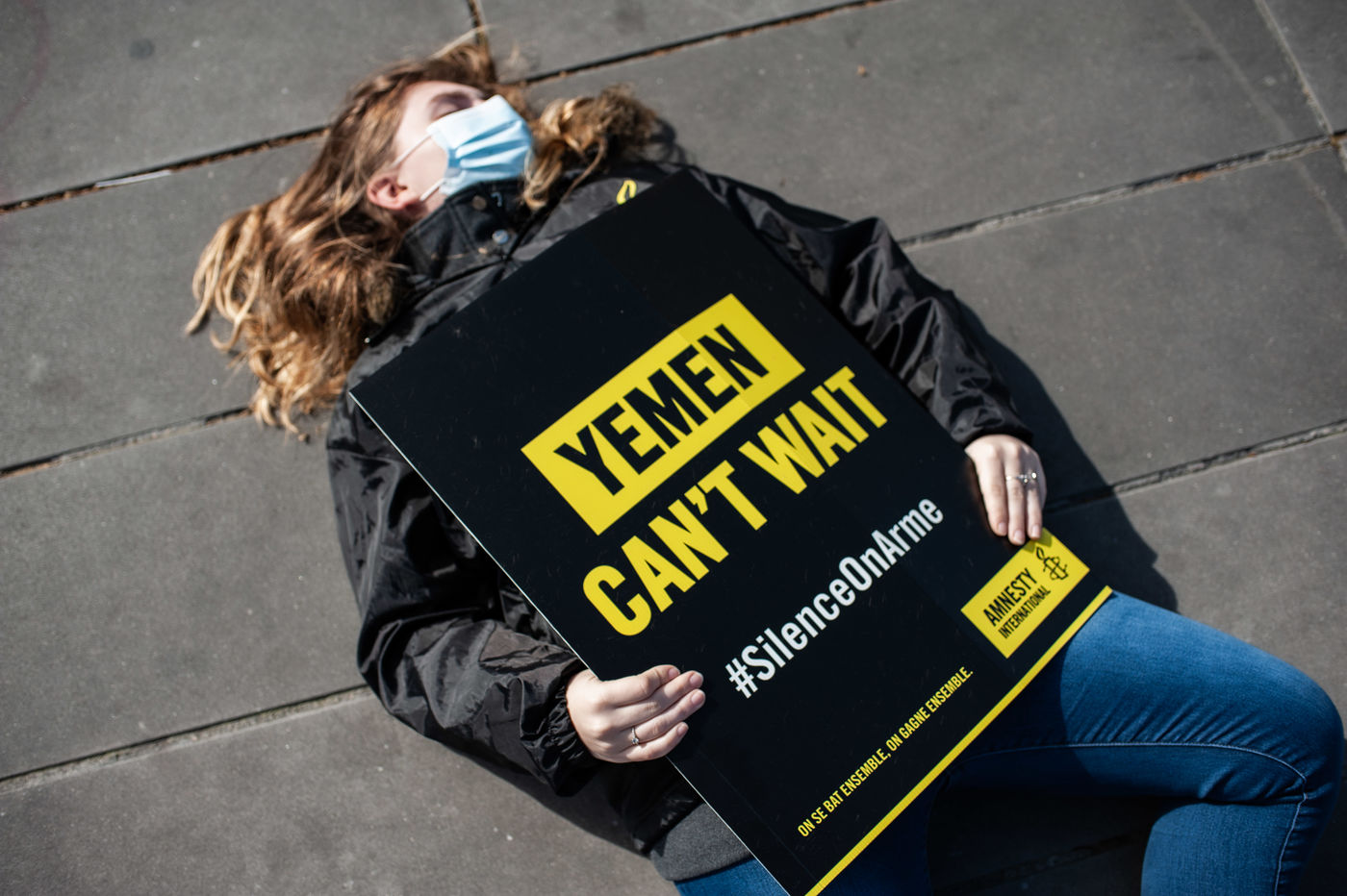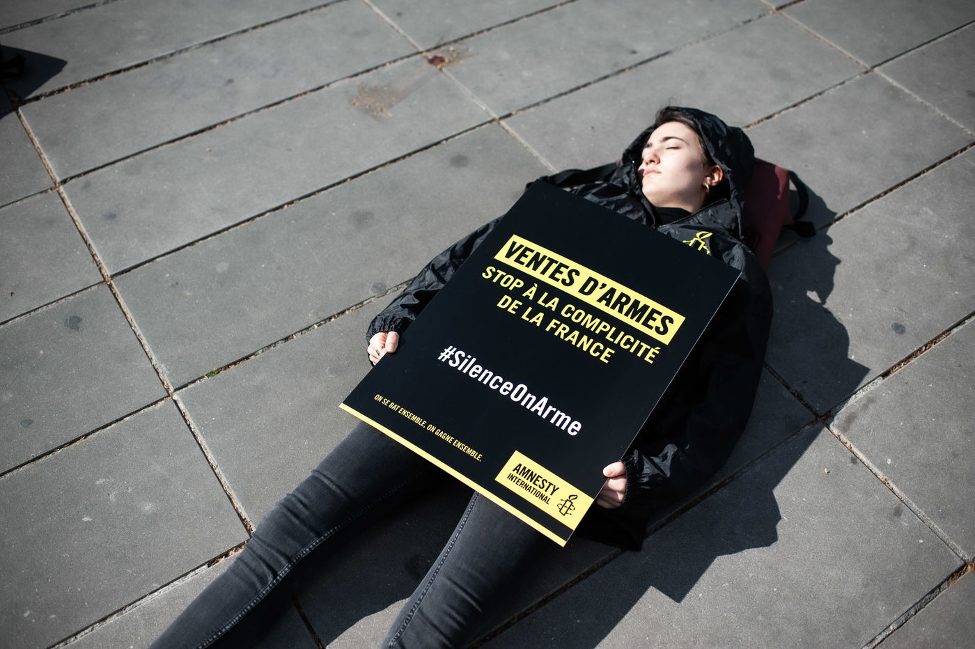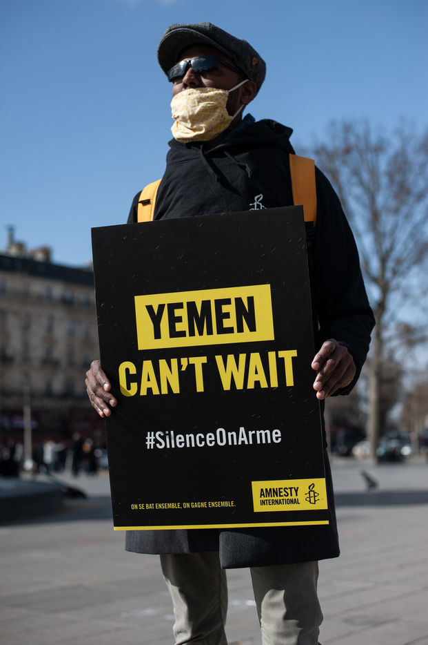 Lancement de la campagne "Silence On Arme" par Amnesty International France, chaque jeudi jusqu'au 25 mars, anniversaire du conflit au Yemen. Action militante qui vise à denoncer le manque de controle et de transparence sur la vente illegale d'armes françaises. Paris 11 mars 2021.