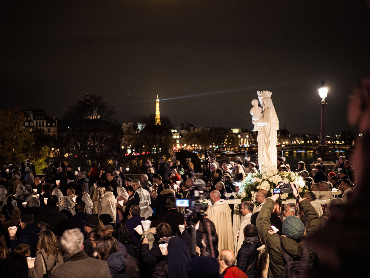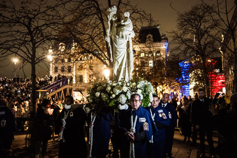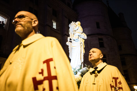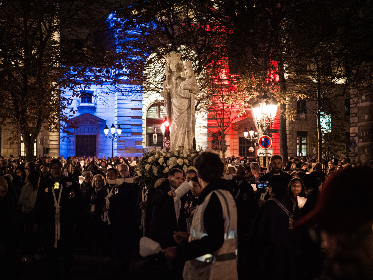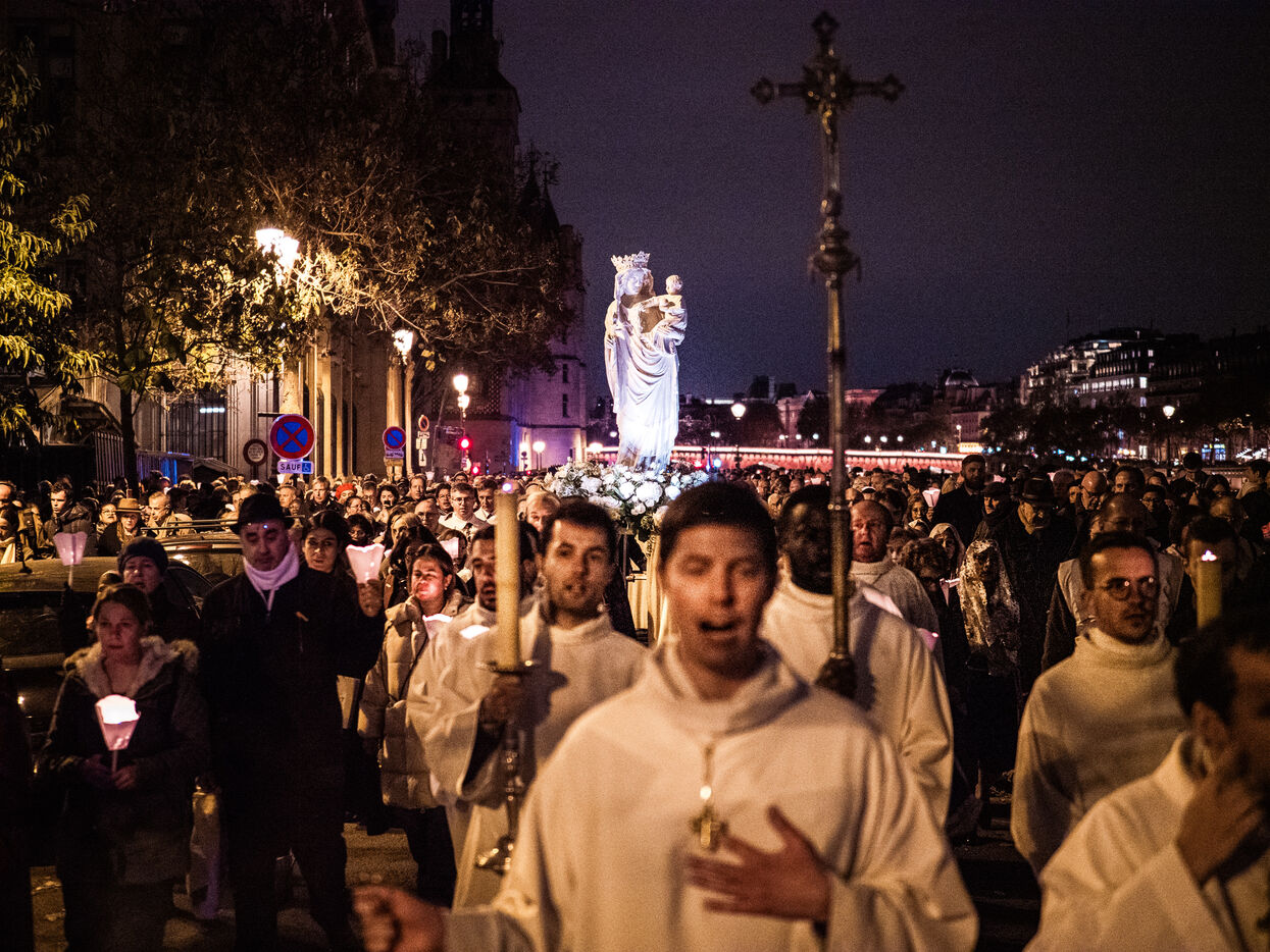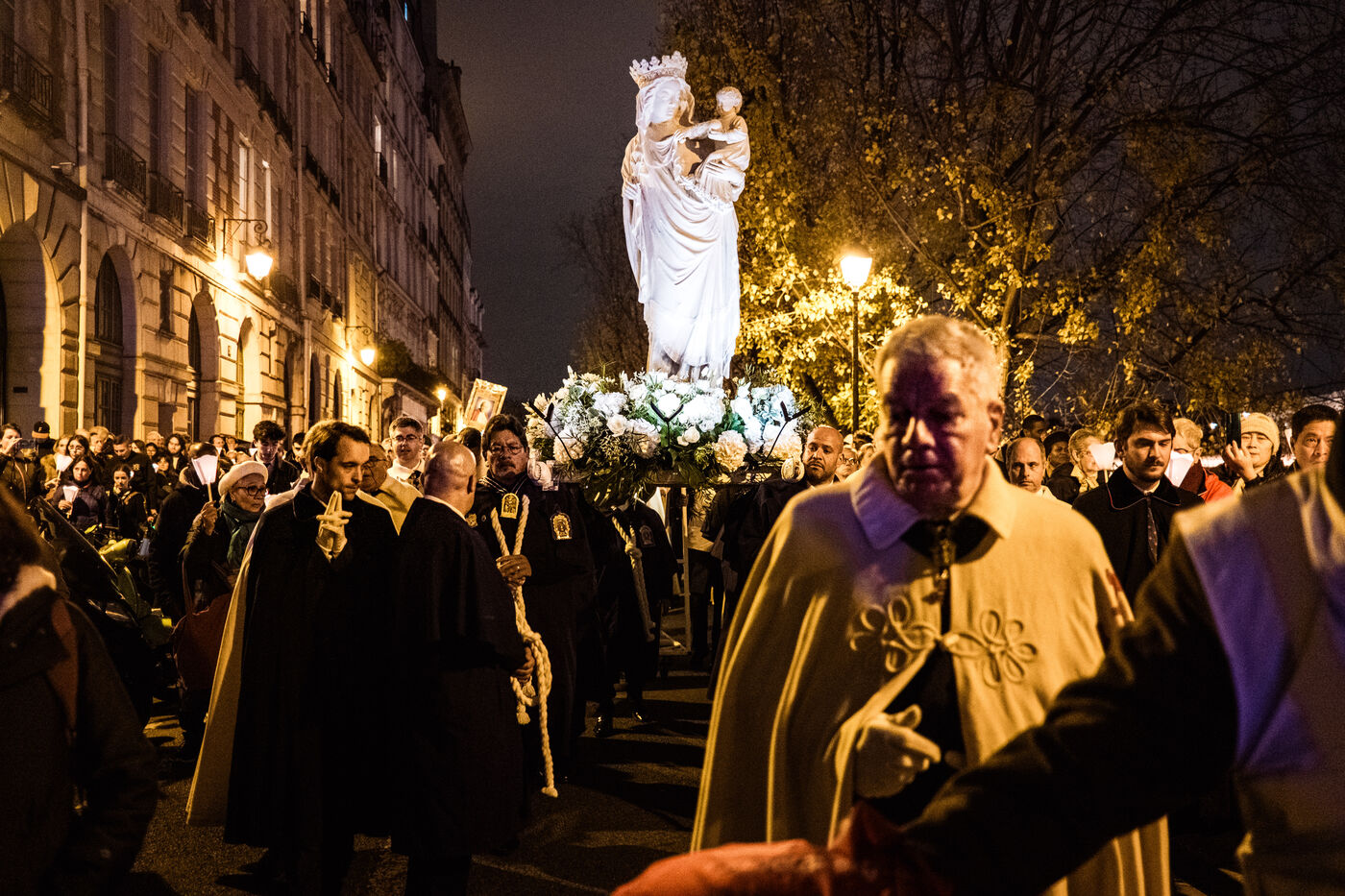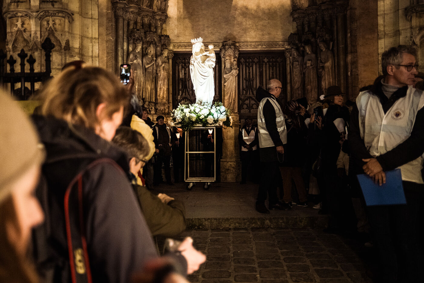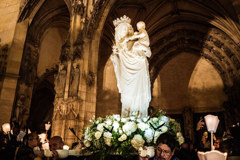 Retour de la Statue de La Vierge à l'Enfant à Notre-Dame de Paris avec une procession aux flambeaux.