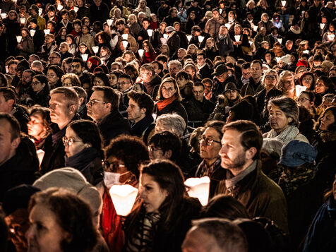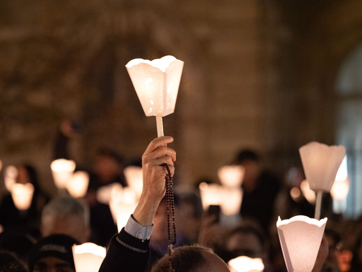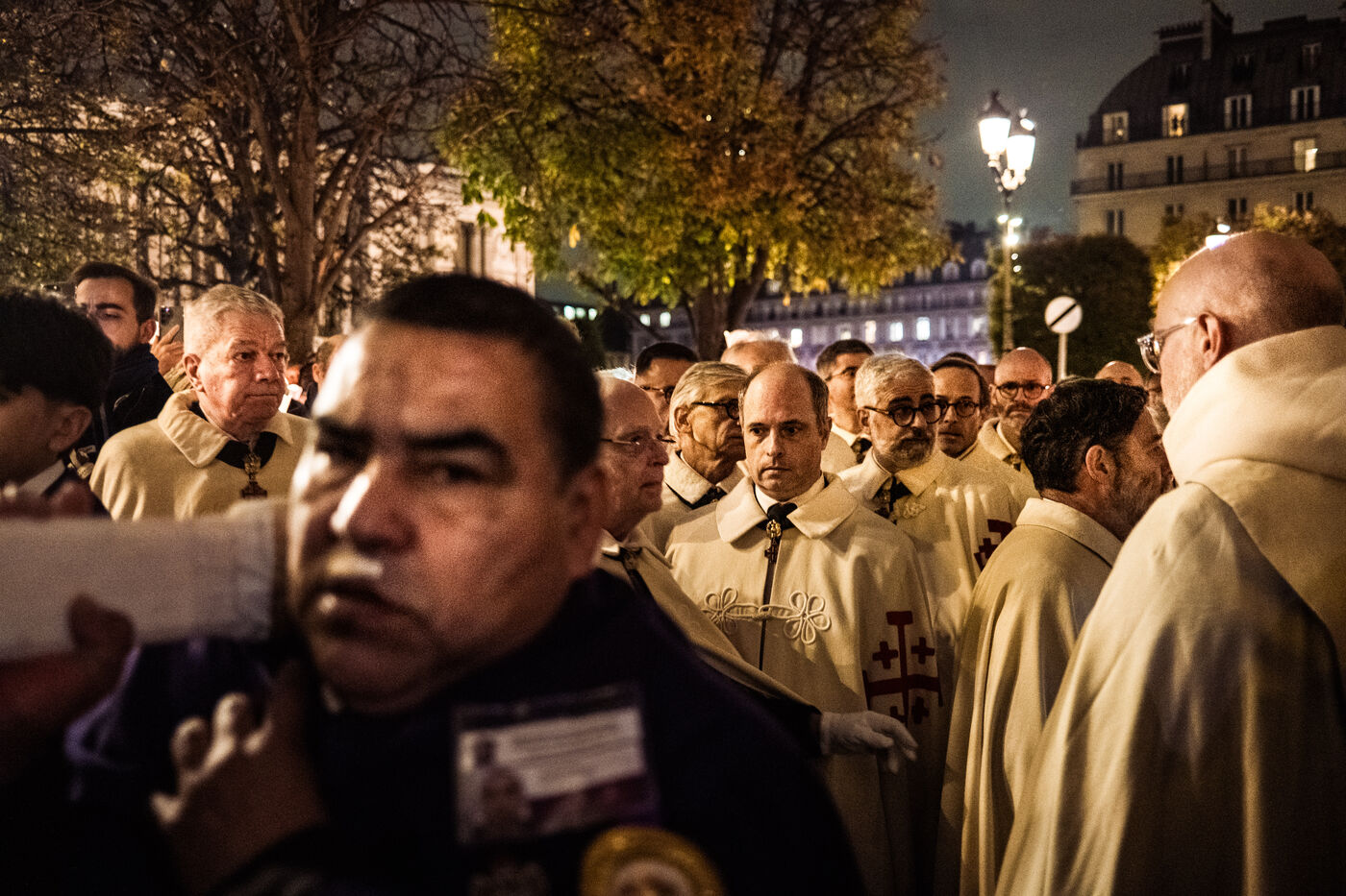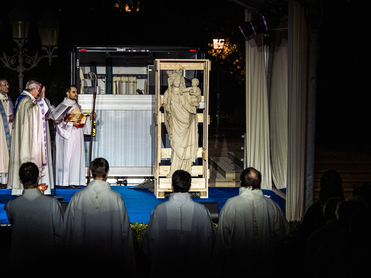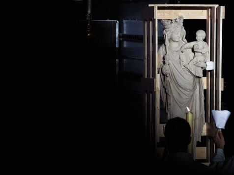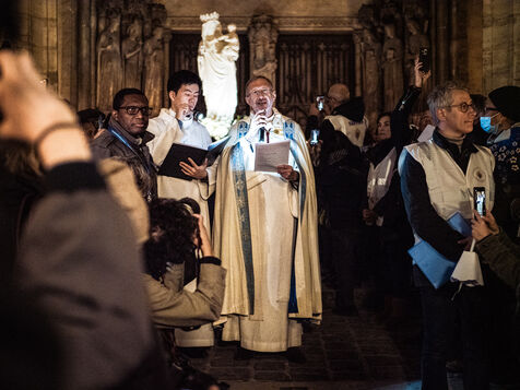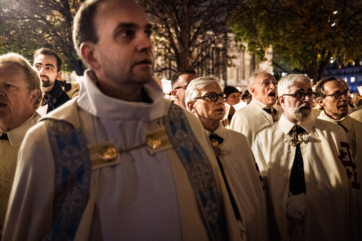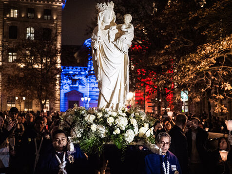 Retour de la Statue de La Vierge à l'Enfant à Notre-Dame de Paris avec une procession aux flambeaux.