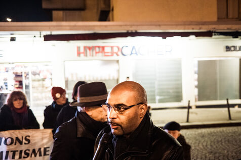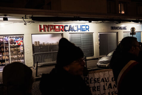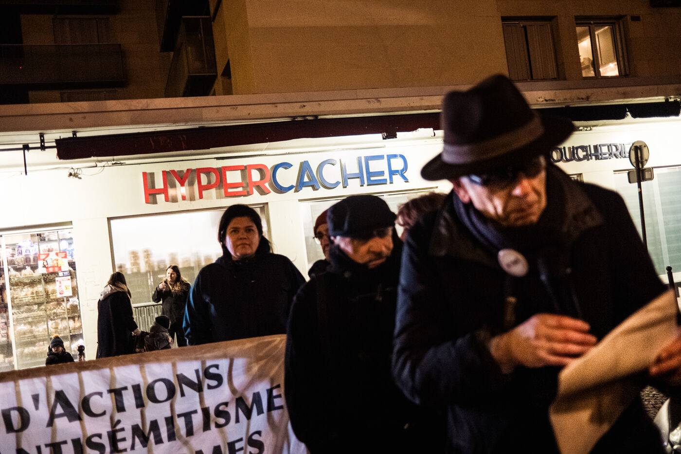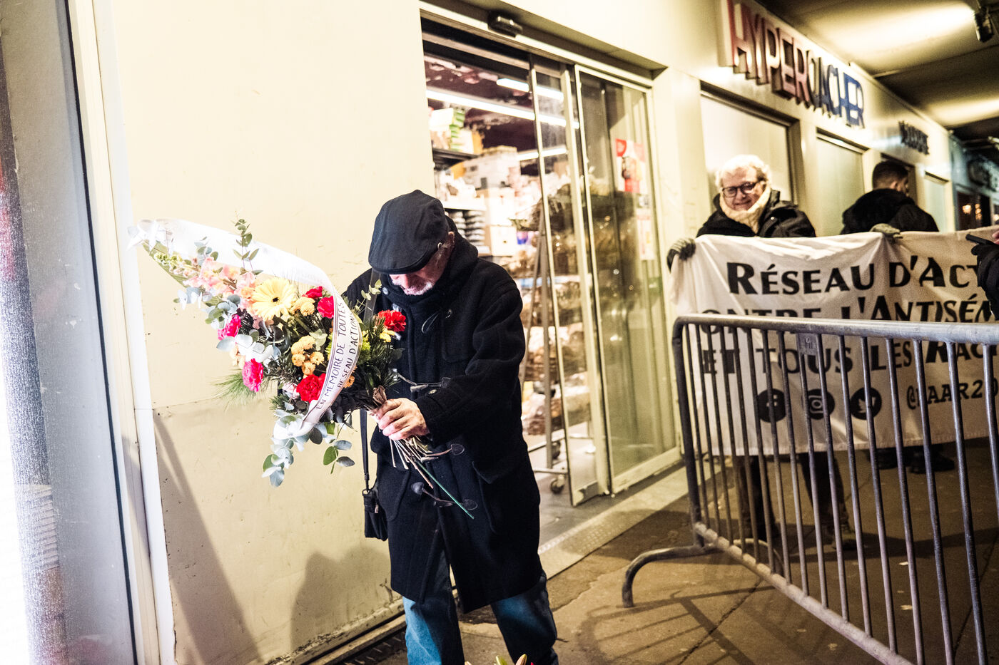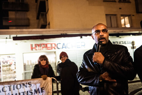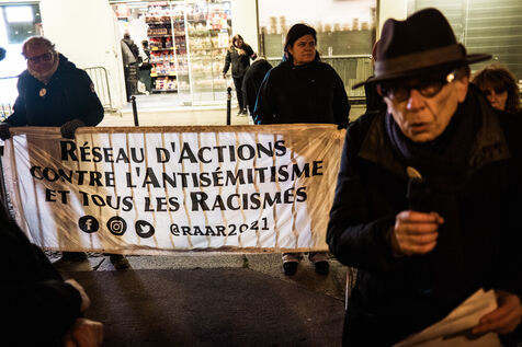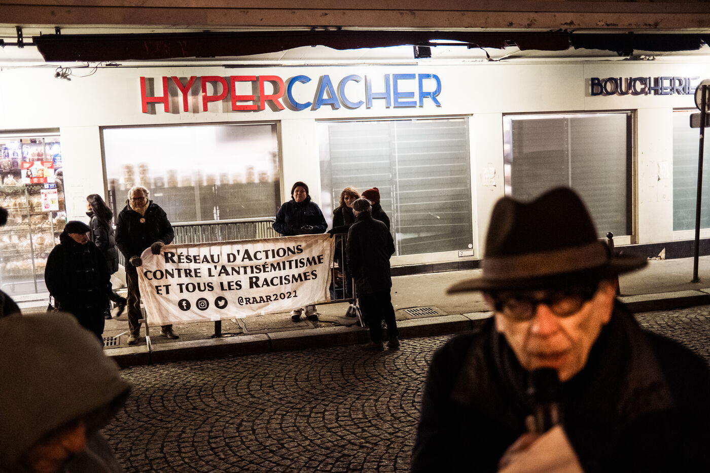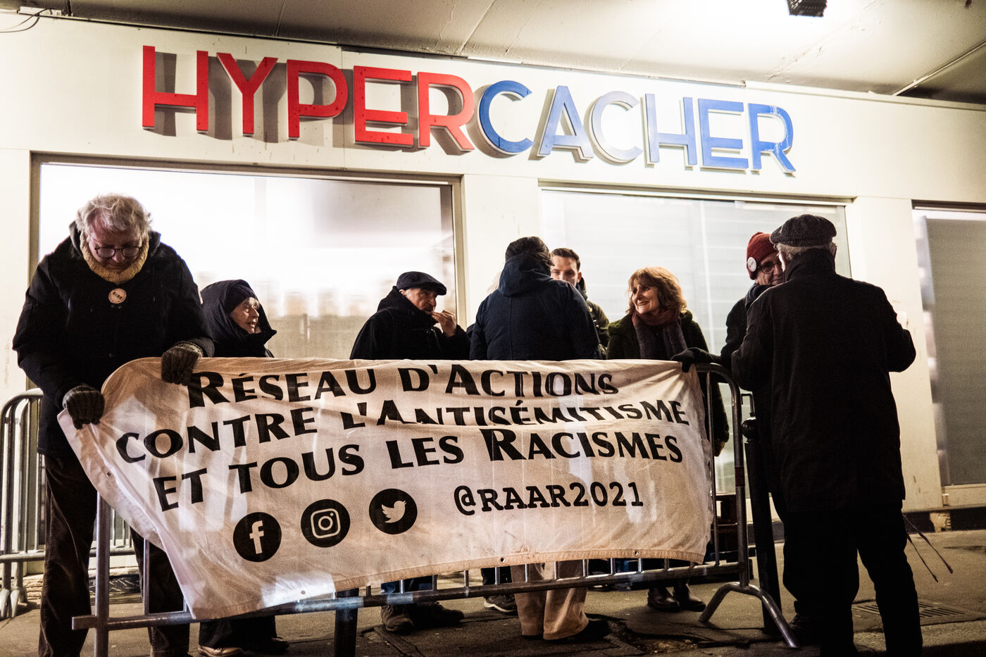 Rally by the Réseau d'Action Contre l'Antisémitisme et Tous Les Racismes (RAAR) to commemorate 10 years since the January 2015 attacks. January 9, 2025, in front of HyperCacher.