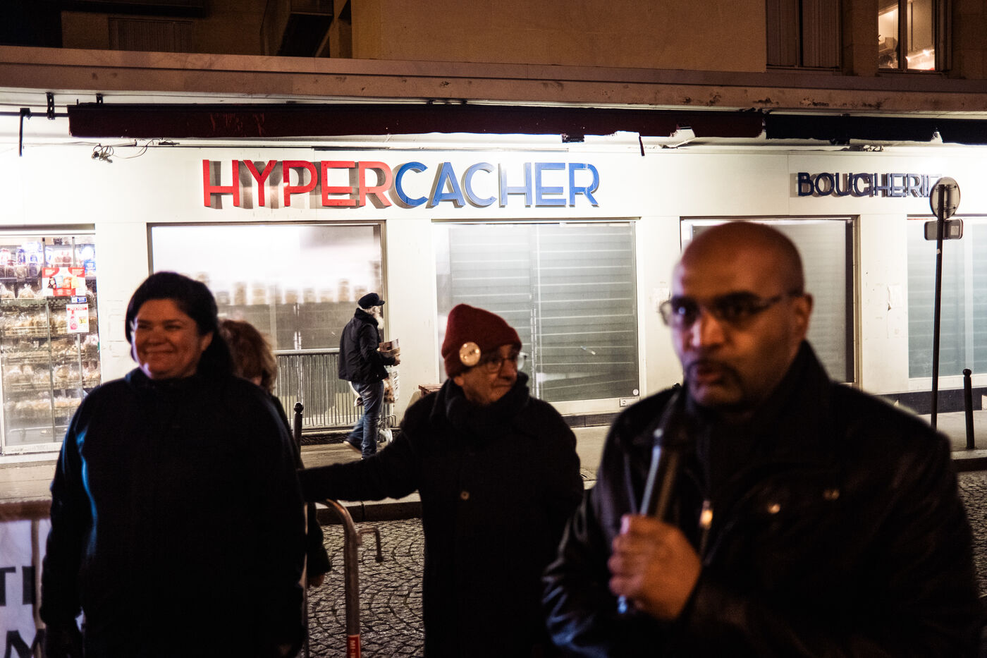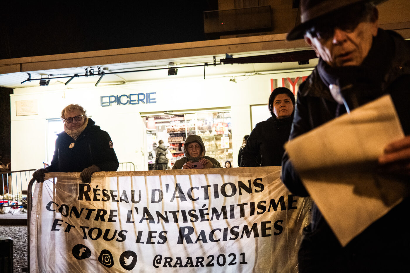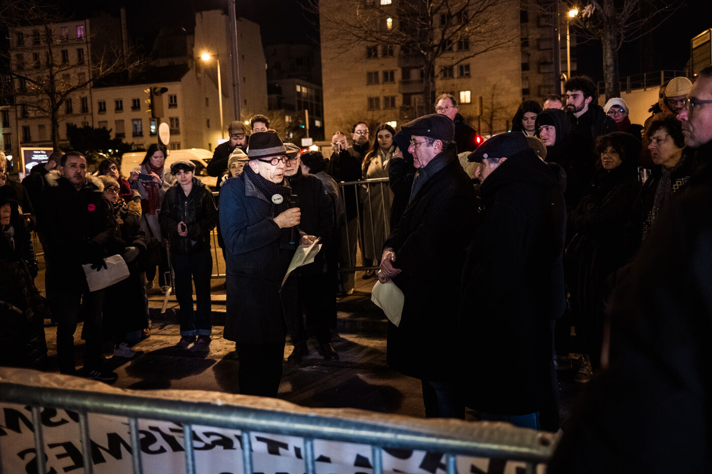 Rassemblement par le Réseau d'Action Contre l'Antisémitisme et Tous Les Racismes (RAAR) pour commémorer les 10 ans des attentas de janvier 2015. Le 9 janvier 2025, devant l'HyperCacher.