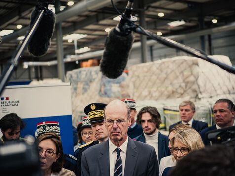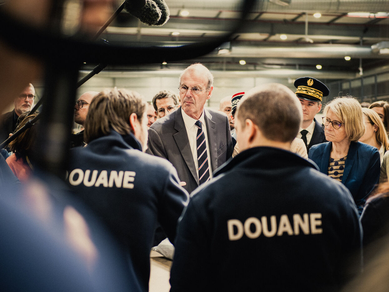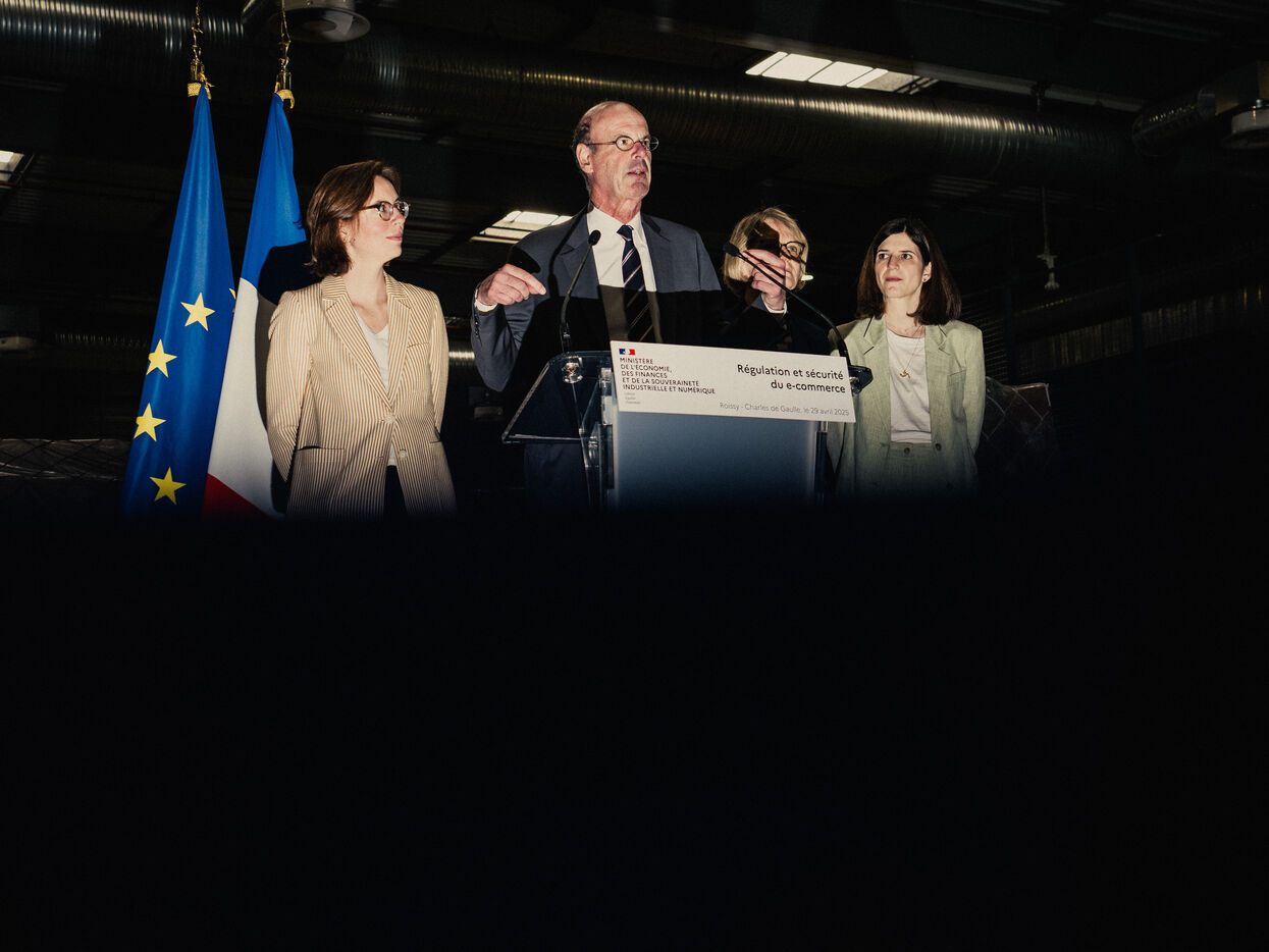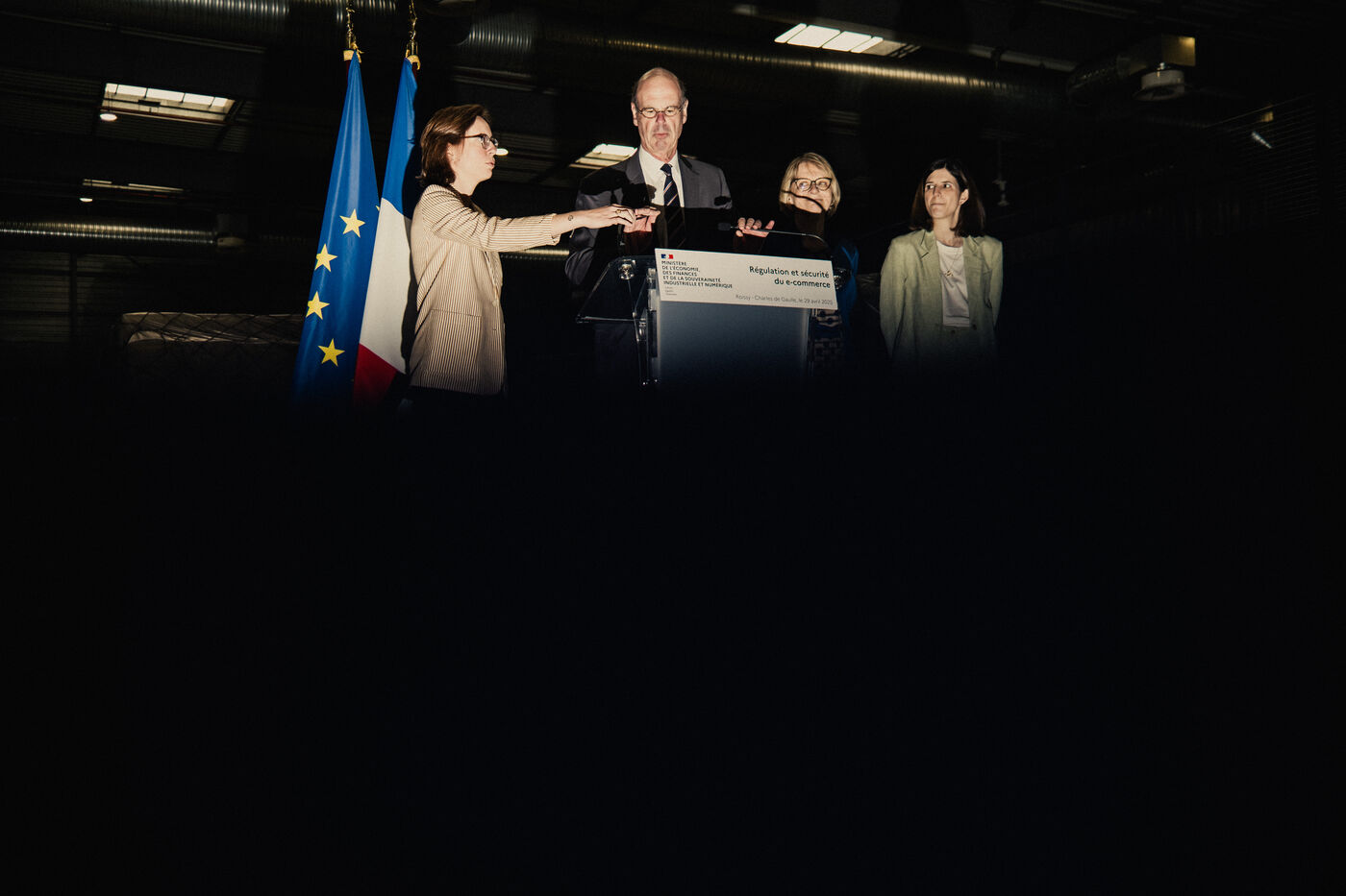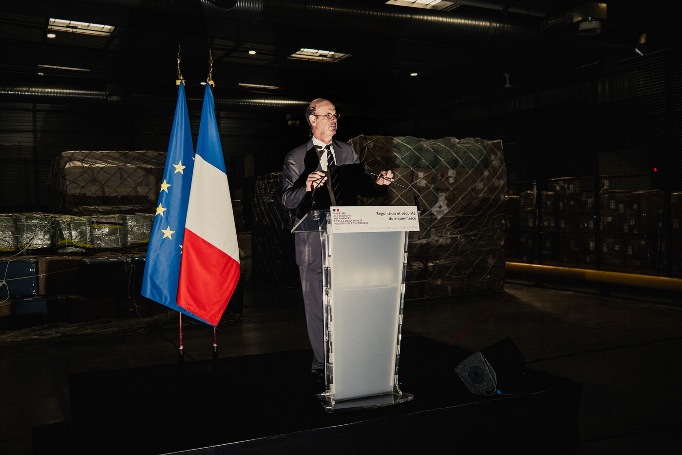 Ministerial visit to a warehouse at Roissy Charles de Gaulle airport to discuss the regulation and security of e-commerce platforms