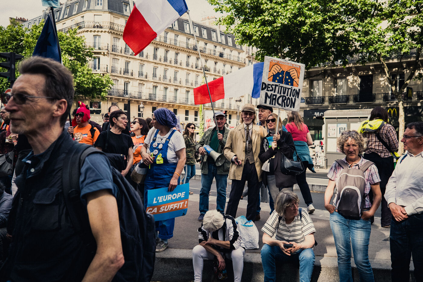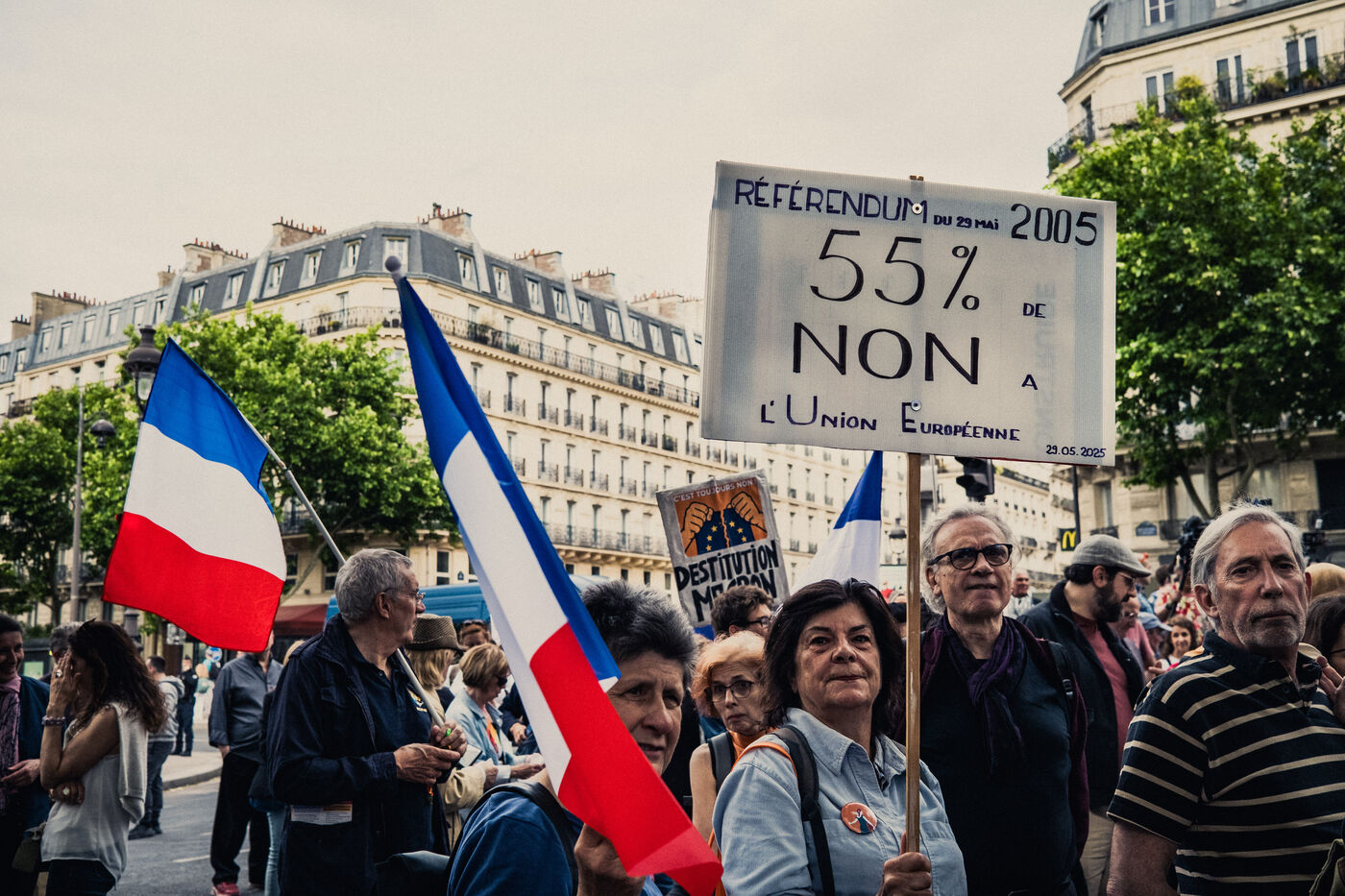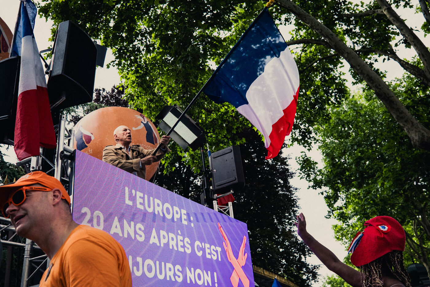 Rally of the political party Les Patriotes for France's exit from the EU on the occasion of the twentieth anniversary of the French referendum on the treaty establishing a Constitution for Europe.