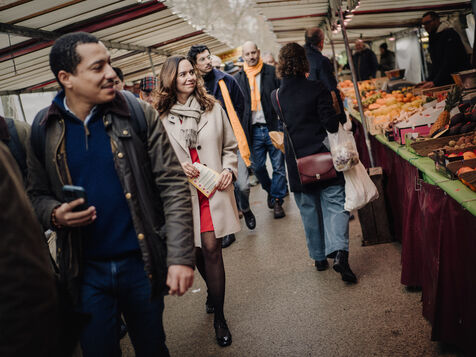Déplacement de Sarah Knafo membre de Reconquête! au marché Saxe-Breteuil dans le cadre de sa campagne pour la Mairie de Paris