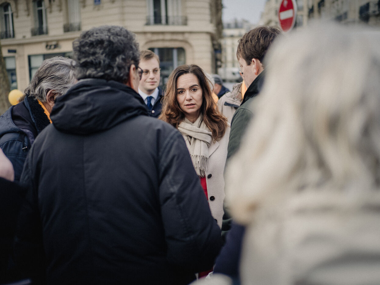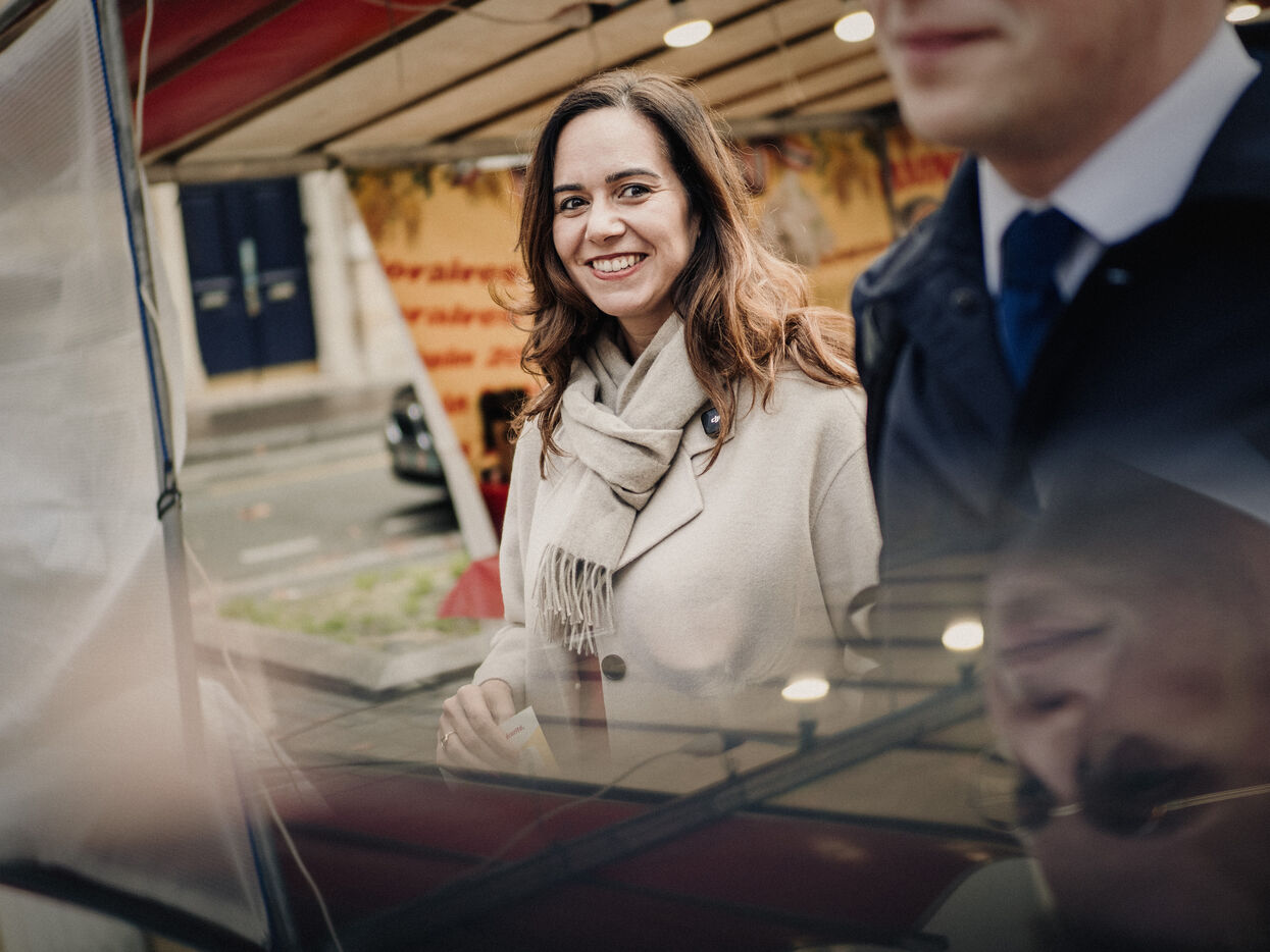 Déplacement de Sarah Knafo membre de Reconquête! au marché Saxe-Breteuil dans le cadre de sa campagne pour la Mairie de Paris.