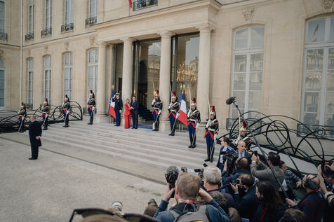 Emmanuel Macron, President of France, receives Friedrich Merz, Federal Chancellor of Germany, and Giorgia Meloni, Prime Minister of Italy, as part of a meeting of allies aimed at considering the deployment of a multinational force tasked with ensuring security and the free flow of commercial traffic in the Strait of Hormuz.