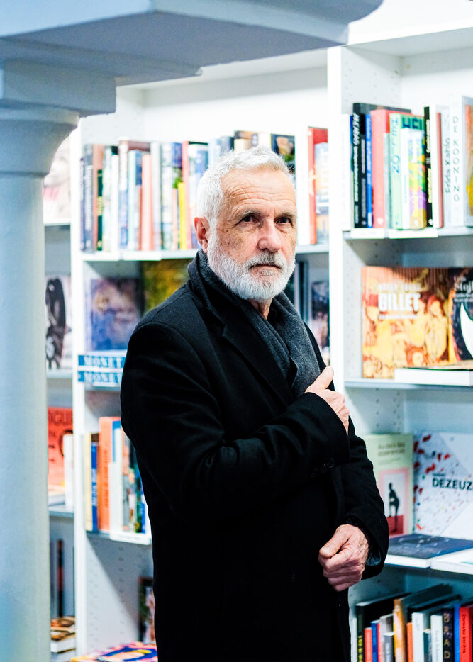 Naviguant entre souvenirs et fiction, l'auteur de bande dessinée Jean-Marc Rochette, ici photographié mardi 24 mars 2026 dans les allées de la librairie Le Square de Grenoble, compose dans Le Festin de pierres, son nouvel ouvrage graphique, une ode à la nature et au vivant, pareillement en danger.