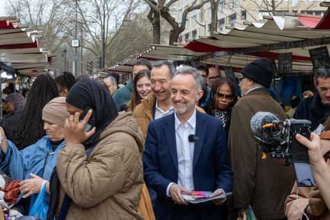 Le candidat de la Gauche Unie a la Mairie de Paris Emmanuel Gregoire s'est rendu ce vendredi sur le marche de Belleville pour rencontrer les parisiennes et les parisiens. Il était accompagné de nombreux candidats d'autres arrondissements.