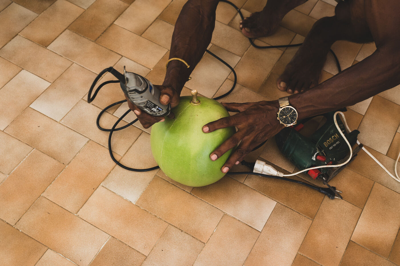 A member of the Cucurbitaceae family, the calabash is widespread in Guadeloupe. Cut in half, it is probably the oldest container in the West Indies, or kwi in Creole. This object was already used by the Amerindians and is still used in kitchens today. Decorative object, musical instrument, lamp, its uses are varied, and artists have no shortage of imagination when it comes to bringing it to light. Miky, awtist on calabash, Kimay création, passionately cultivates and works it in all its forms in her workshop in Sainte-Anne, Guadeloupe, from personalized objects to atypical lighting fixtures.