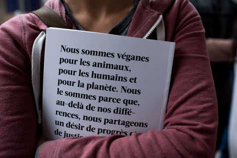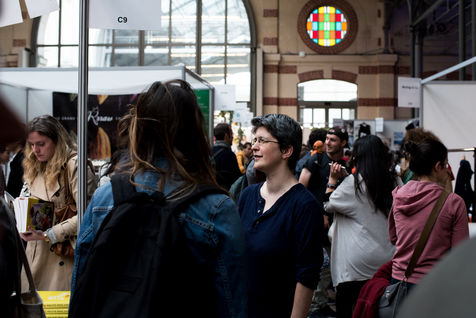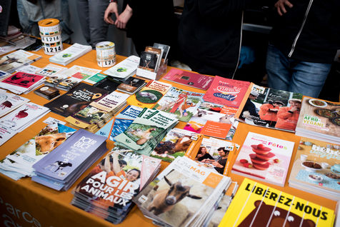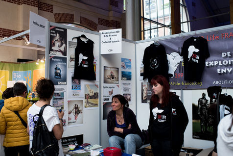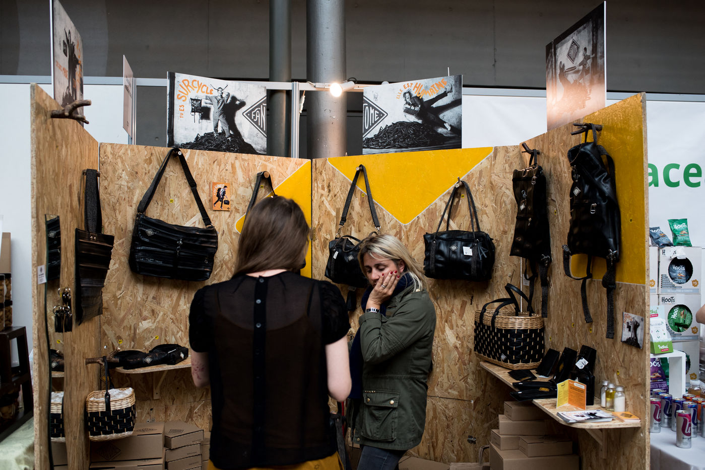 22/04/2017, Paris, France. Le salon veggie world tient sa troisième édition au 104 à Paris. Différents stands représentent les iniatives végétariennes, végétaliennes et véganes. Ici, une marque de cuir végan.