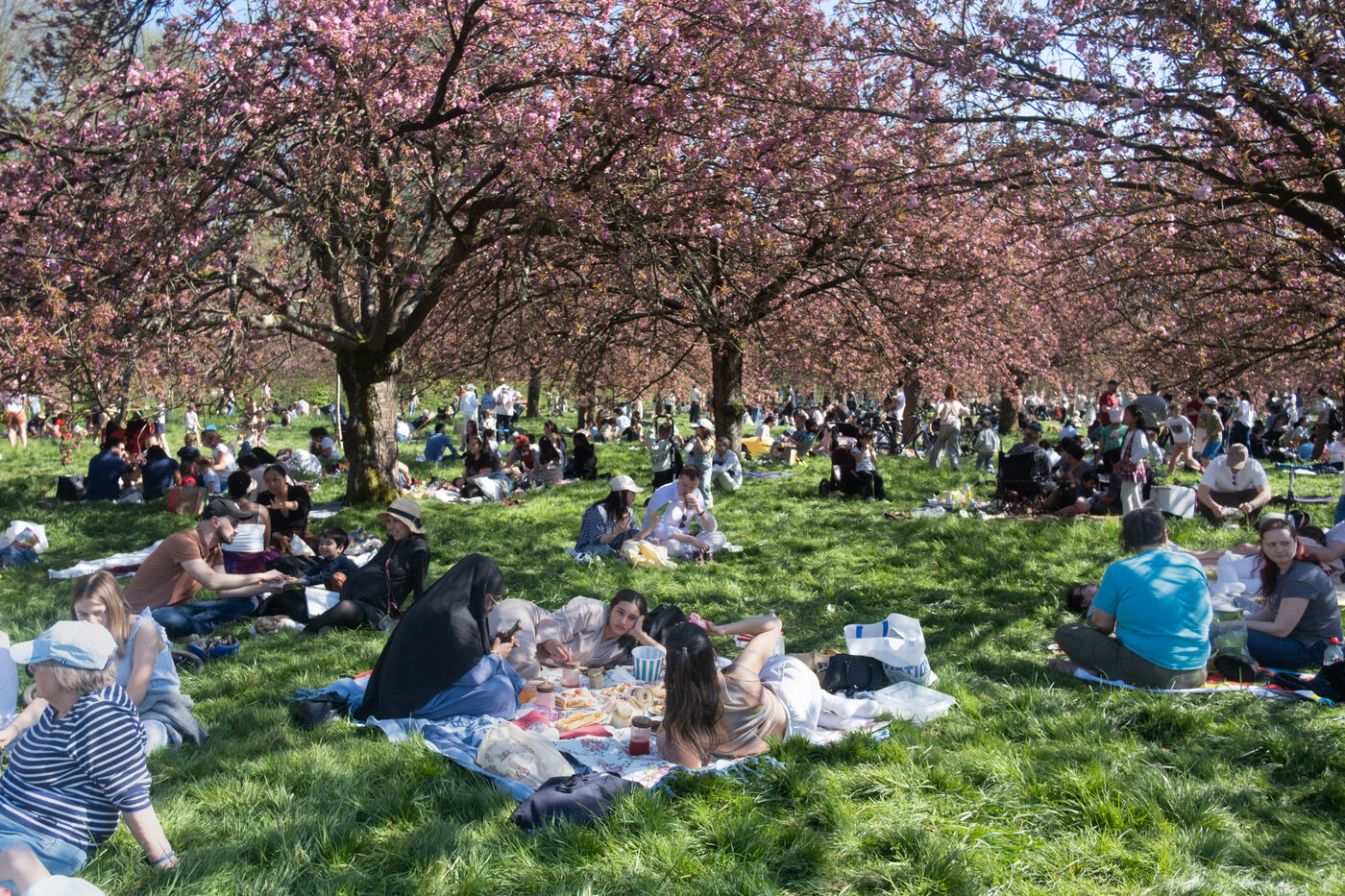 Les visiteurs du Parc de Sceaux viennent contempler les cerisiers en fleurs.