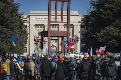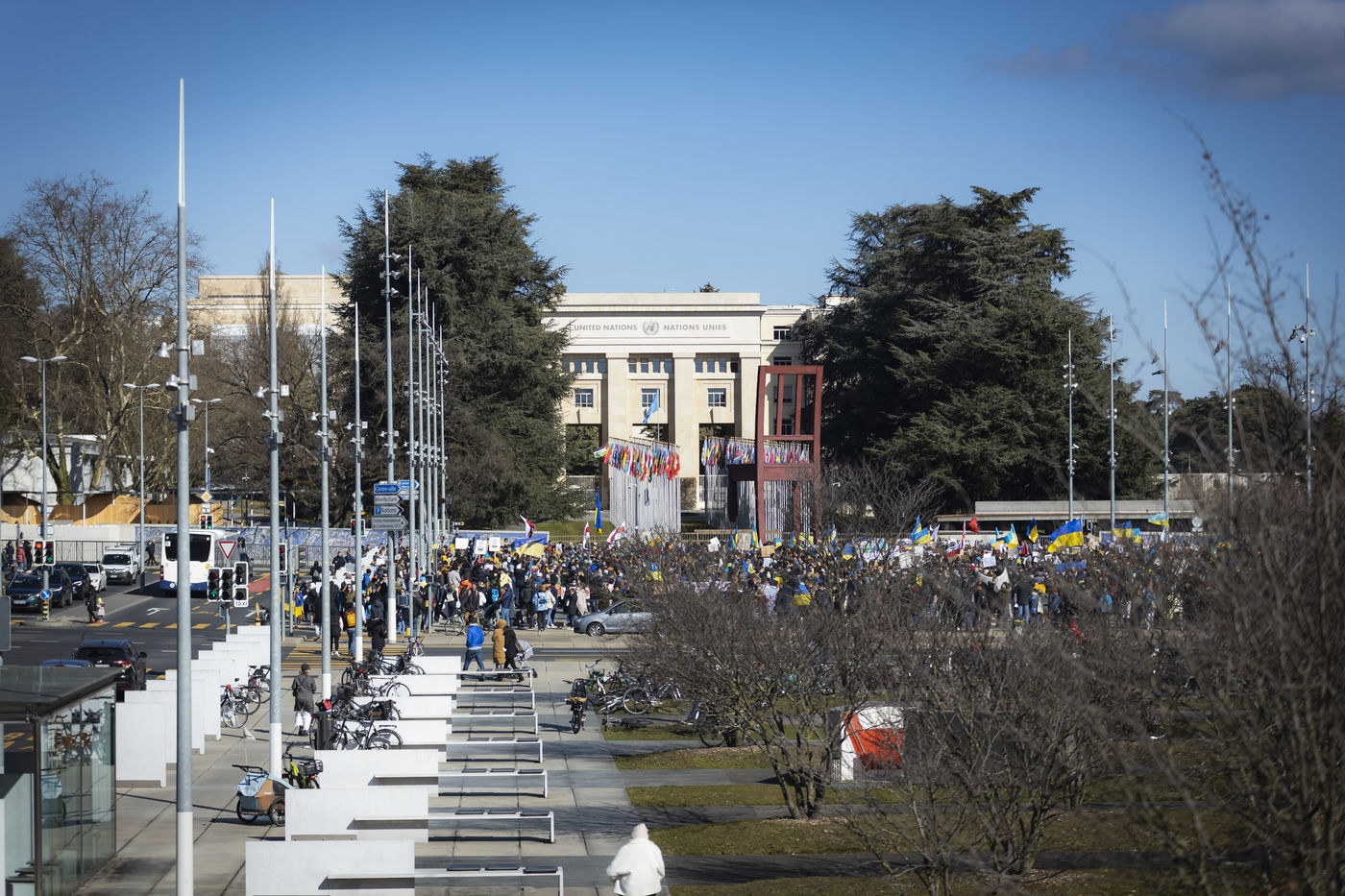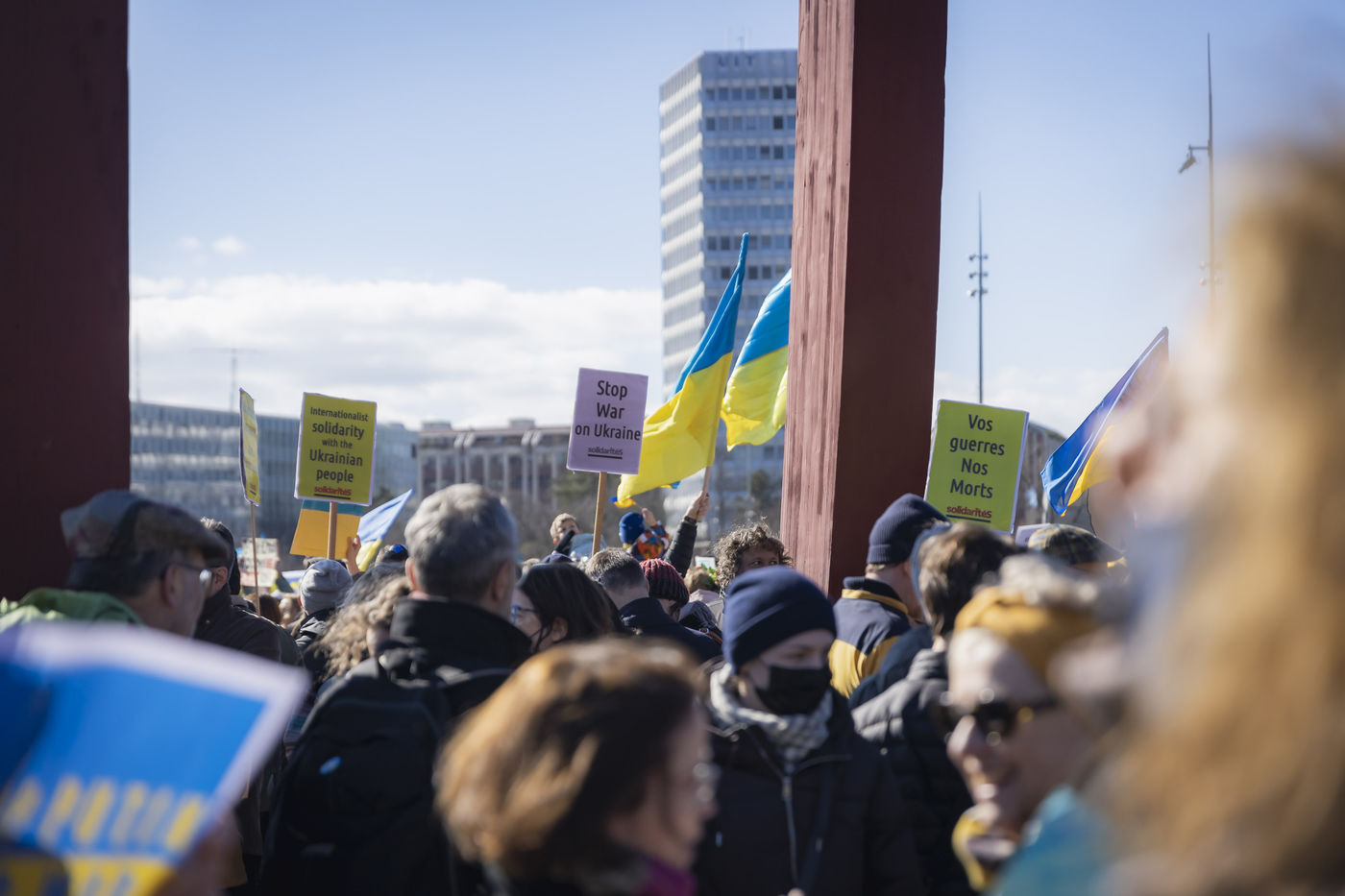 Switzerland, Geneva, 2022-02-26. More than a thousand people gathered on the Place des Nations to protest against the war declared by Russia on Ukraine.