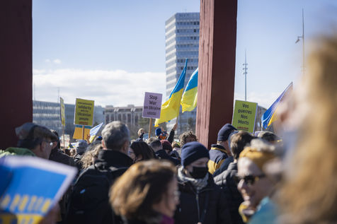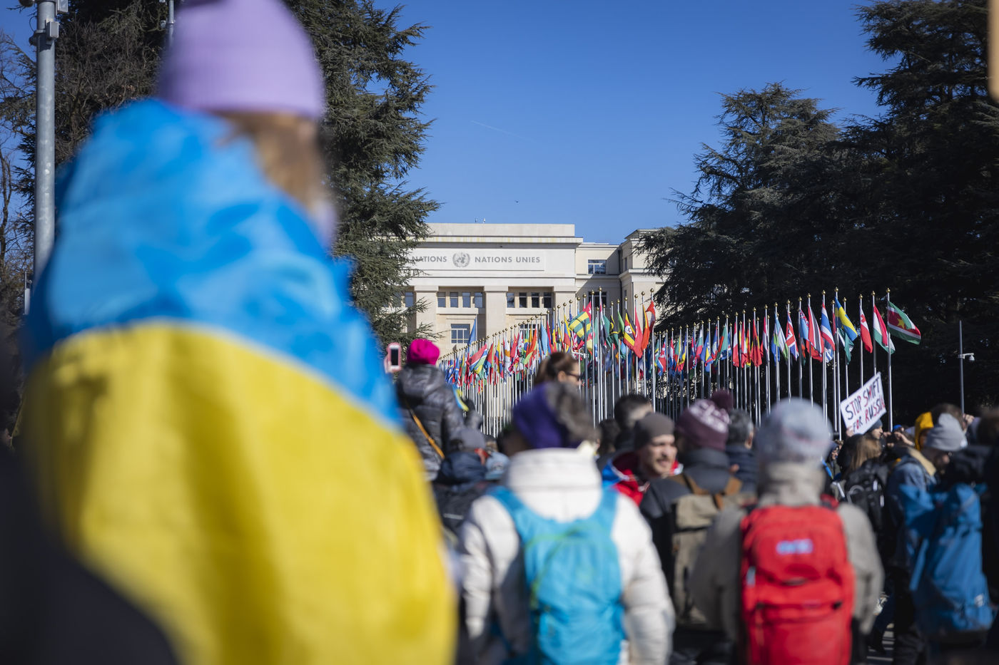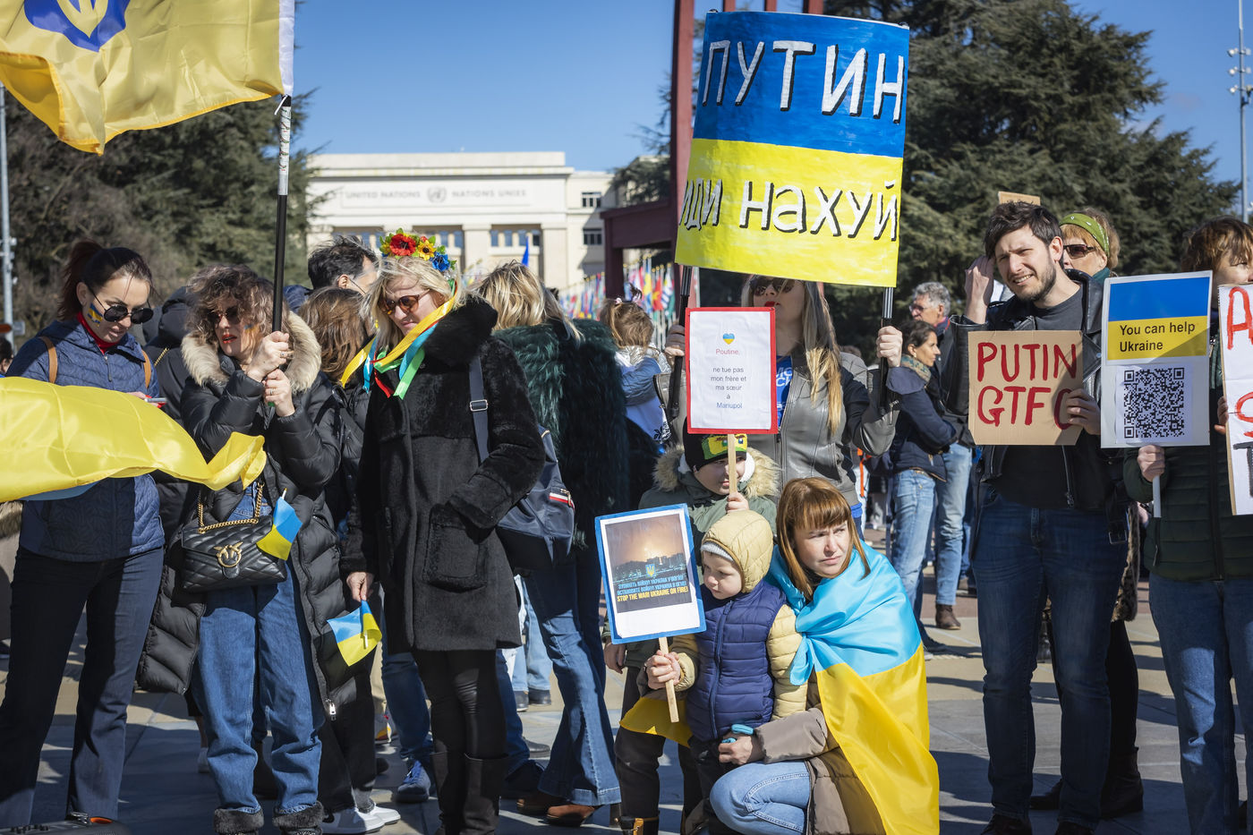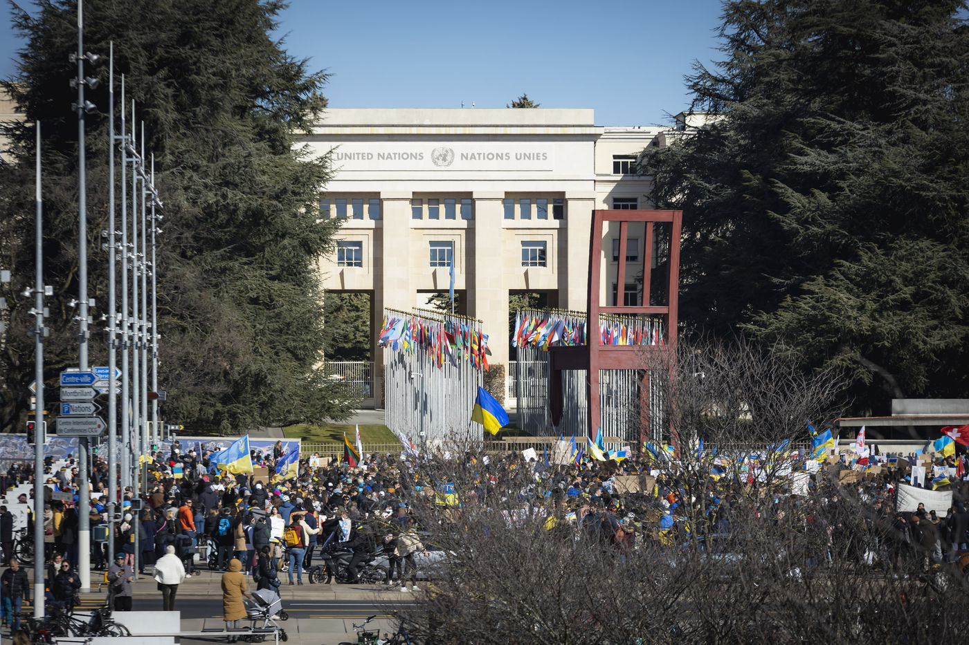 Switzerland, Geneva, 2022-02-26. More than a thousand people gathered on the Place des Nations to protest against the war declared by Russia on Ukraine.