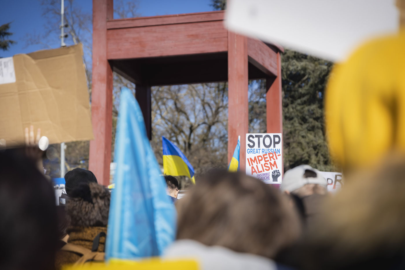 Suisse, Genève, 2022-02-26. Plus d?un millier de personne s?est réuni sur la place des nations pour militer contre la guerre qu'a declaré la Russie à l'Ukraine.