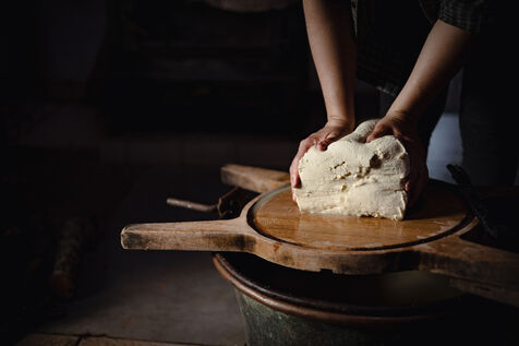 Claire then pours it into the copper cauldron that she places on a gas stove that she lights. There, she slightly increases the temperature and then she rennets it to make it curdle. A few minutes later, it is necessary to mix everything to break the curd into small grains which ends up agglomerating into a large firm ball. This ball is then cut to the size of the molds in which it will be distributed. These molds are then placed under a press until the evening or the next day, then salted and placed in the cellar where the refining will begin.