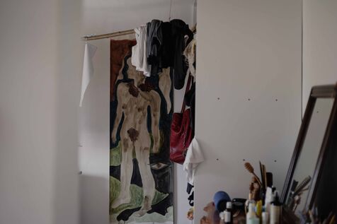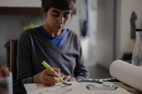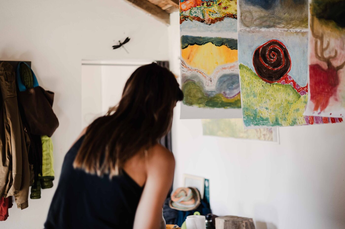 Lorsque l'on passe quelques heures avec Pyrénée, on la sent apaisée au milieu de ses brebis et quelques instants plus tard, comme un volcan en éruption devant ses feuilles de papier sur lesquelles elle peint à une vitesse incroyable, au rythme de ses visions, de ses rêves, de ses sensations.