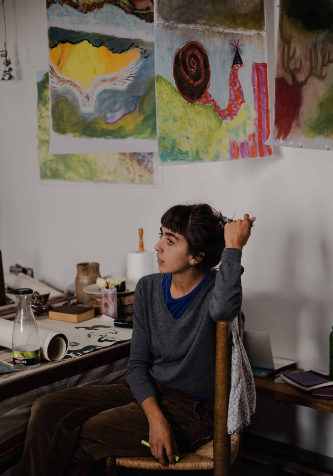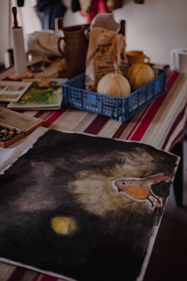 When you spend a few hours with Pyrénée, you feel her at peace among her sheep, and a few moments later, like a volcano erupting before her sheets of paper, on which she paints at incredible speed, in time with her visions, her dreams, her sensations.