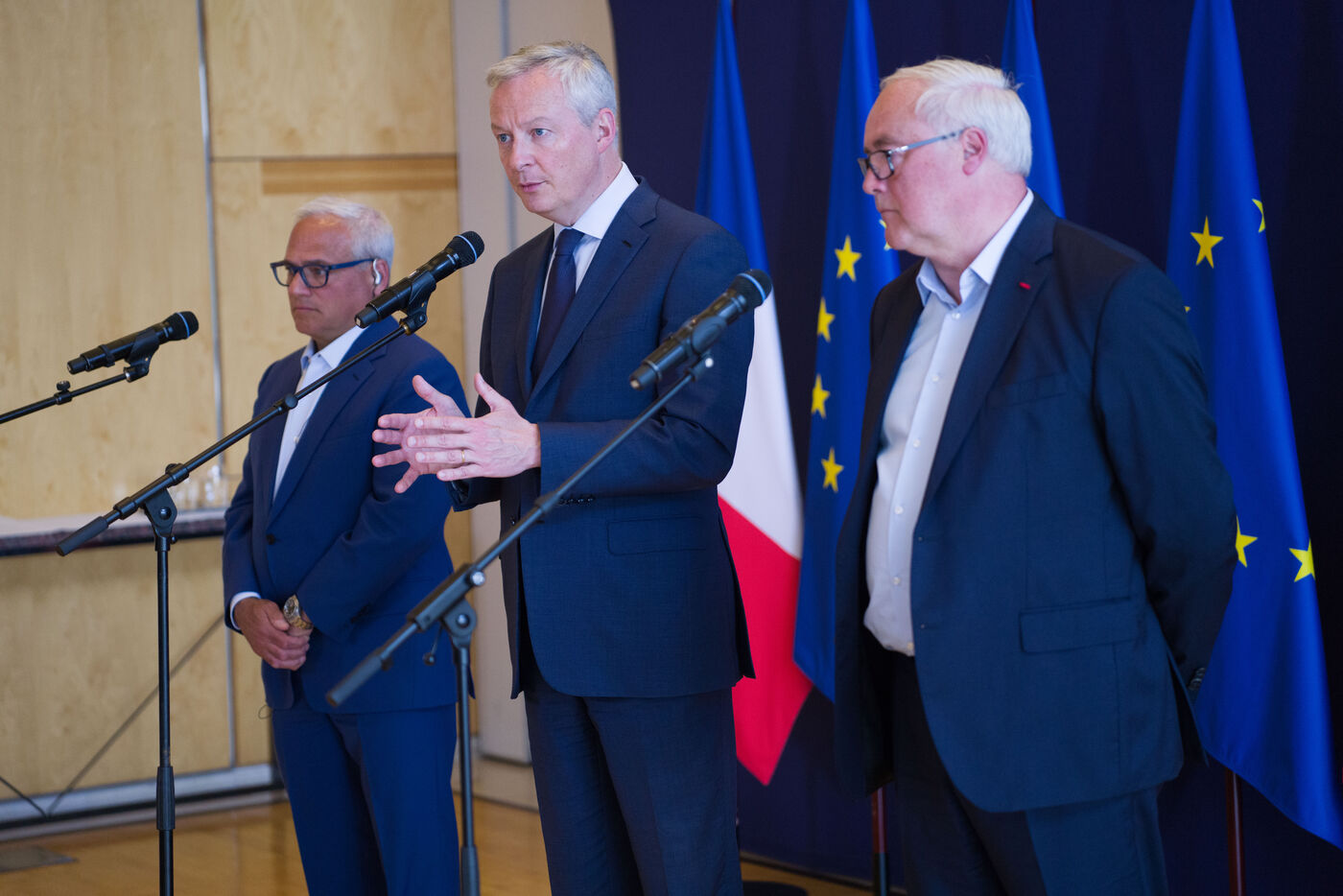 FRANCE - Bruno Le Maire annonce le début de la production de la méga-usine de semi-conducteurs portée par GlobalFoundries et STMicroelectronics à Crolles et signe le contrat d?aide de l?Etat au projet