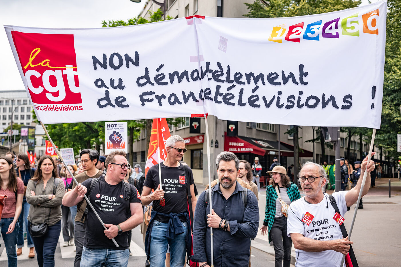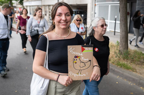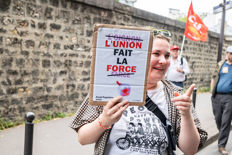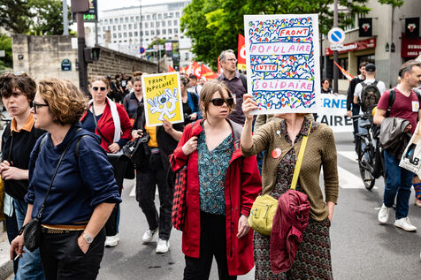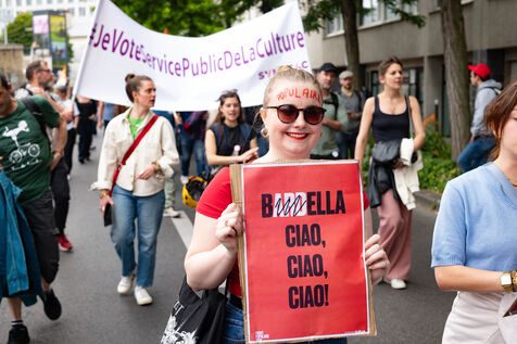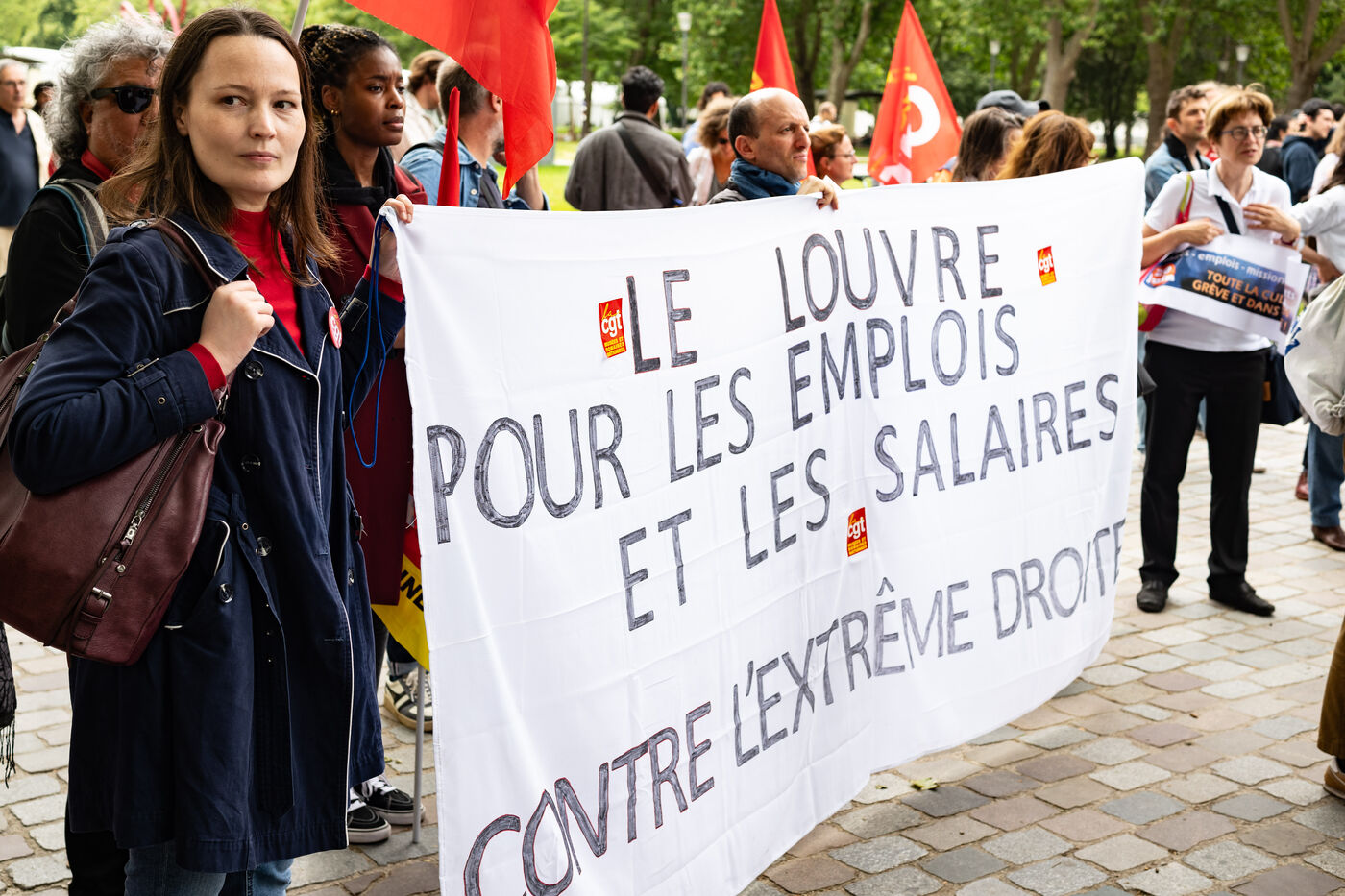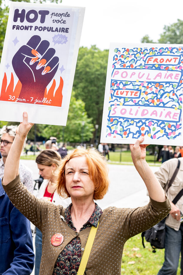 FRANCE - Paris 20 juin 2024 . Manifestation pour une culture independante avec des moyens et contre l extreme droite en france.une femme tient une pancarte contre les medias Bollore. Photographie Clement Martin