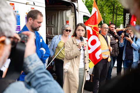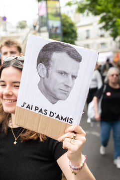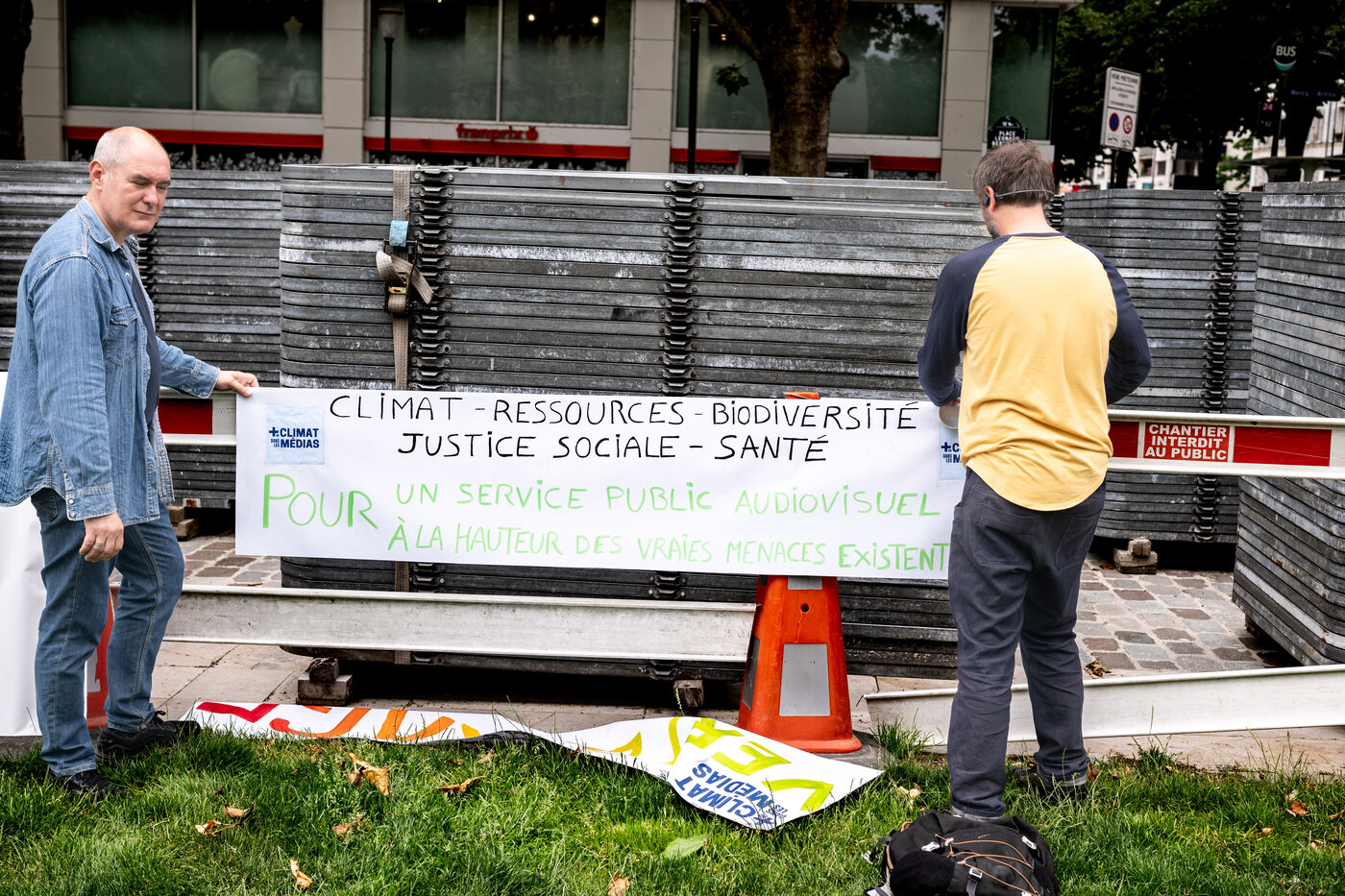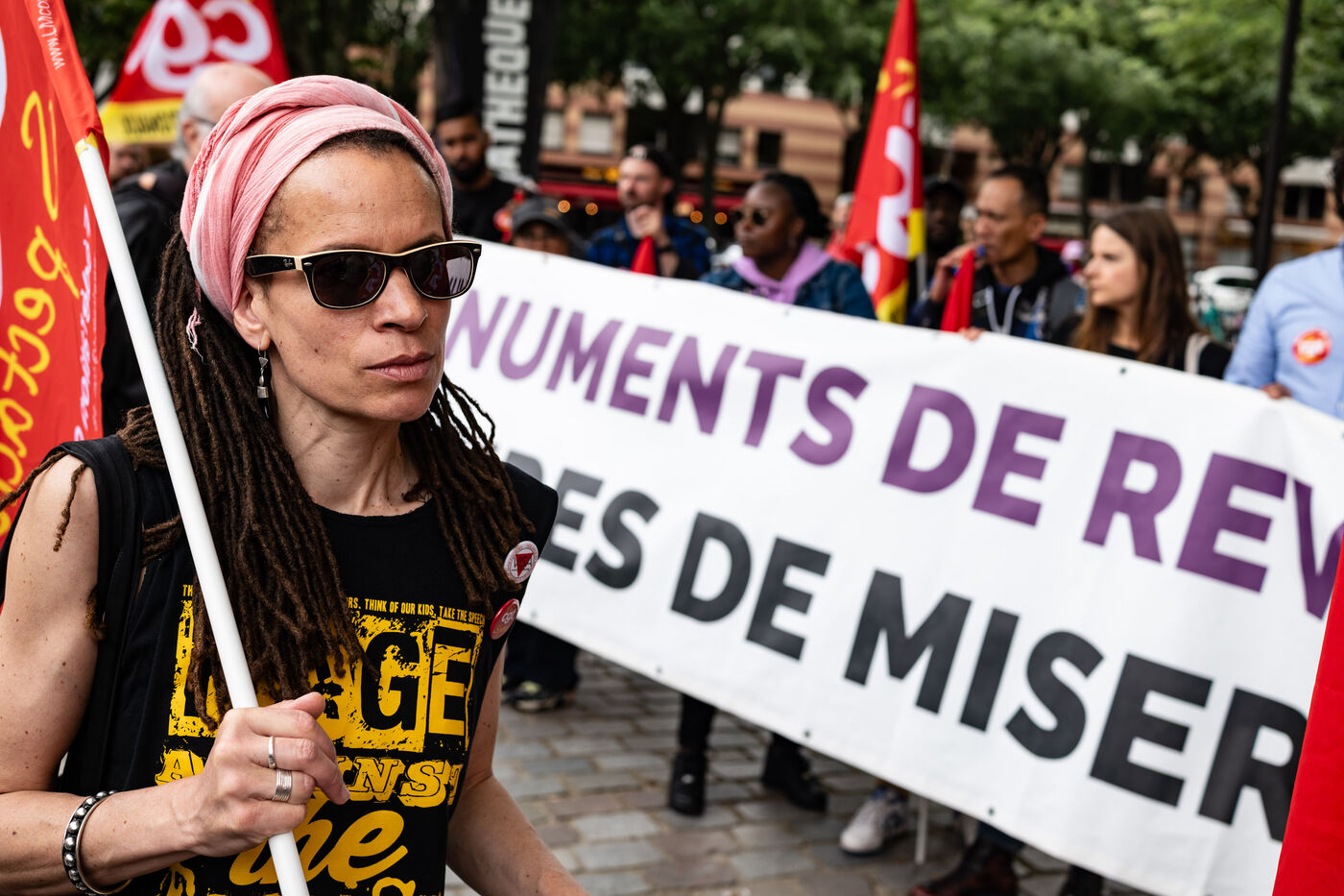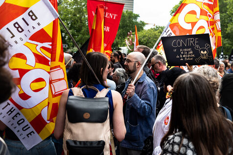 FRANCE - Paris 20 juin 2024 . Manifestation pour une culture independante avec des moyens et contre l extreme droite en france.une femme tient une pancarte contre les medias Bollore. Photographie Clement Martin