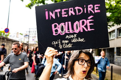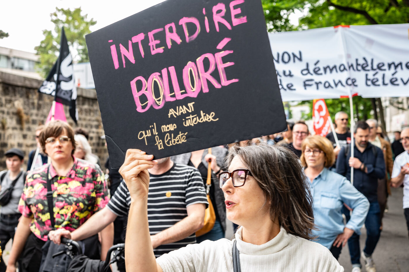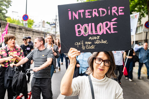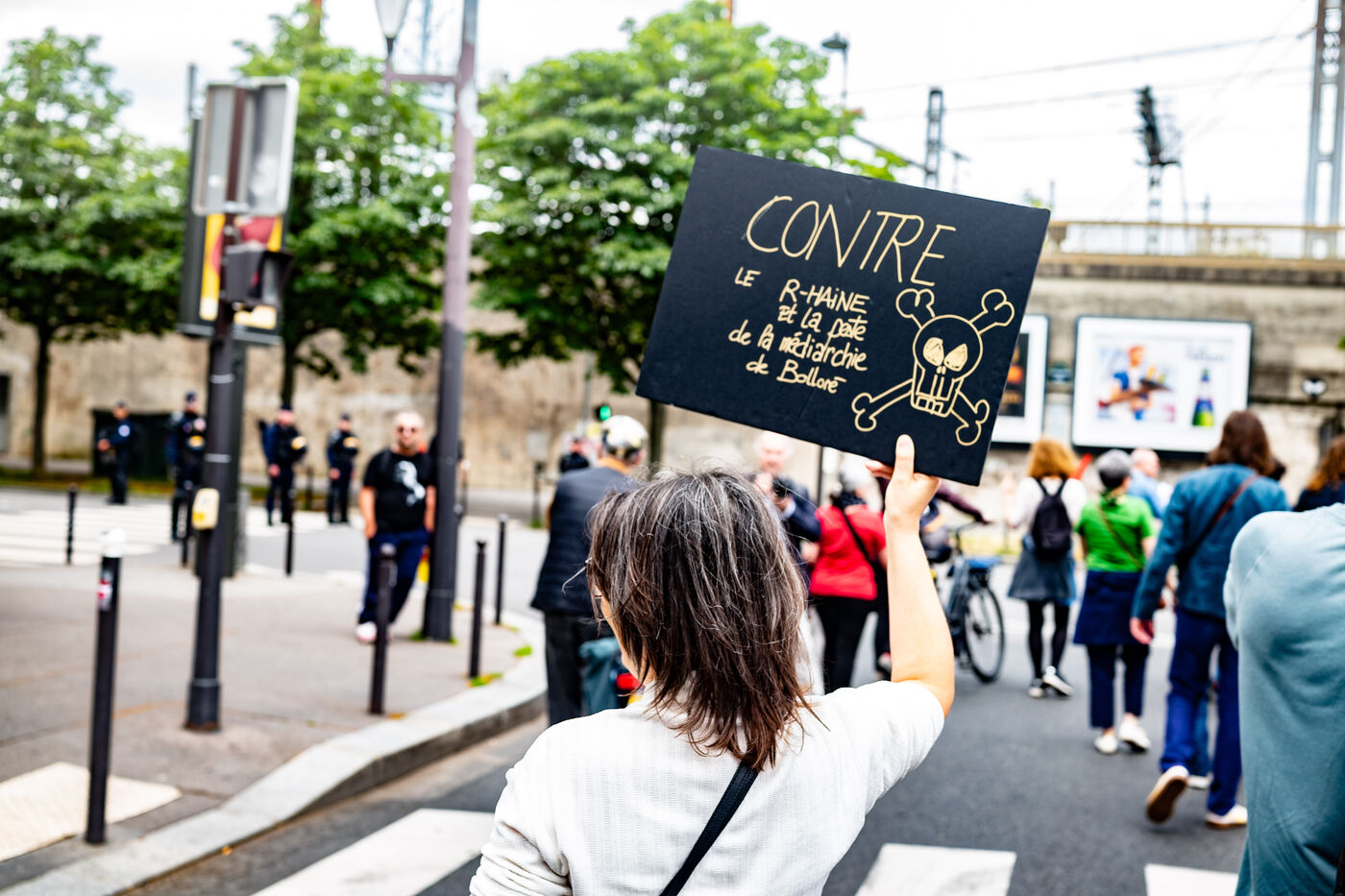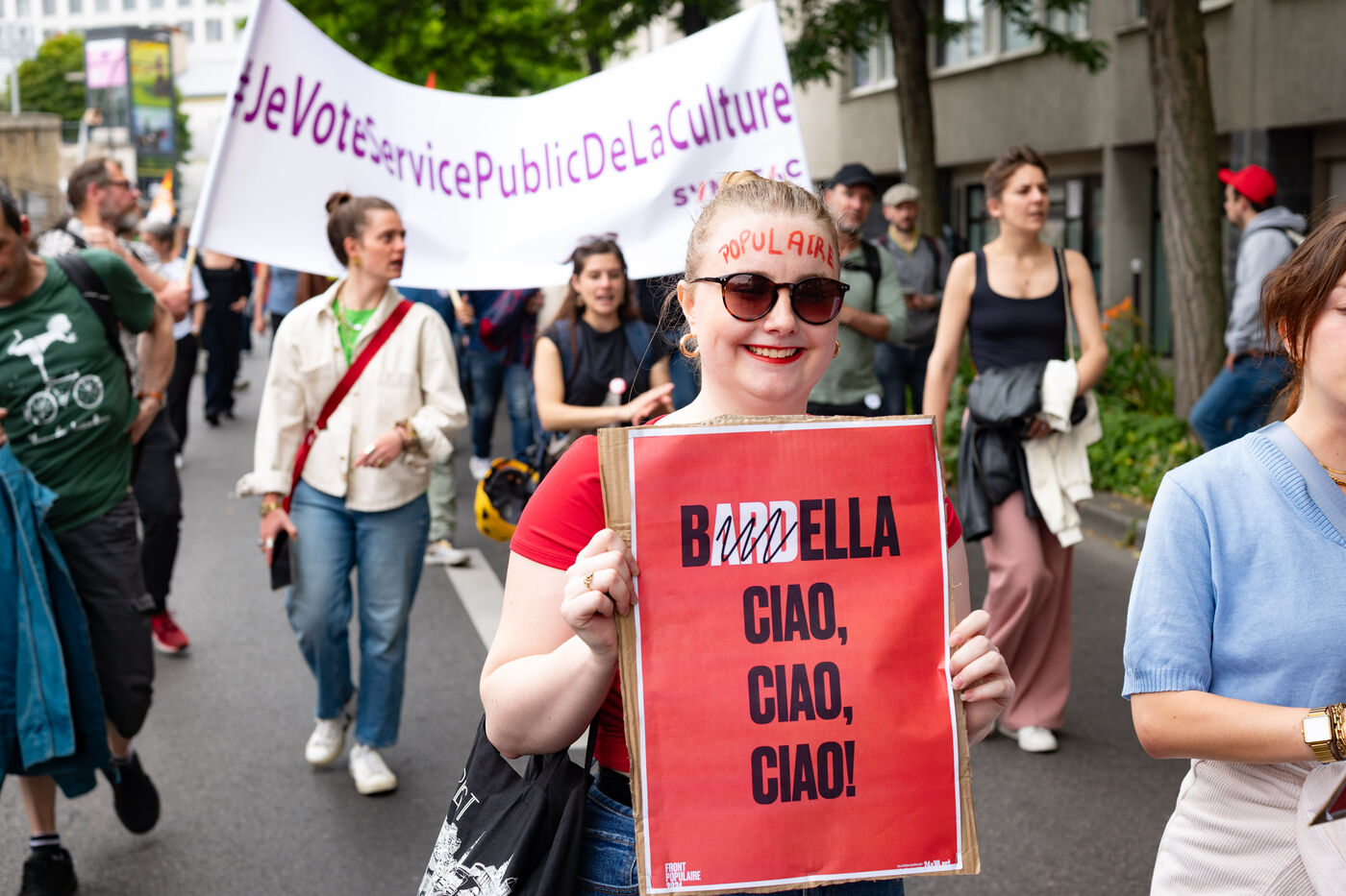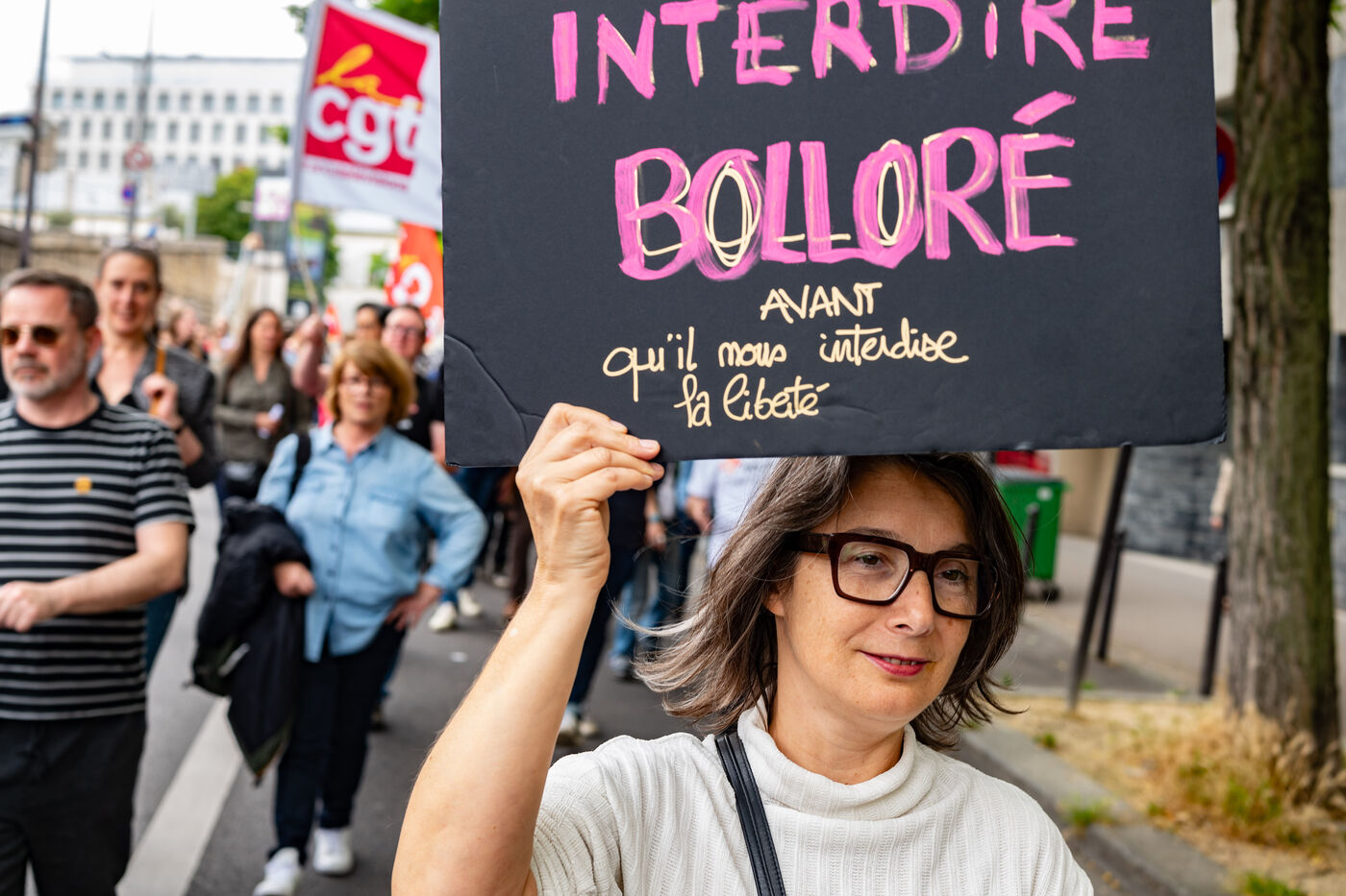Paris 20 juin 2024 . Manifestation pour une culture independante avec des moyens et contre l extreme droite en france.une femme tient une pancarte contre les medias Bollore. Photographie Clement Martin