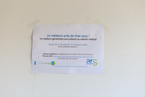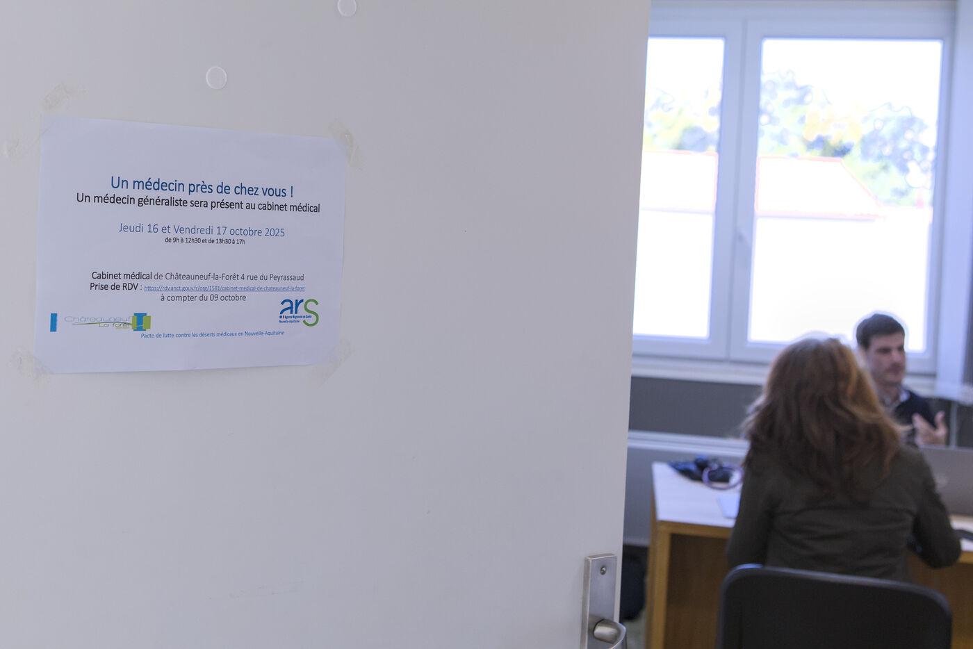 On 16 October 2025, in Châteauneuf-La-Forêt, a village in Haute-Vienne, Nouvelle-Aquitaine, the first consultation with a volunteer doctor, Maxime Vidal, took place. Organised by the Regional Health Agency (ARS), this voluntary initiative is part of a government process aimed at combating medical deserts. Many people rushed to come for consultations. Some of them had not seen a doctor in years. On the day of the inauguration of this programm, many prominent figures and institutions were present: the director of the ARS (Olivier Thenaille), the Mayor of the village (Françoise Rivet), the President of the Haute-Vienne Medical Association (Thierry Boëly), the District Administrator of Haute-Vienne (François Pesneau), the Director of the Haute-Vienne Primary Health Insurance Fund (CPAM) (Aymeric Seguinot), the Coordinator of the Territorial Professional Health Community (CPTS) (Armel Rabot) and the doctor from La Croizille-sur-Briance (Marie Debord).