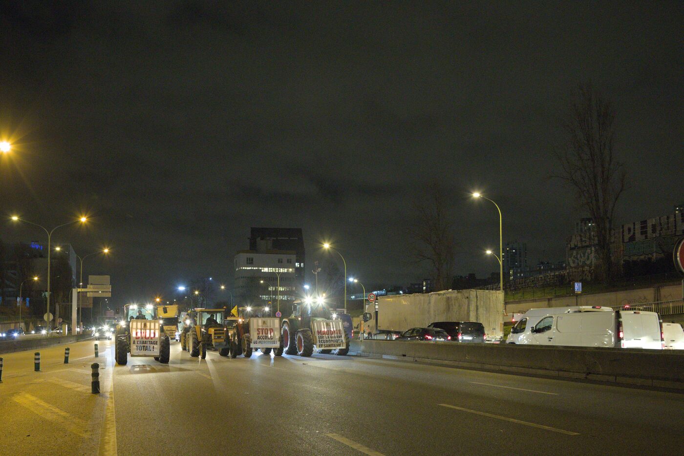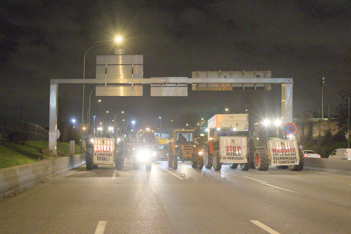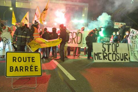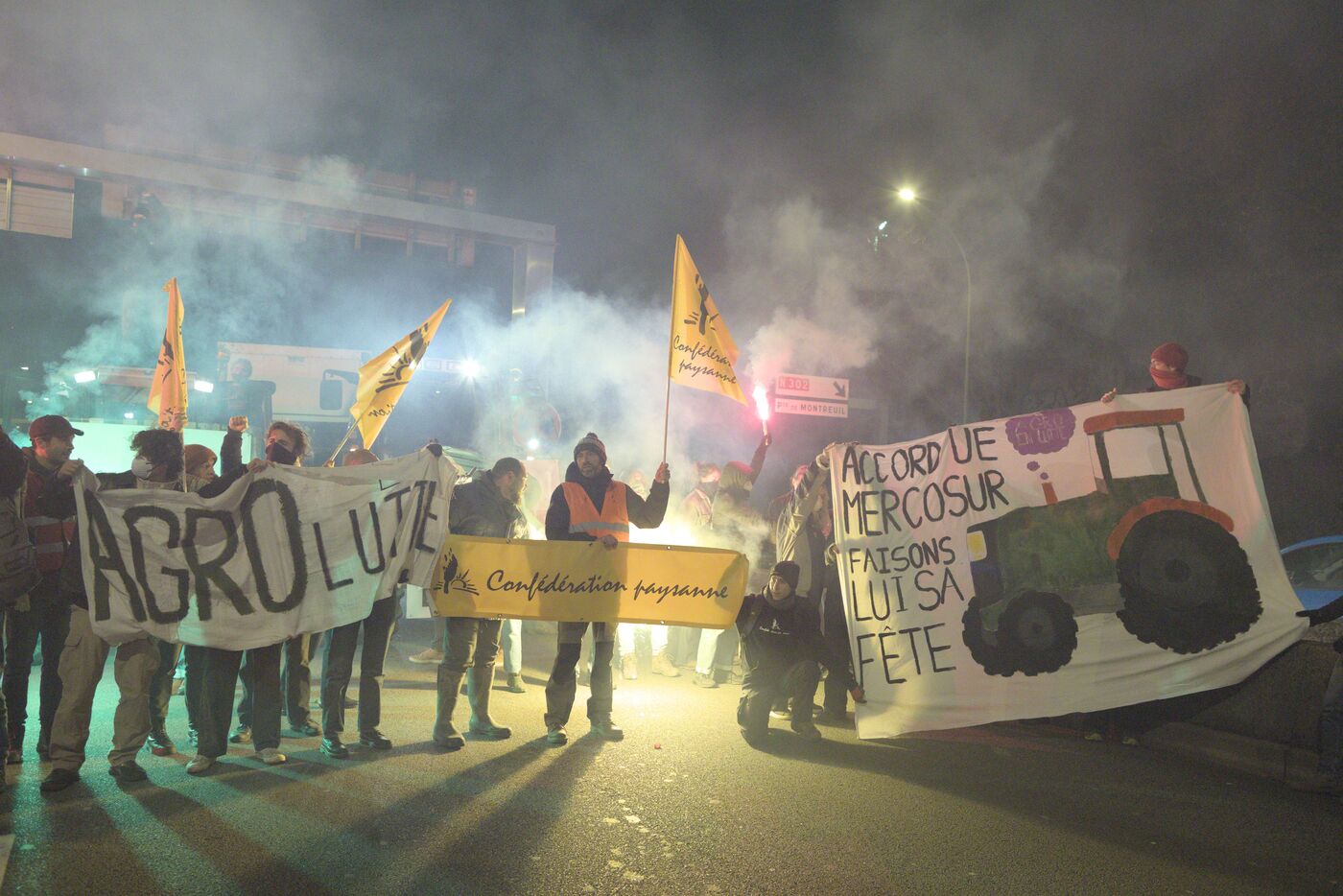 Le 9 janvier 2026, une centaine de militants de la Confédération paysanne, des Soulèvements de la Terre, de Cancer Colère, d'Agro en Lutte, de la CGT Paris ont bloqué et occupé le périphérique parisien, Porte de Montreuil. Une opération escargot a ensuite démarré avec six tracteurs jusqu'à la porte Maillot où la police a décidé de bloquer le convoi. Cette action visait à dénoncer la politique scandaleuse de la dermatose nodulaire contagieuse (DNC) par le gouvernement et l'accord commercial entre l'UE et le Mercosur. Lorsqu'un cas de DNC est détecté dans un troupeau, le protocole oblige l'abattage total du troupeau, ce qui pour le syndicat est abusif et inutile. Et il estime que l'accord UE Mercosur accentuera la paupérisation de la paysannerie et accélèrera son déclin. A noter que ce jour là, deux des porte-paroles de la Confédération paysanne, Thomas Gibert et Stéphane Gallais, ont été mis en garde à vue. Ils attendaient avec une cinquantaine de personnes, place de l'Etoile, à Paris, l'arrivée du convoi des tracteurs.