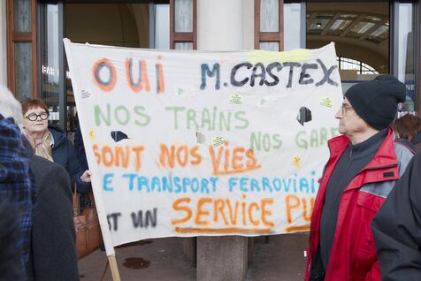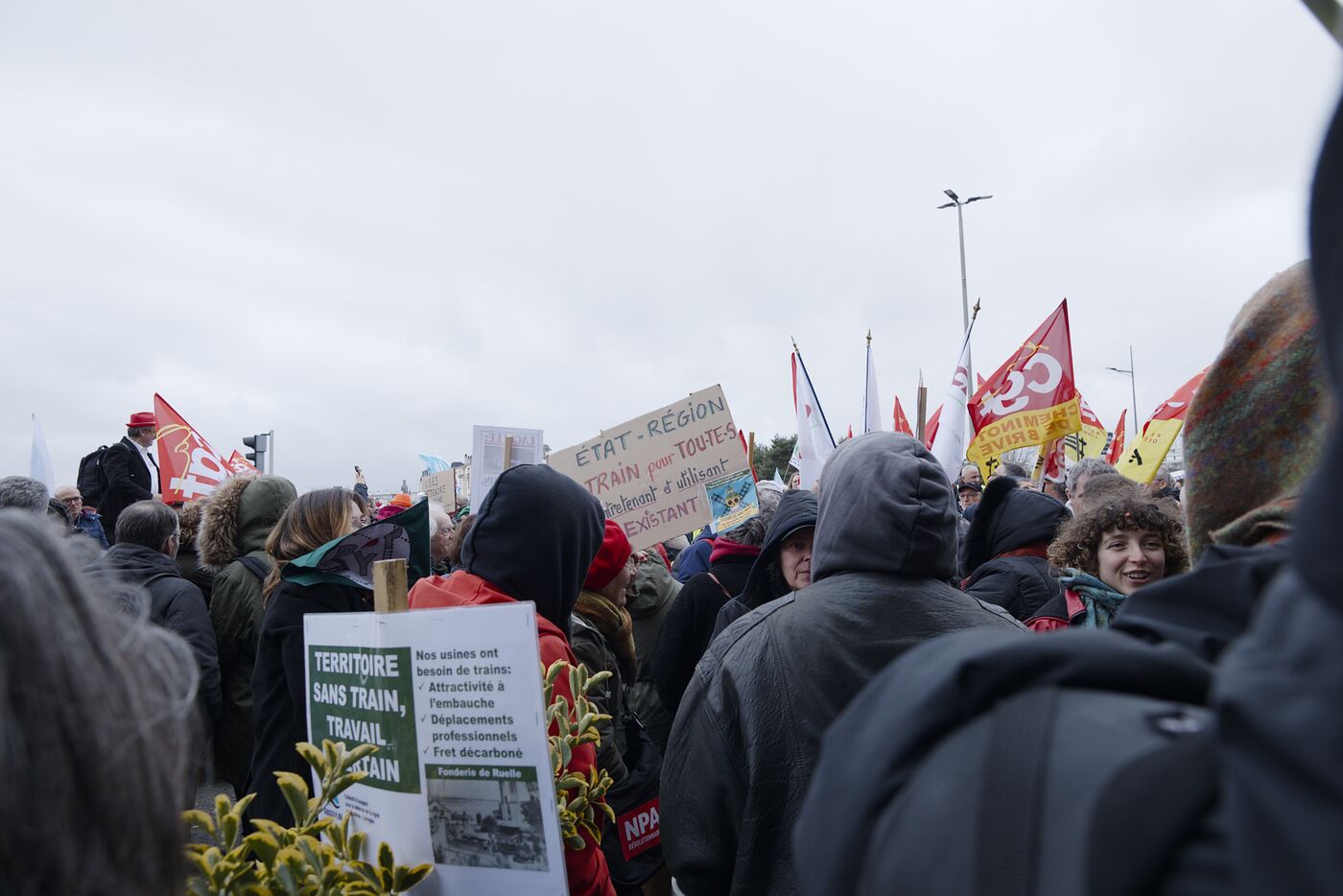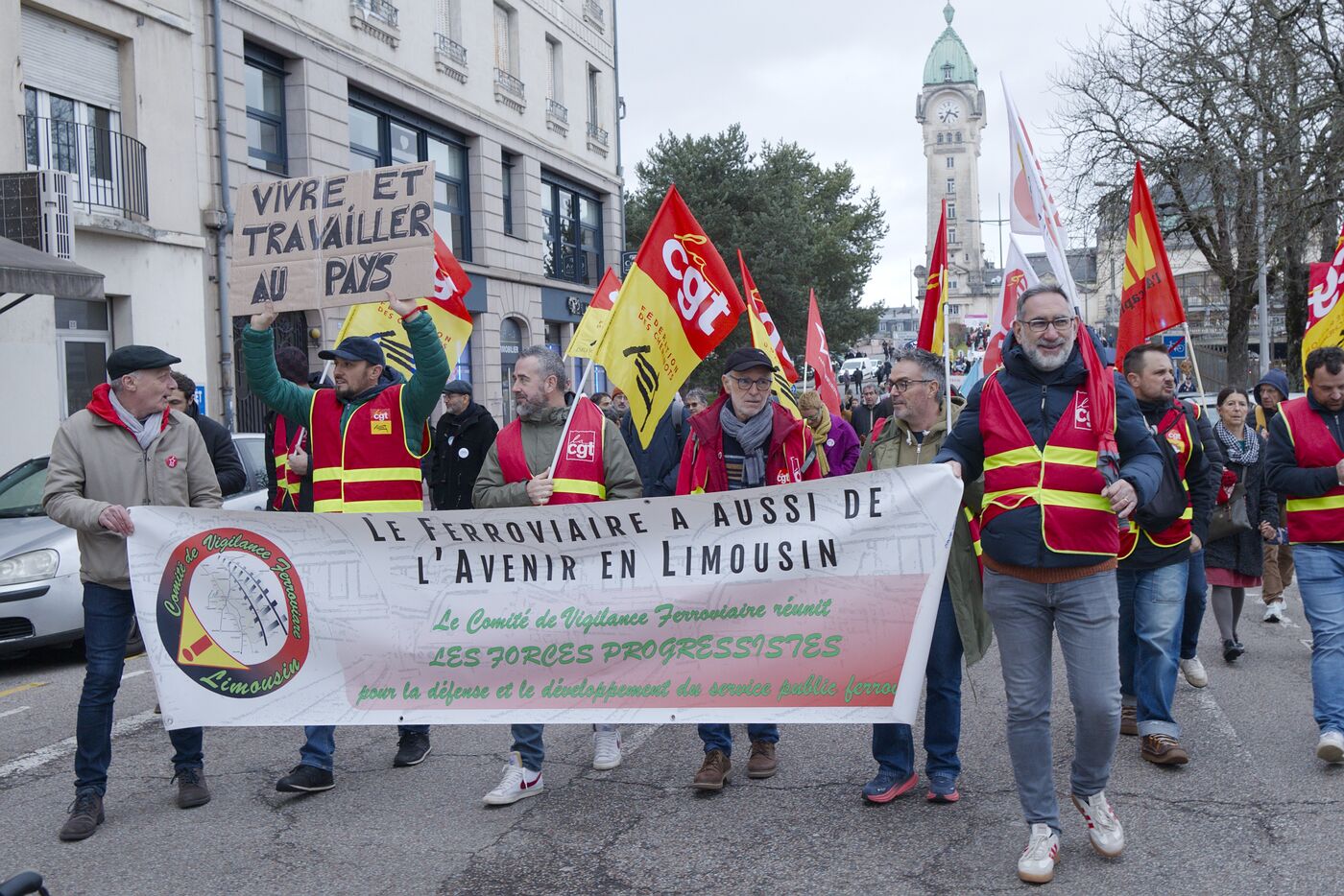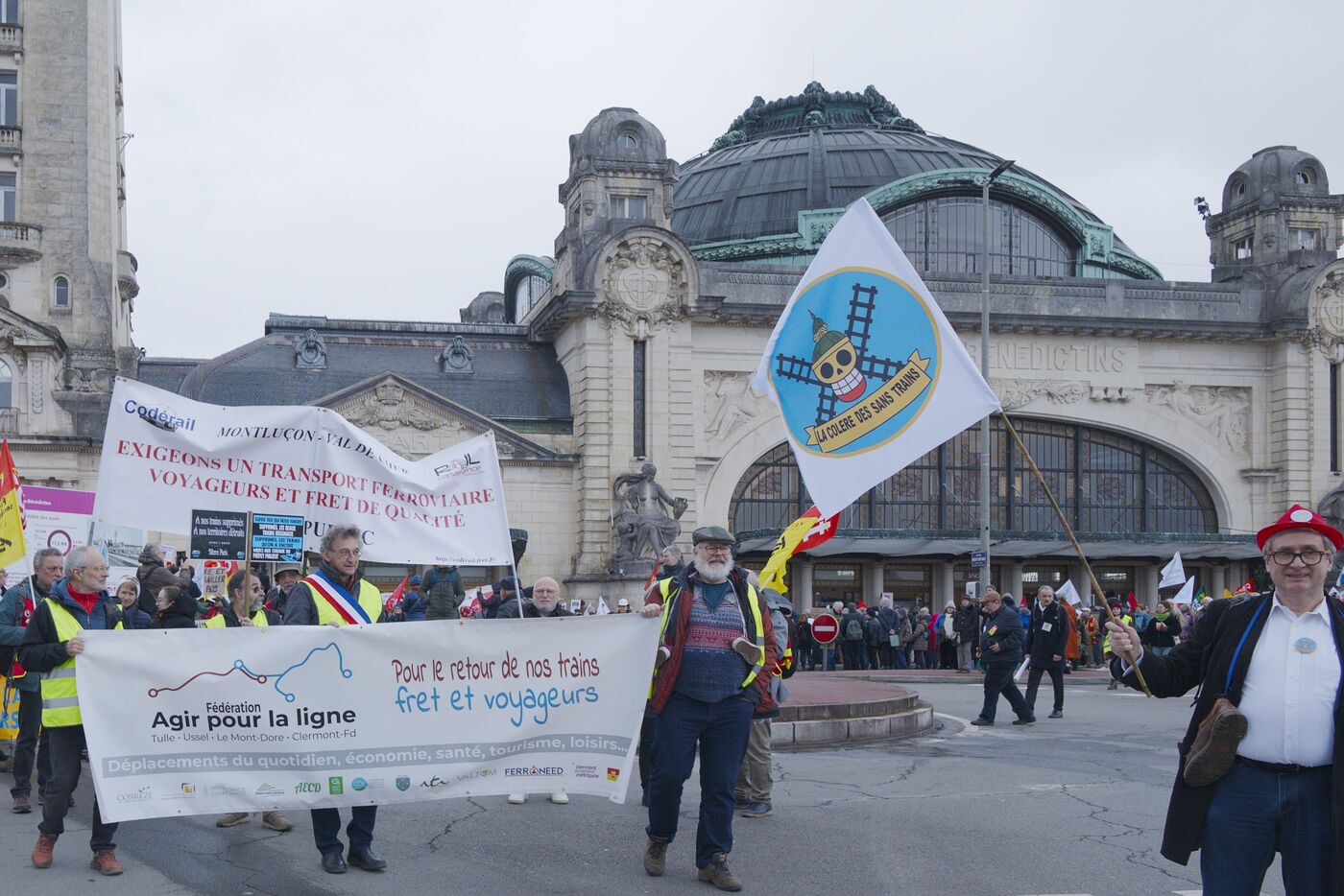 Sous la bannière "la colère des sans-trains", 800 personnes de Nouvelle-Aquitaine, d'Auvergne et d'Occitanie se sont rassemblées pour dénoncer le manque d investissement dans les trains régionaux et la fermeture de lignes et de gares devant la Gare des Bénédictins, à Limoges, le 31 janvier 2026. 36 associations et collectifs d’usagers du train avaient appelé à ce rassemblement comme BOPSYL qui défend la ligne Brive-Objat-Pompadour-Saint-Yrieix-Limoges, le Comité pluraliste de défense de la ligne Aurillac-Bretenoux / Biars-Brive, le Collectif Aurail, ou encore Angoulim qui défend la ligne Angoulême Limoges fermé en 2018 pour sa partie charentaise. Étaient aussi présents dans le cortège de très nombreux élus, des maires, des députés, des conseillers régionaux comme par exemple les trois députés NFP de la Haute-Vienne (Manon Meunier, Damien Maudet et Stéphane Delautrette) ou encore la Présidente du Conseil départemental de la Creuse (Valérie Simone), le Président de l'agglo de Guéret (Eric Correia), les maires de Guéret, Felletin, Faux-la-Montagne, etc.