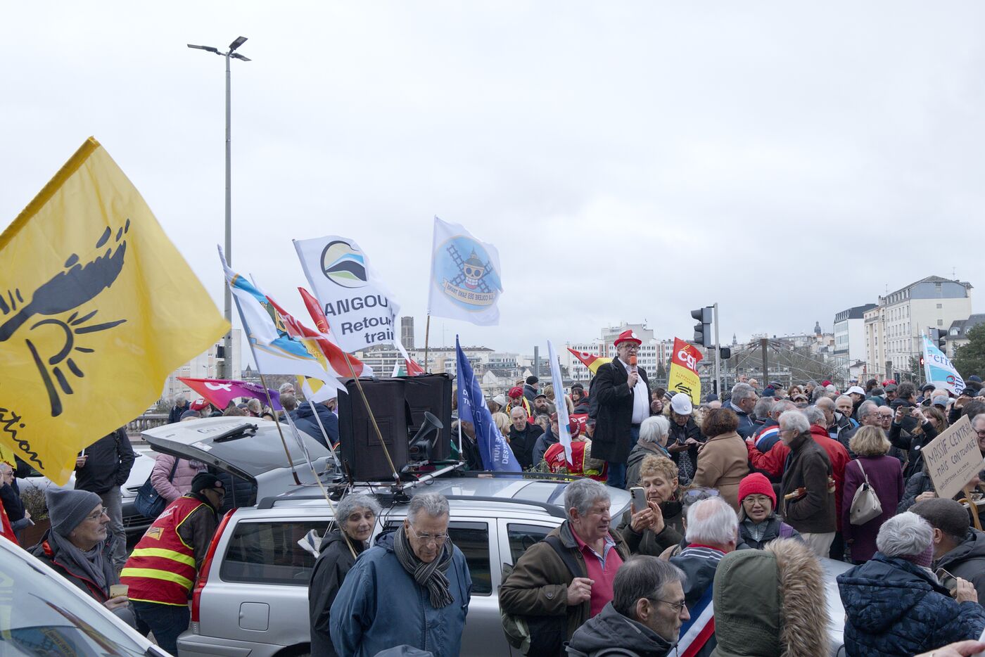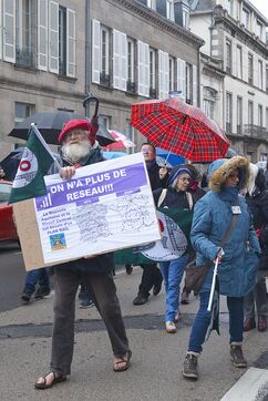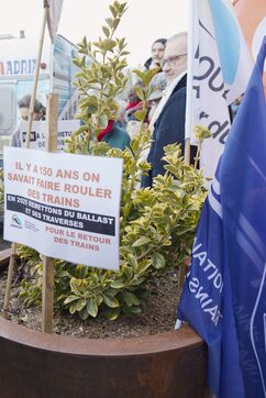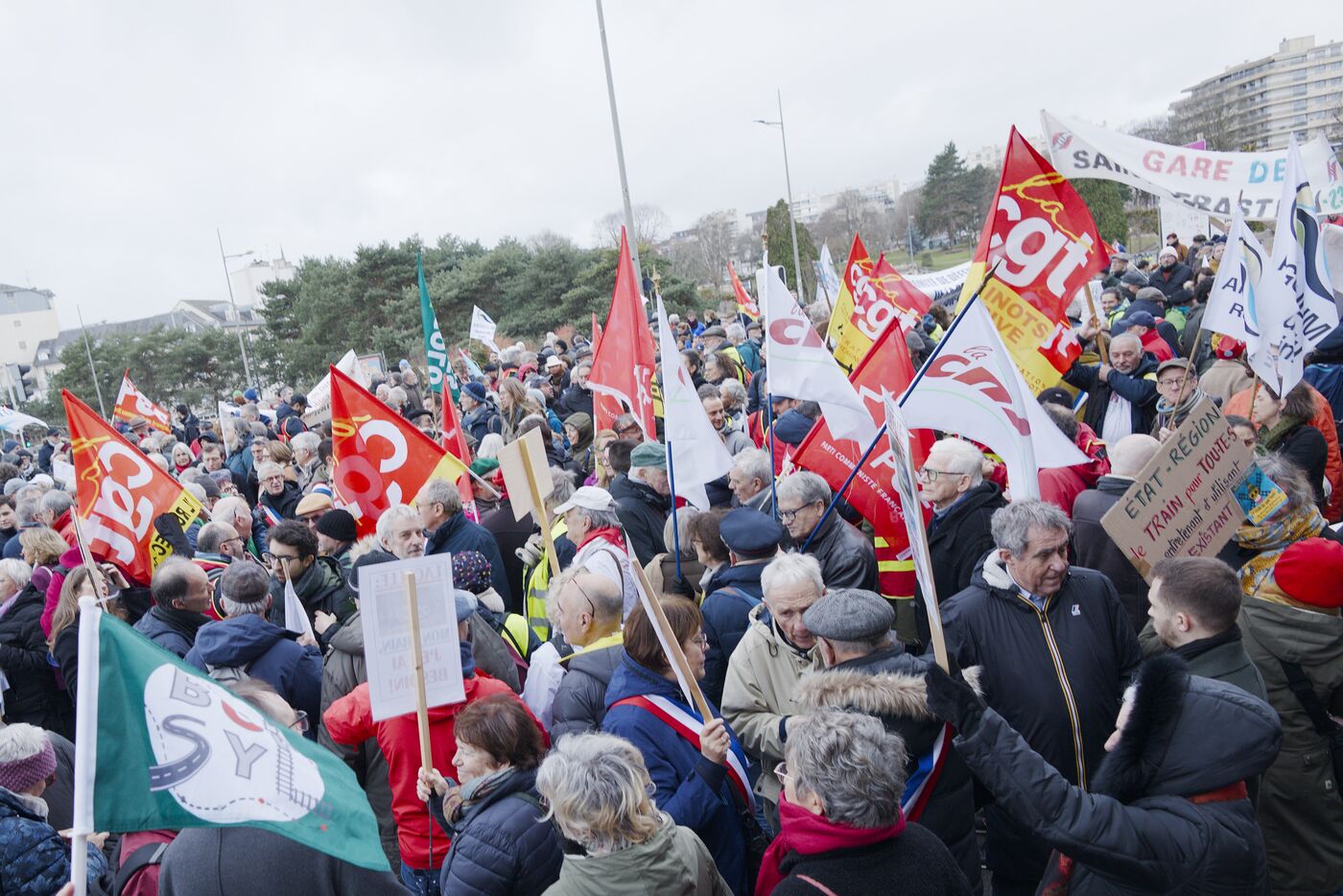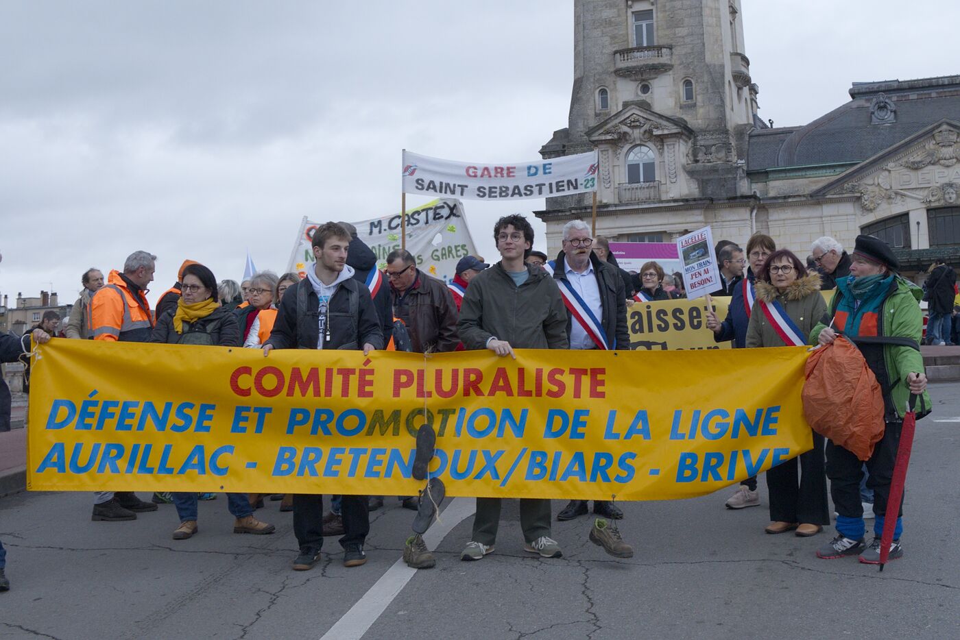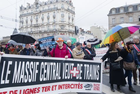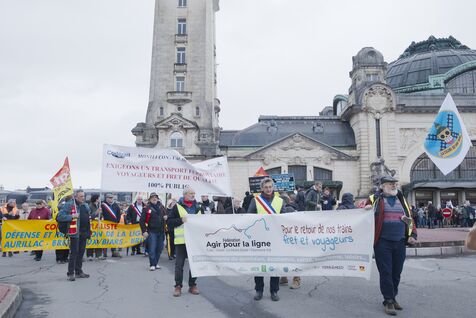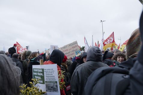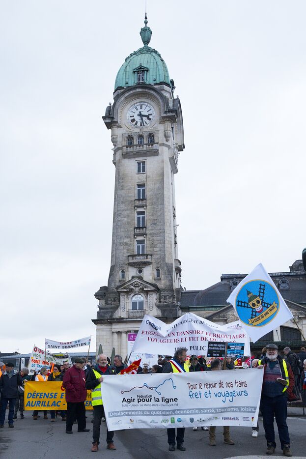 Under the banner "The anger of the trainless", 800 people from Nouvelle-Aquitaine, Auvergne and Occitanie gathered in front of the Gare des Benedictins train station to denounce the lack of investment in regional trains and the closure of lines and stations, in Limoges on January 31 2026. Thirty-six train user associations and collectives called to protest, including BOPSYL, which defends the Brive-Objat-Pompadour-Saint-Yrieix-Limoges line, the Pluralist Committee for the Defense of the Aurillac-Bretenoux/Biars-Brive line, the Collectif Aurail, and Angoulim, which defends the Angoulême-Limoges line. Also present in the cortege were numerous elected officials, mayors, deputies, and regional councilors, such as the three NFP deputies from Haute-Vienne (Manon Meunier, Damien Maudet, and Stéphane Delautrette), as well as the President of the Creuse Departmental Council (Valérie Simonet), the President of the Guéret urban community (Eric Correia), and the mayors of Guéret, Felletin, Faux-la-Montagne, etc.