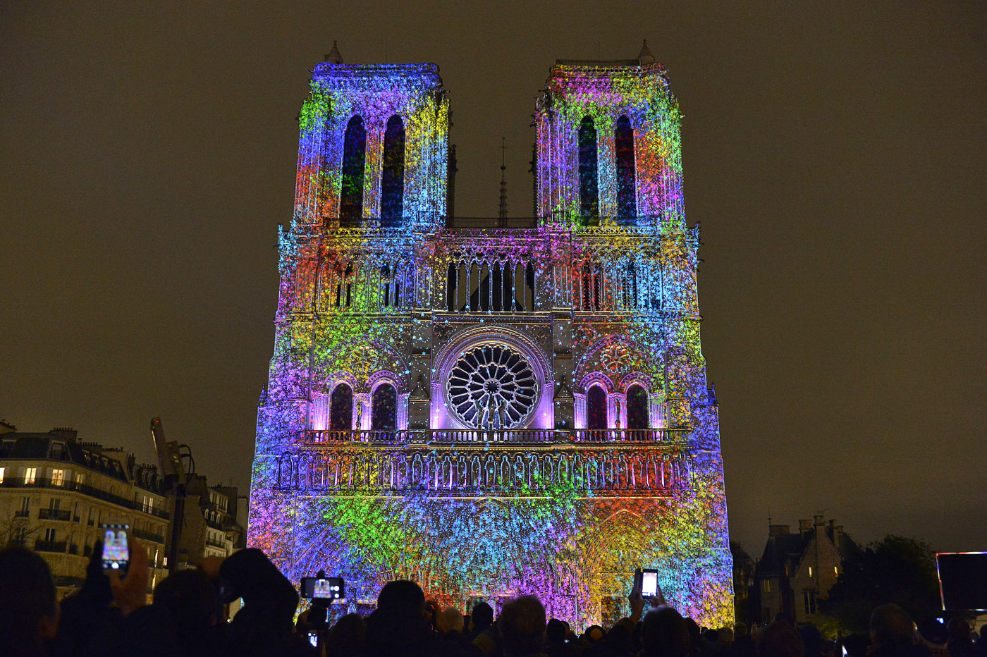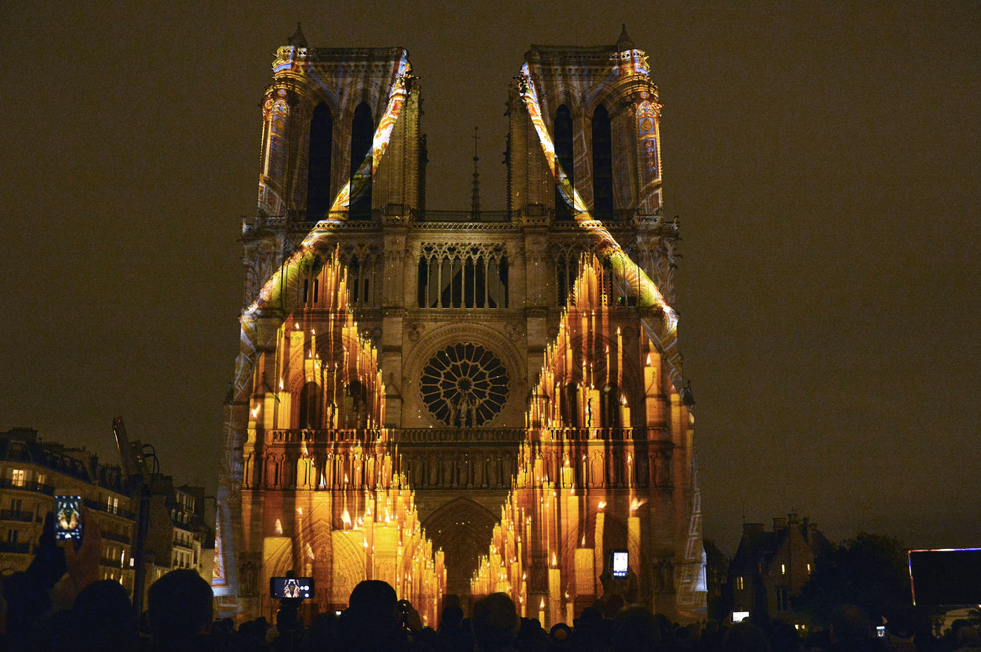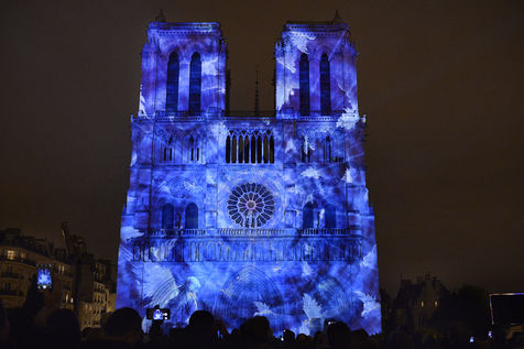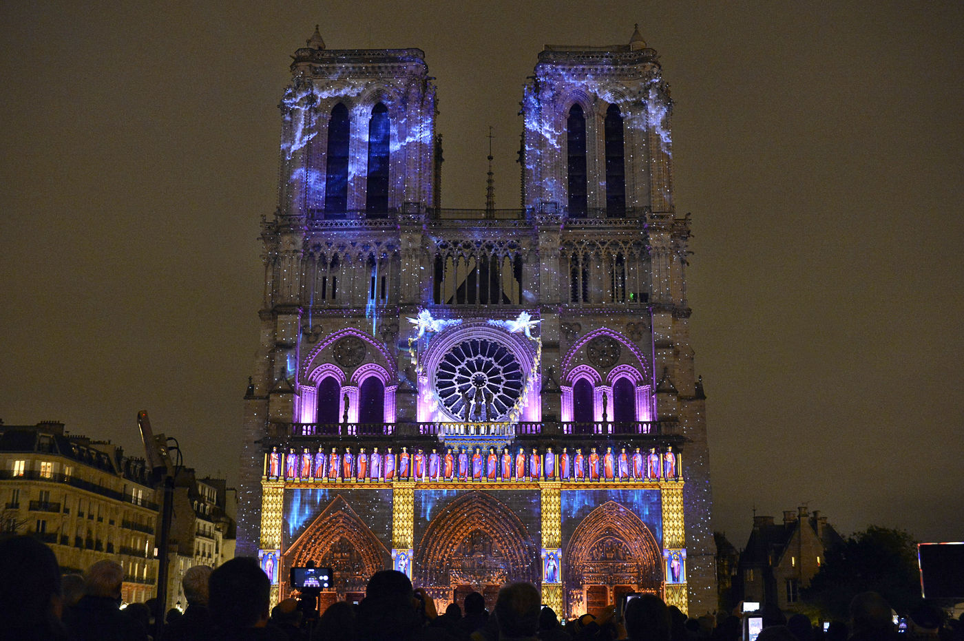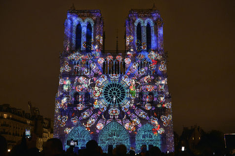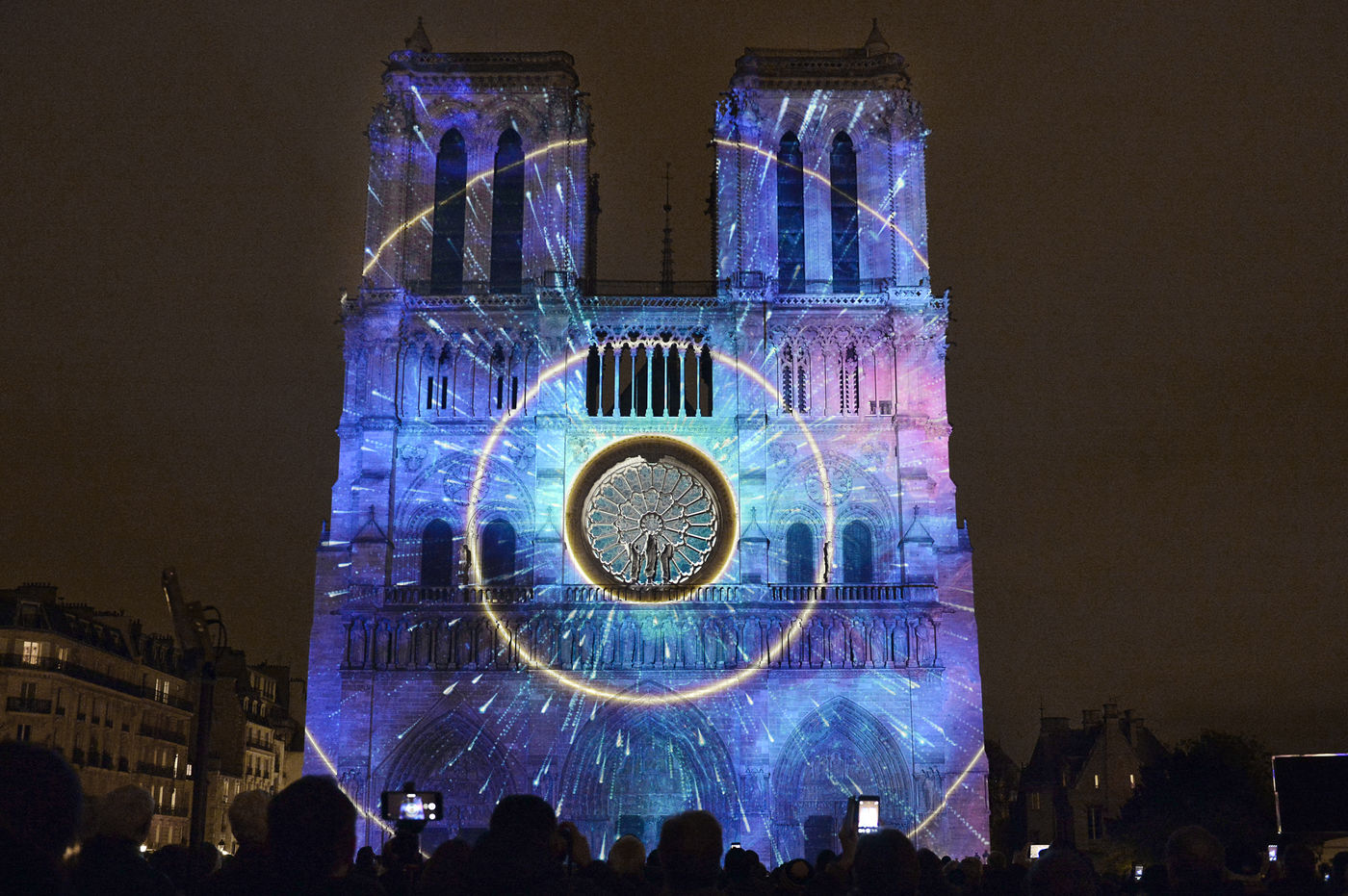The facade of Notre-Dame de Paris dresses up for a sound and light show.