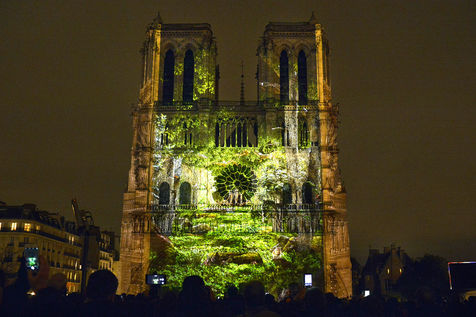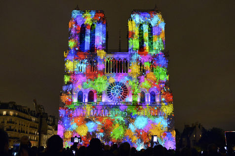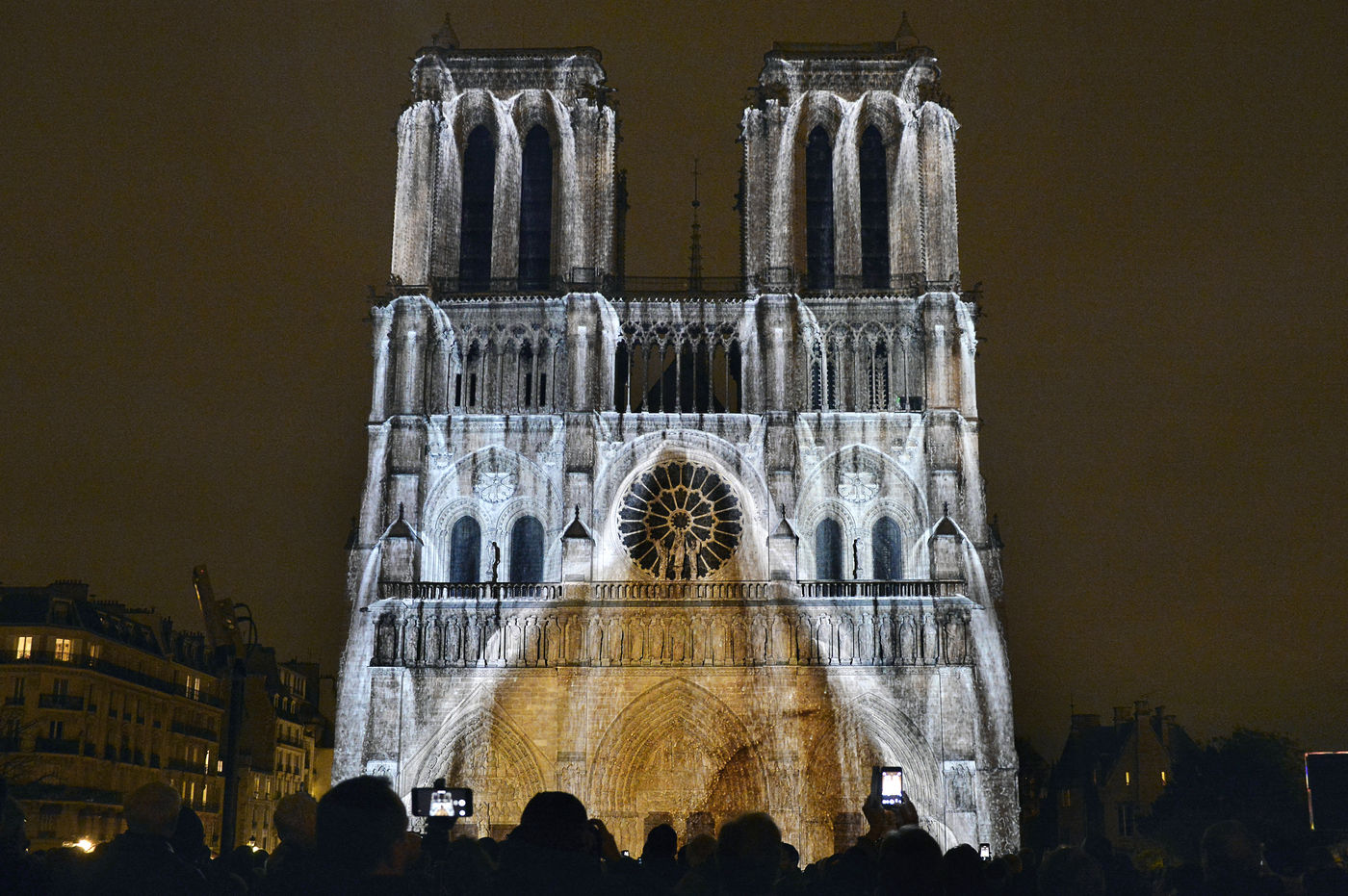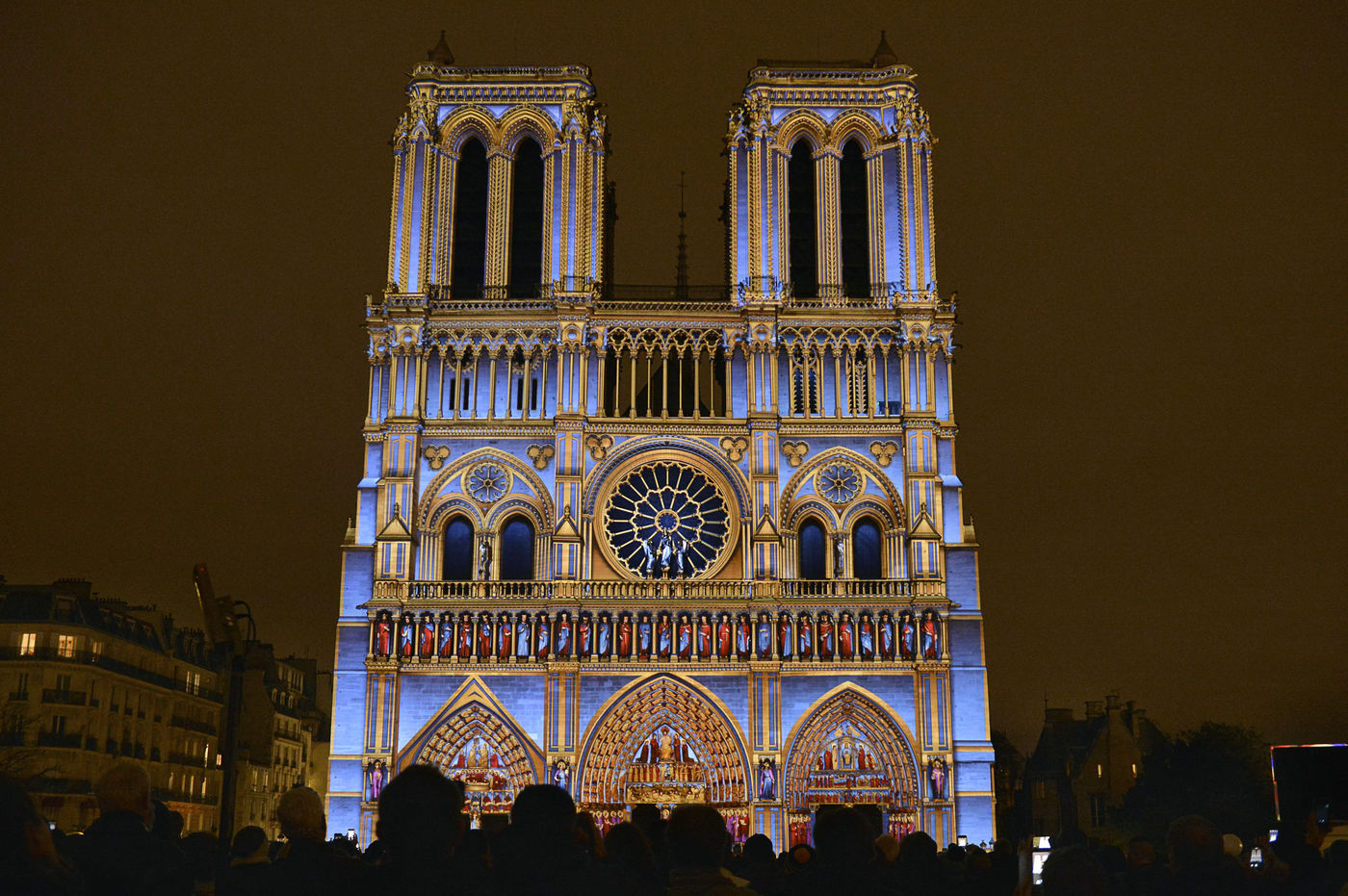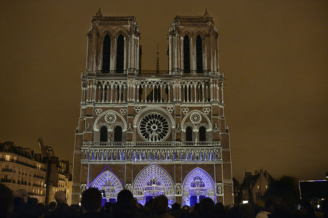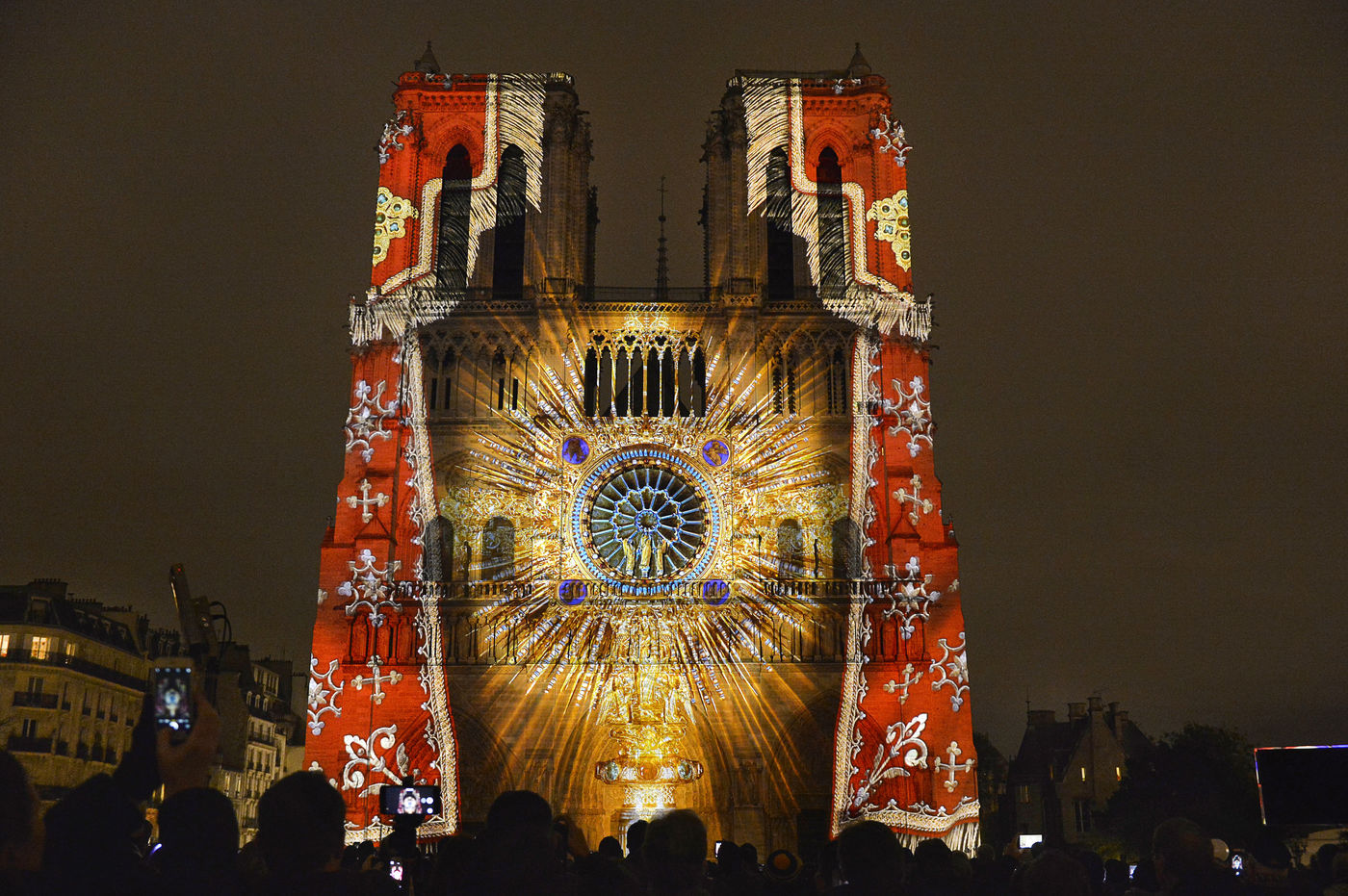 The facade of Notre-Dame de Paris dresses up for a sound and light show.