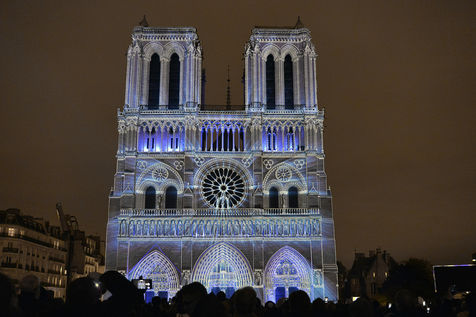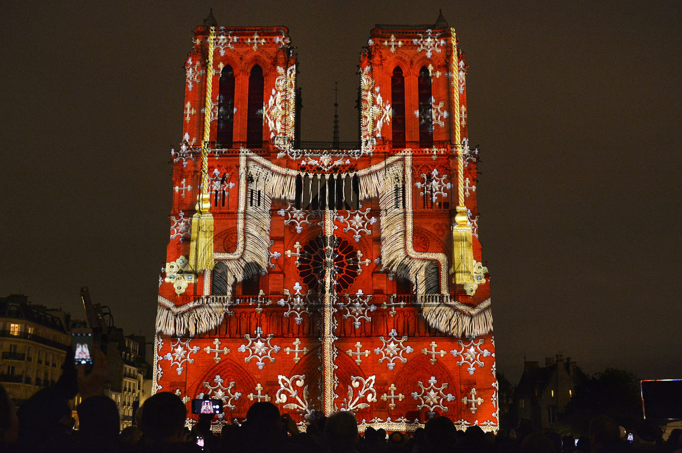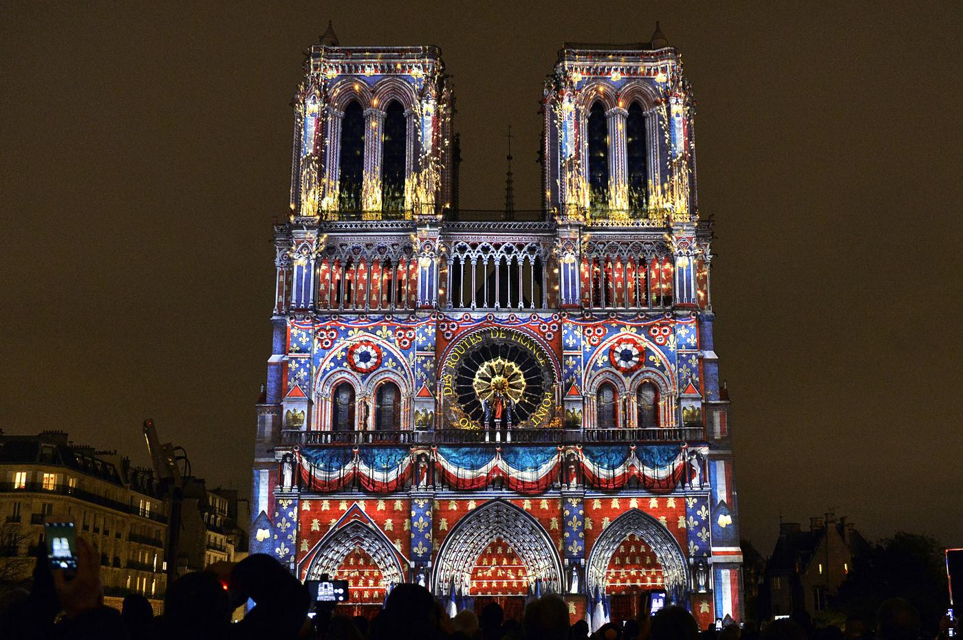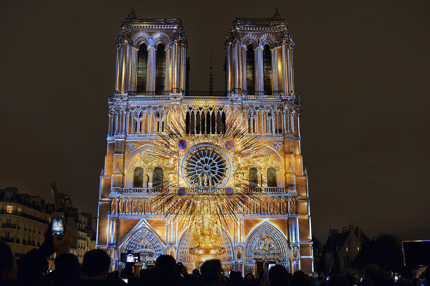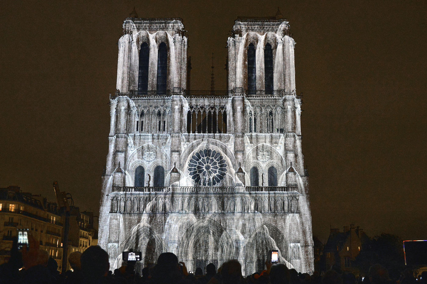The facade of Notre-Dame de Paris dresses up for a sound and light show.