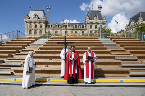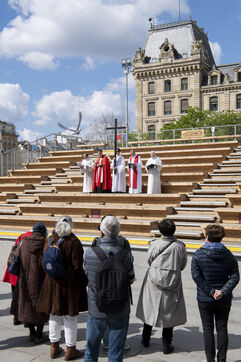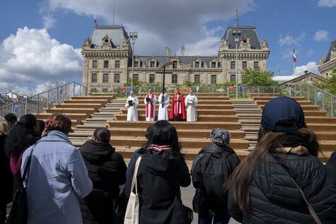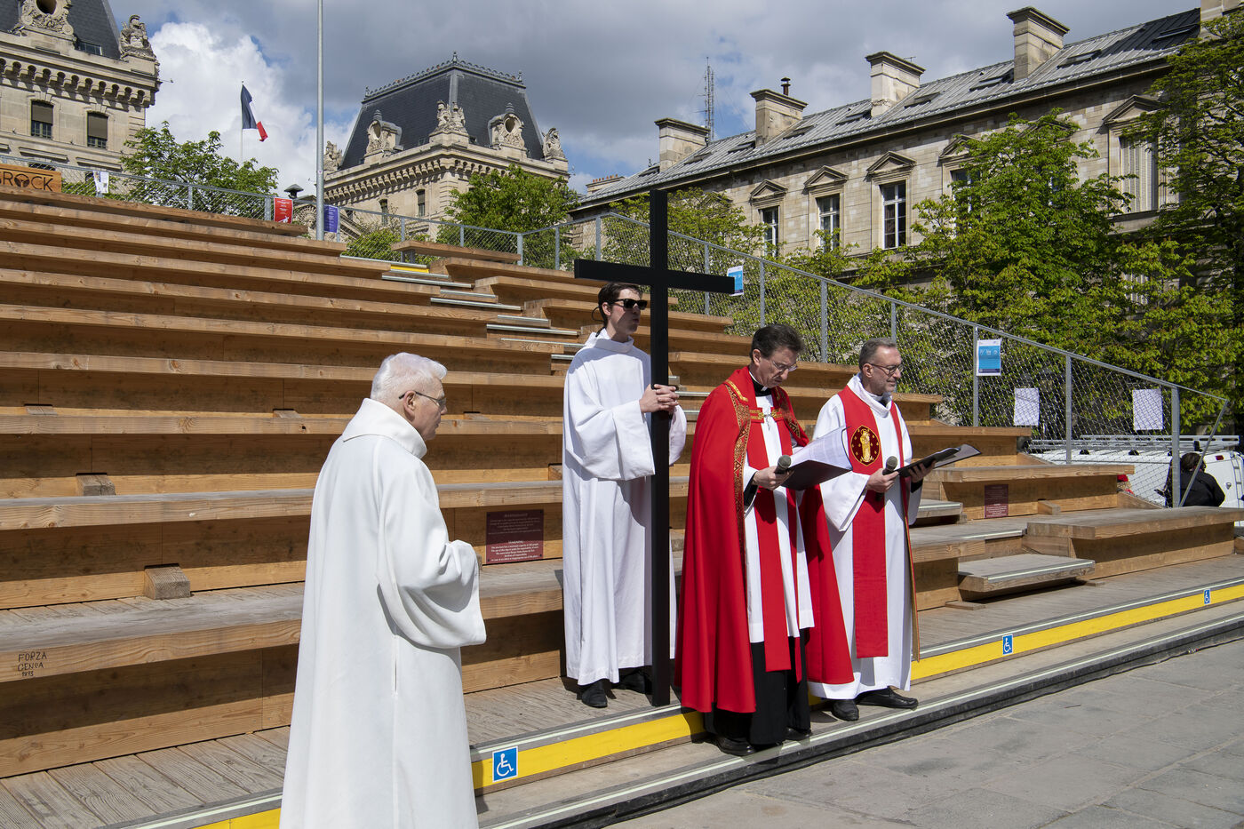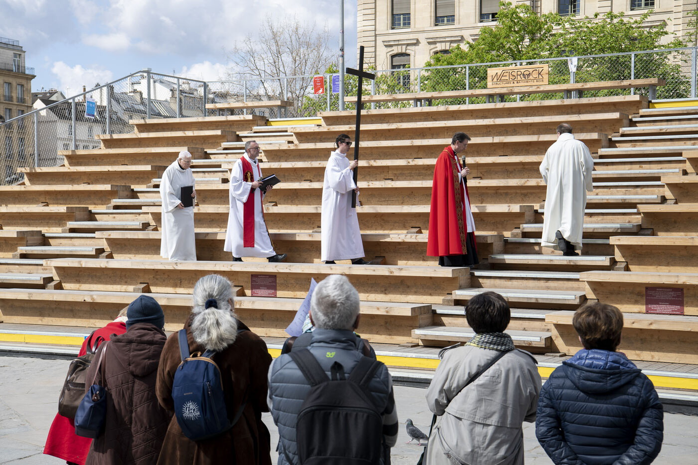 Semaine sainte. Chemin de croix sur le parvis de la cathédrale Notre-Dame de Paris, lors du vendredi saint.