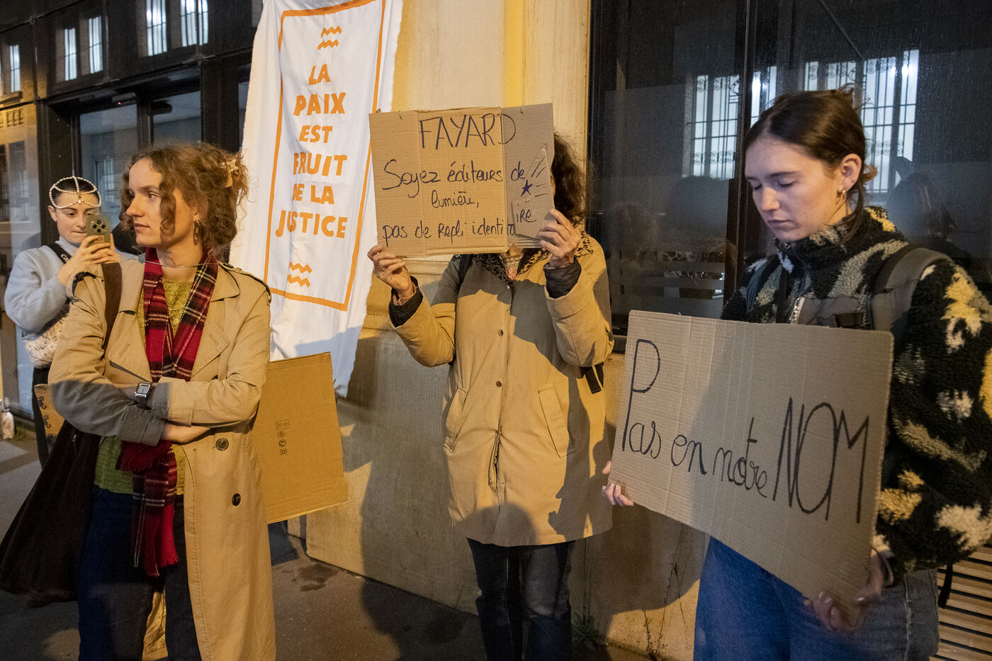 Action of the Lutte et Contemplation collective, in front of the headquarters of Editions Fayard