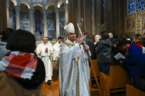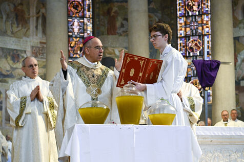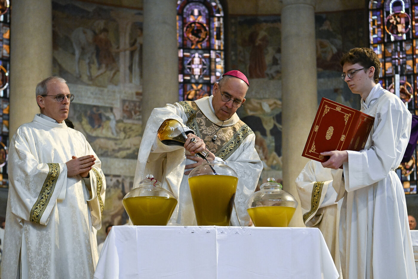 Au cours de la messe chrismale, l'évêque bénit les huiles sacrées. Entouré du clergé et des fidèles, ils renouvellent les promesses sacerdotales