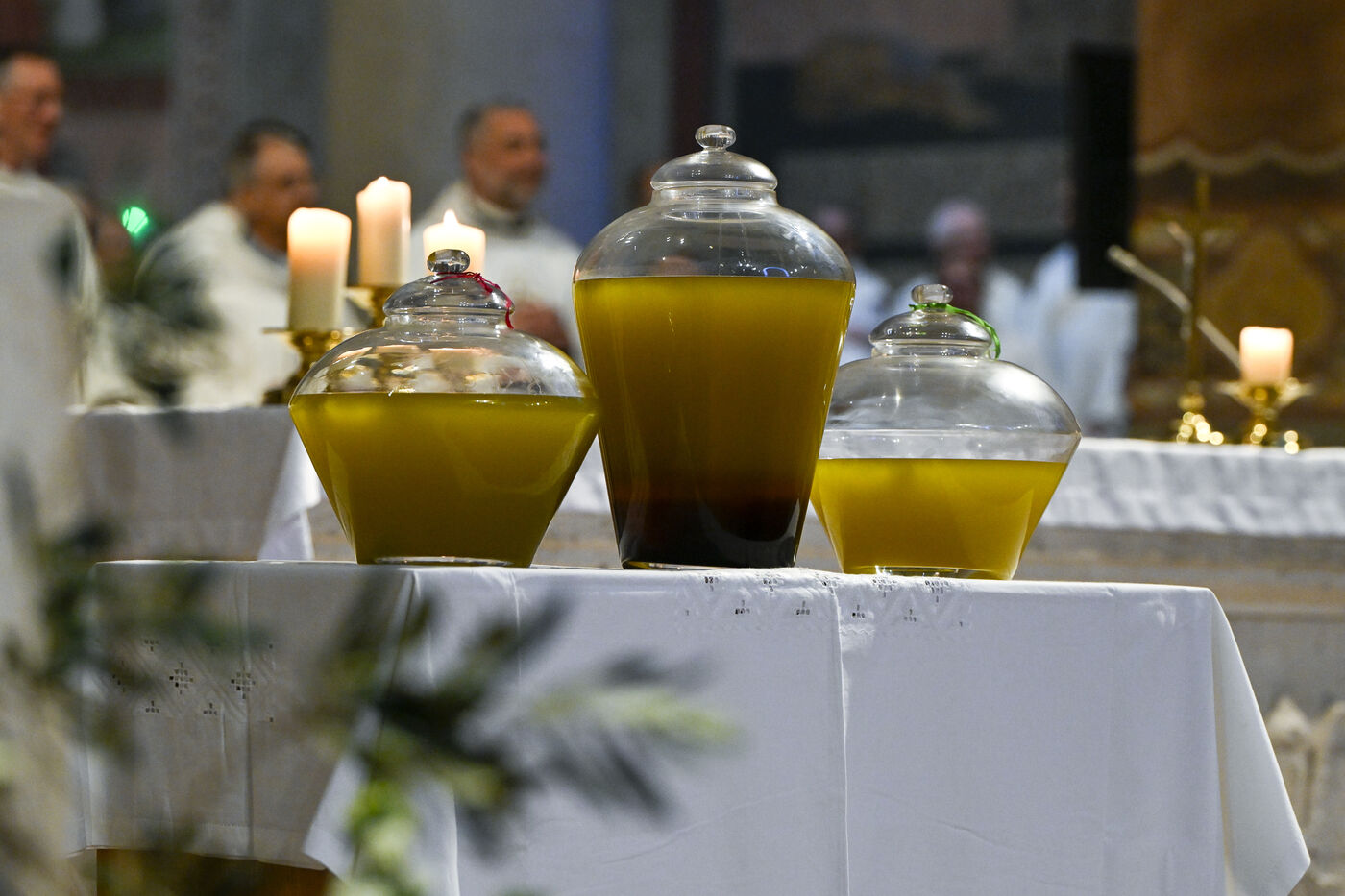 During the Chrism Mass, the bishop blesses the sacred oils. Surrounded by the clergy and the faithful, they renew priestly promises