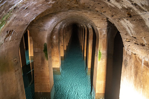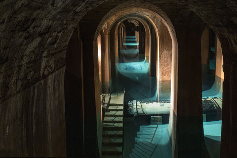 Construit au XIXe siècle, entre 1869 et 1874, par l'ingénieur Eugène Belgrand, le réservoir de Montsouris fut longtemps la plus grande réserve d'eau potable de la capitale. D'une surface de 60 000 m2 sur deux étages, 1 800 piliers soutiennent ses voûtes et arcades. Le réservoir a une capacité de 200 000 m3 soit un tiers de la consommation journalière des Parisiens. Photographie par Caroline Paux.