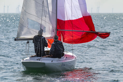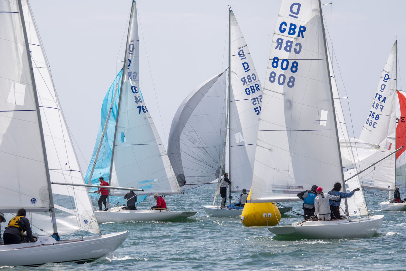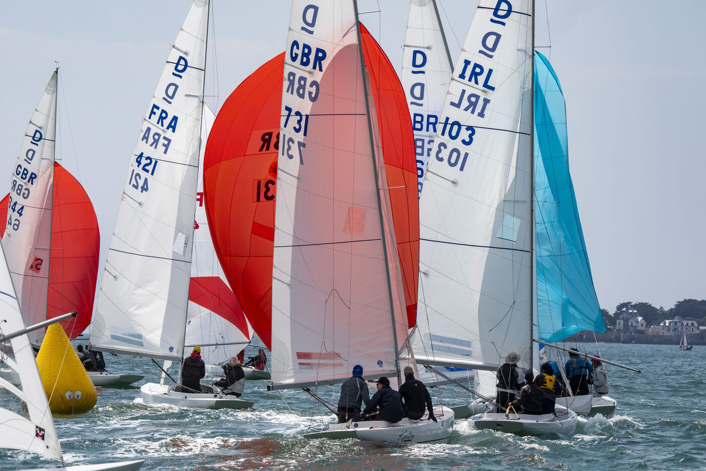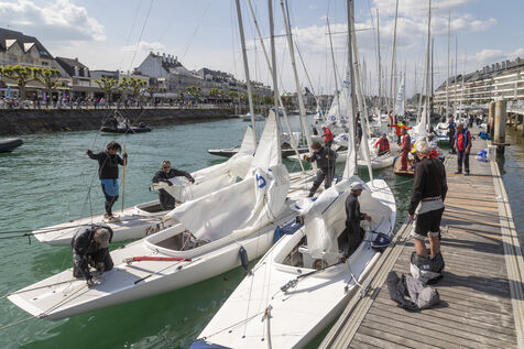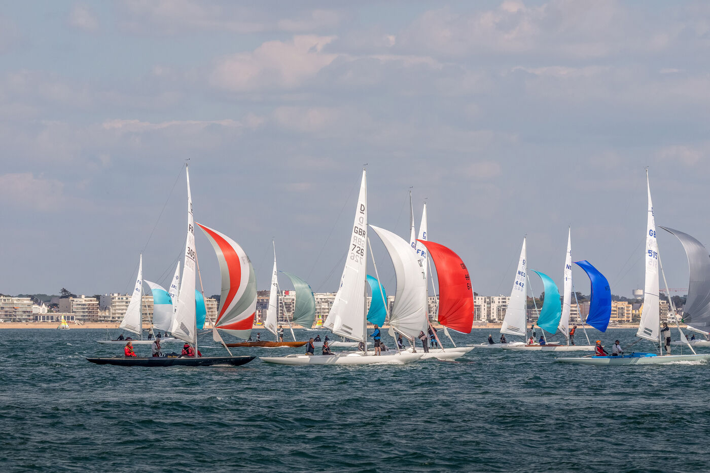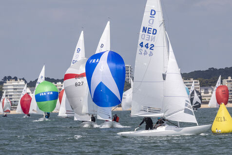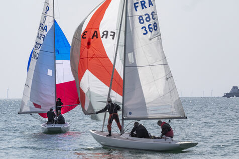 France, La Baule, 2023/05/17. Beginning of the International Dragon Derby of La Baule, organized by the Yacht-club of La Baule from May 17 to 20, 2023. Six nations are represented: twelve English boats, three Irish, four Dutch, three Belgians, one German and twelve French. At the end of the first day, the crew of Douanenez composed of Frédéric and Charlotte Gourlaouen and Jean-François Le Goff, is in the lead among the professionals. Photo by Caroline Paux / Hans Lucas.