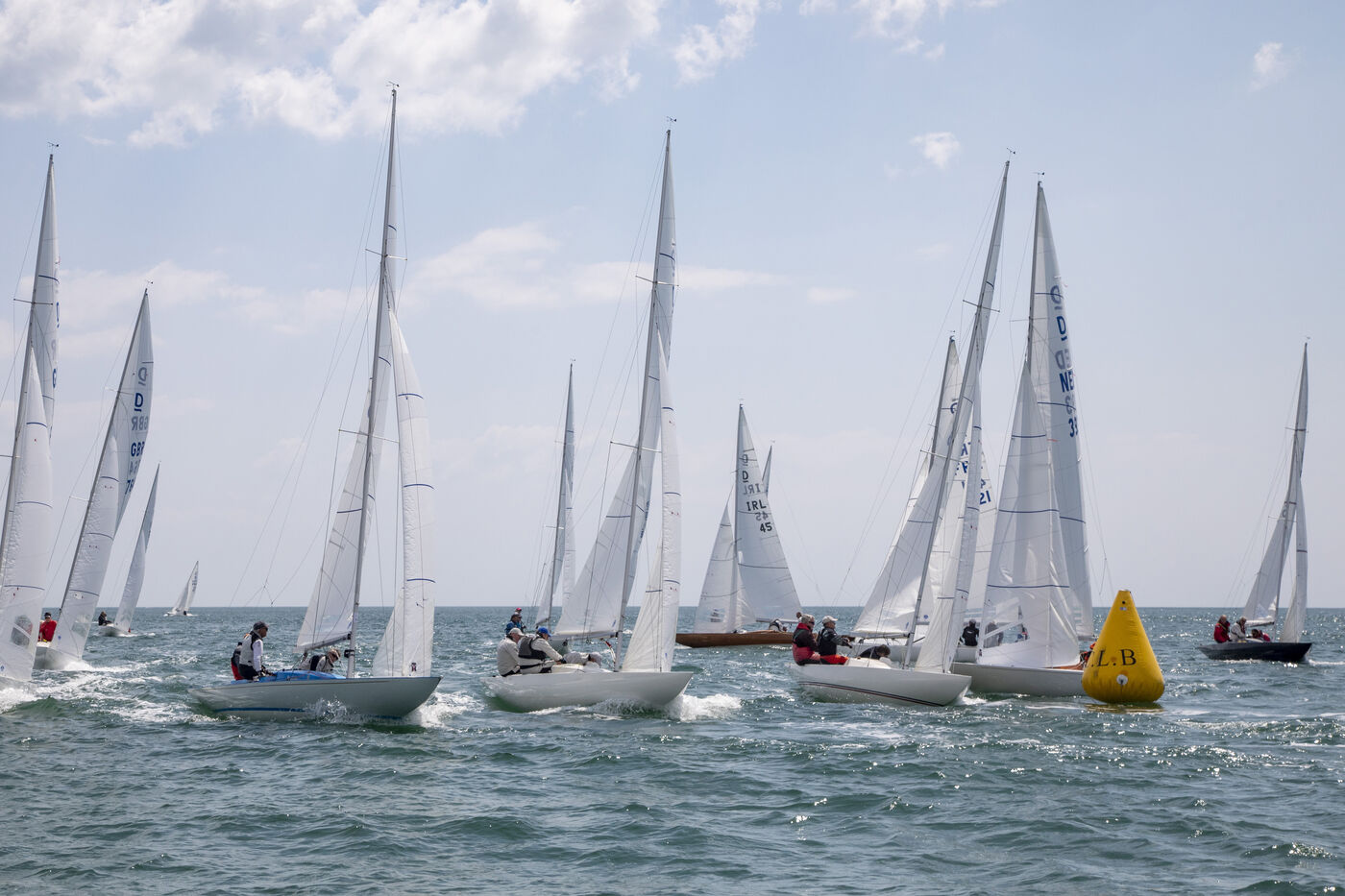 France, La Baule, 2023/05/17. Début du Derby Dragon international de La Baule, organisé par le Yacht-club de La Baule du 17 au 20 mai 2023. Six nations sont représentées : douze bateaux anglais, trois Irlandais, quatre Hollandais, trois Belges, un Allemand et douze Français. Au terme de la première journée, l?équipage de Douanenez composé de Frédéric et Charlotte Gourlaouen et Jean-François Le Goff, est en tête chez les professionnels. Photographie par Caroline Paux / Hans Lucas.