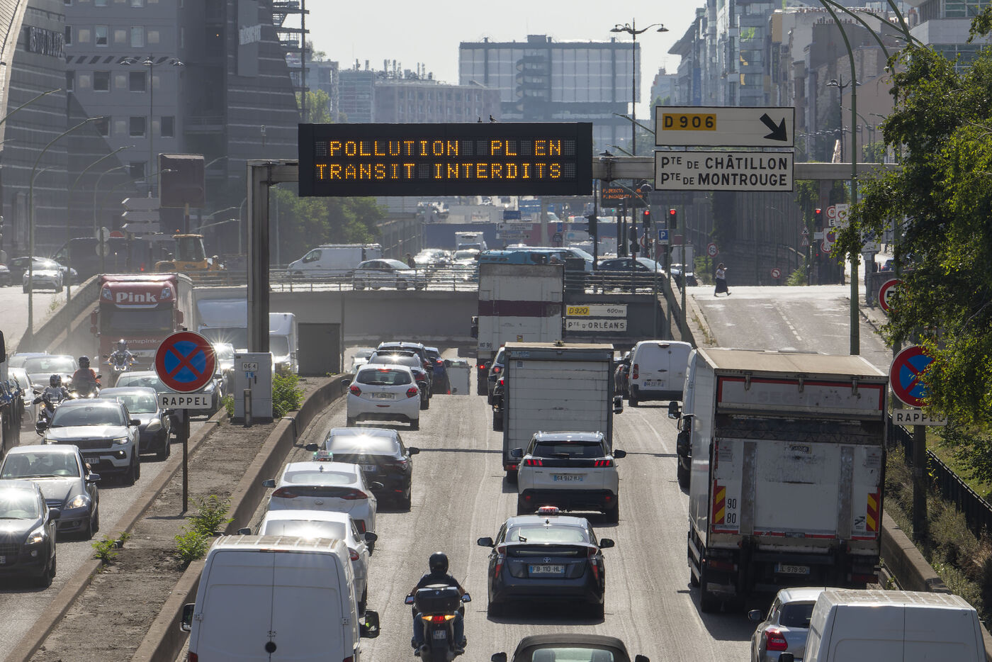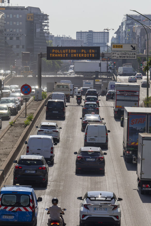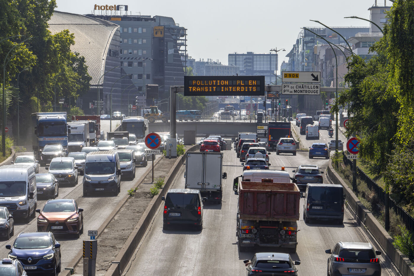 Very heavy traffic and a ban on heavy goods vehicles in transit due to pollution on the Paris ring road in France on 2 July 2025. Due to the heatwave and heavy ozone pollution in the Ile-de-France region, traffic restrictions have been imposed by the Paris Prefecture. Photography par Caroline Paux / Hans Lucas