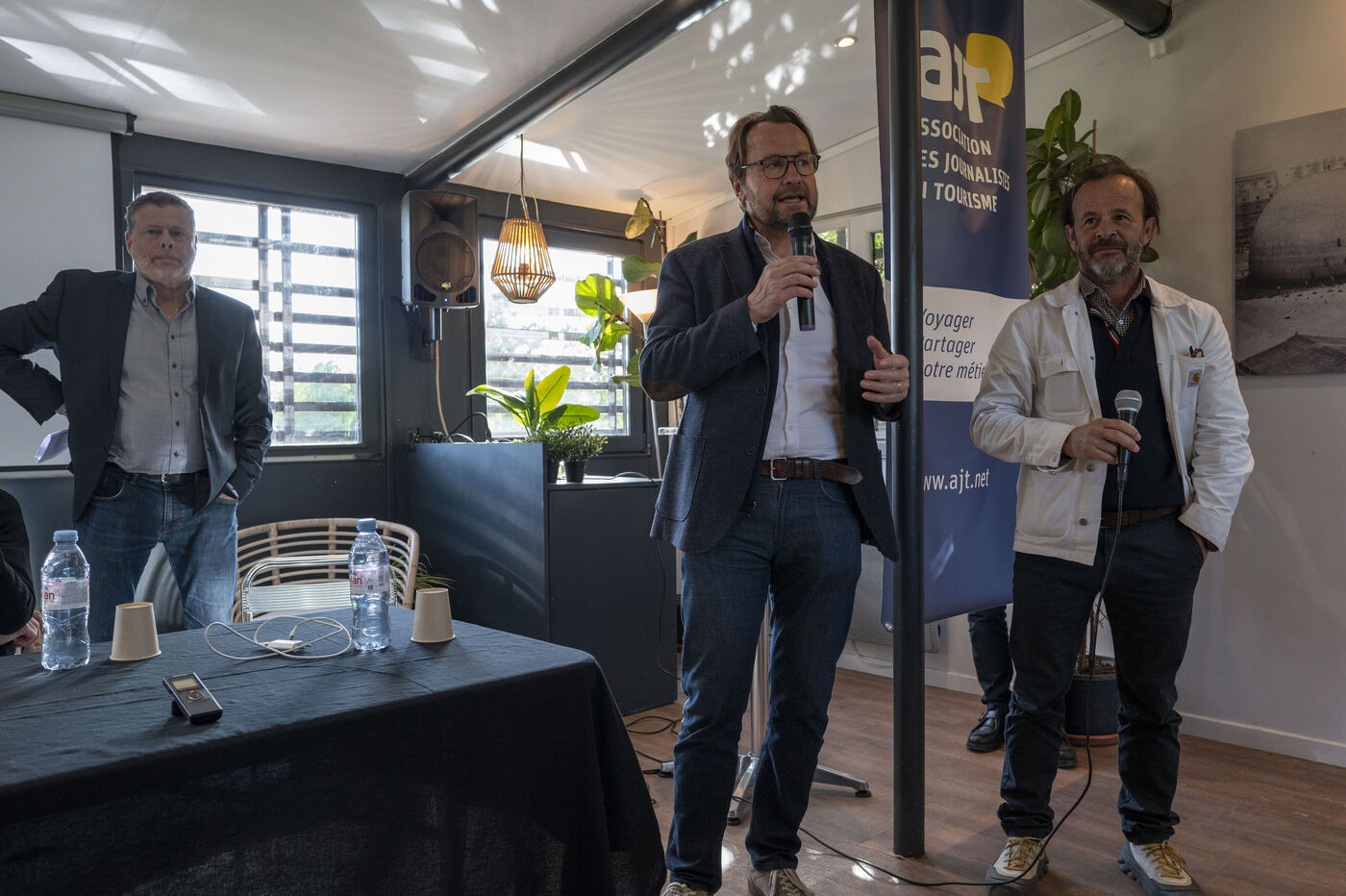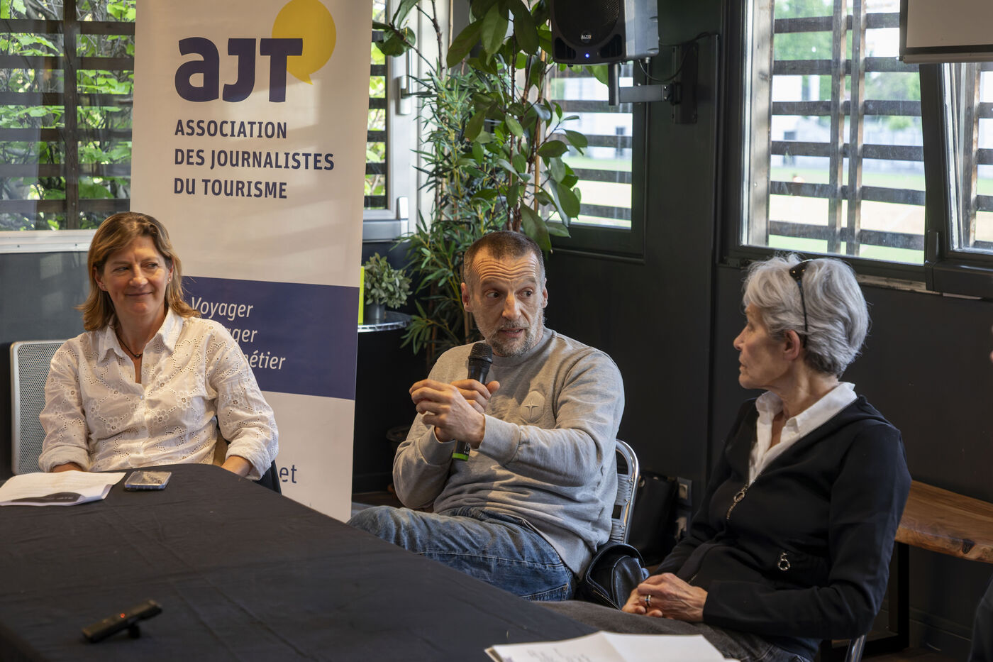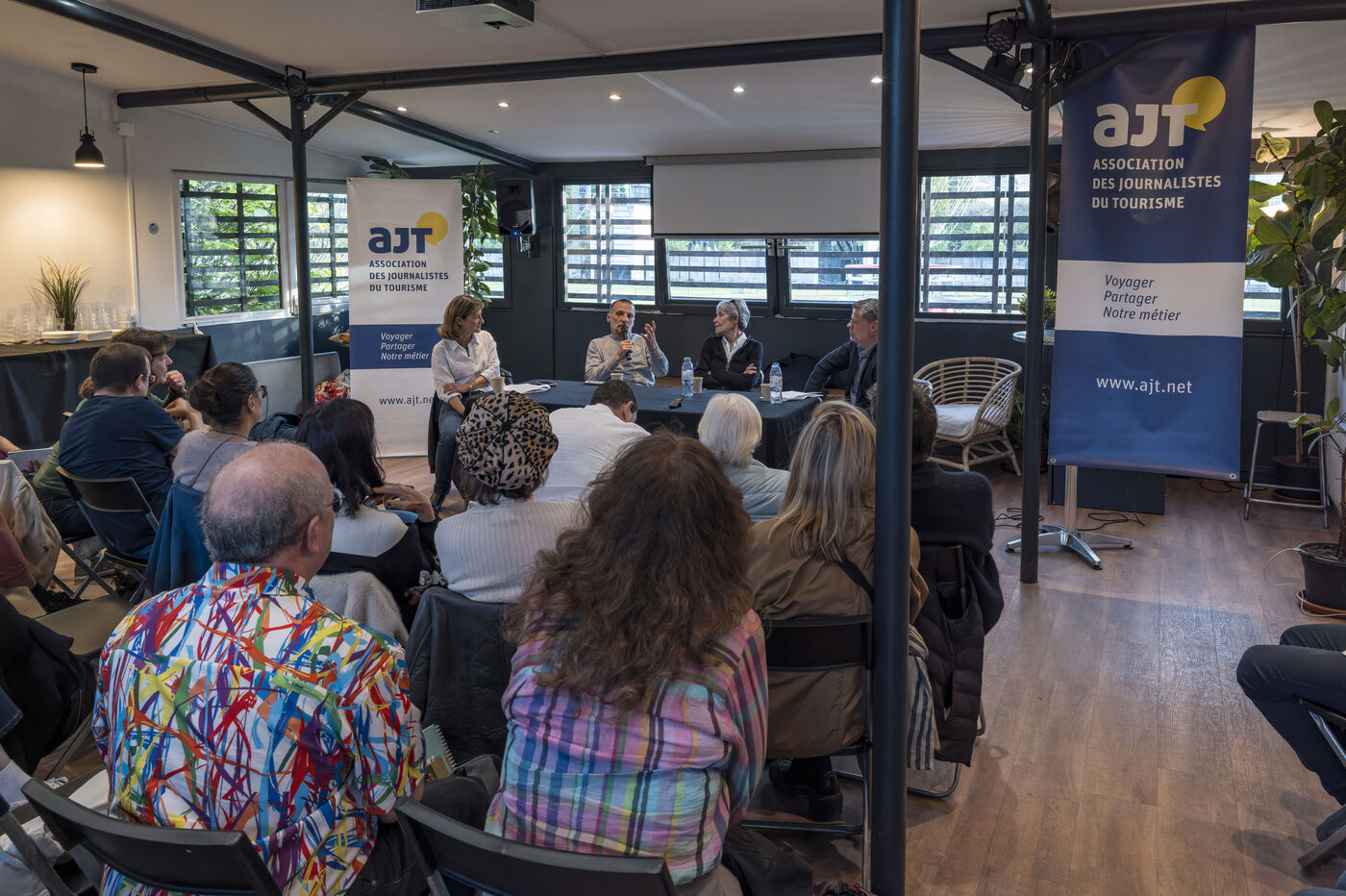 On April 20, 2026, the Association of Tourism Journalists (AJT) hosted an Unexpected Encounter at the Ballon de Paris—a dialogue on exploration and daring—featuring astronaut Claudie Haigneré and actor-director Mathieu Kassovitz, attended by some fifty journalists. Photograph by Caroline Paux / Hans Lucas