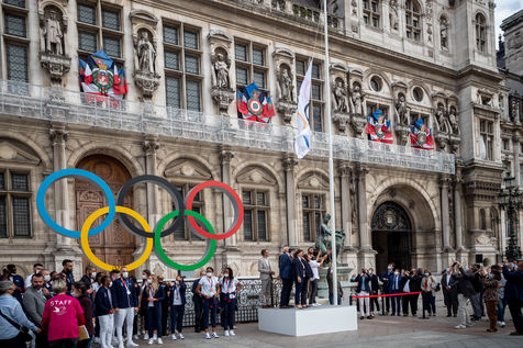 The French Olympic delegation back from Tokyo with the Mayor of Paris Annne Hidalgo, raises the Olympic flag for Paris2024.
