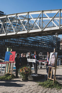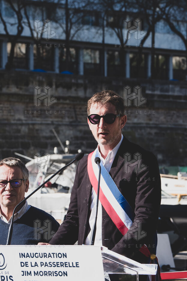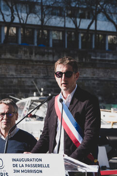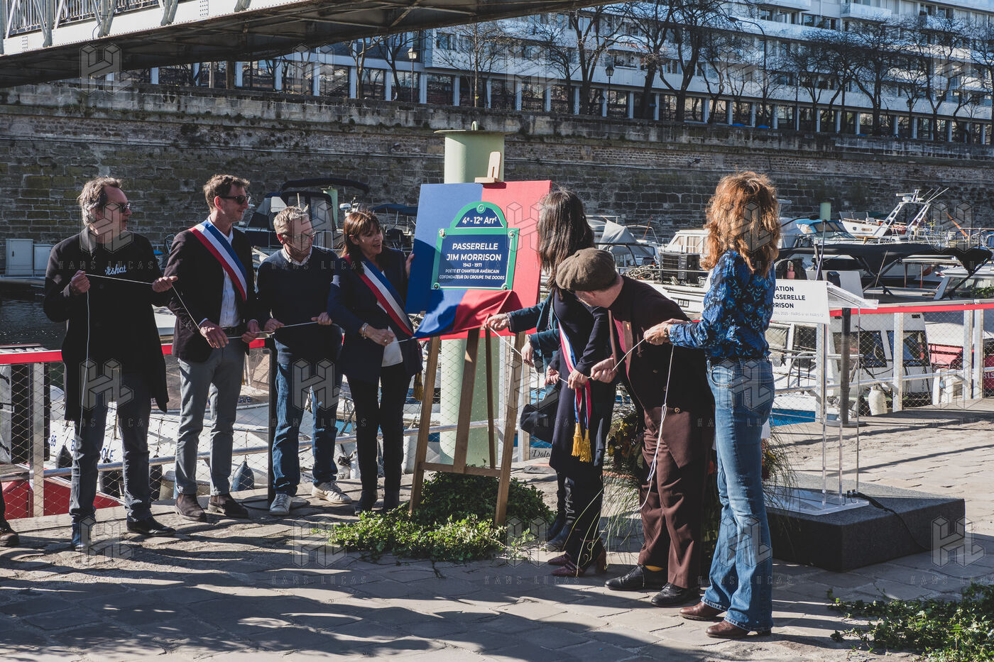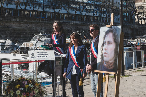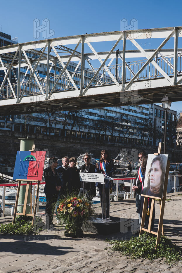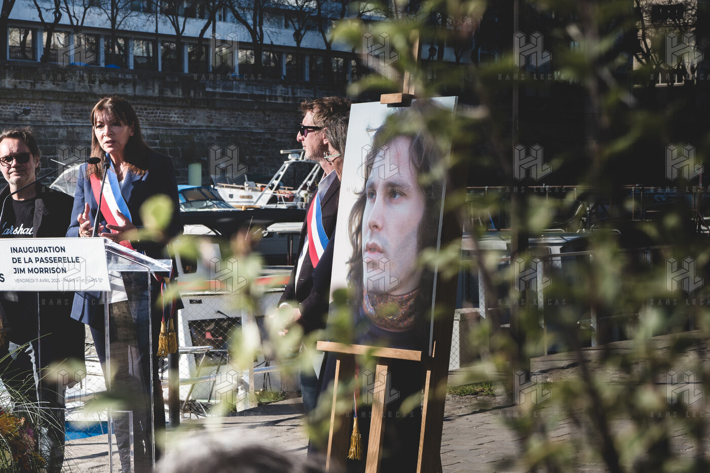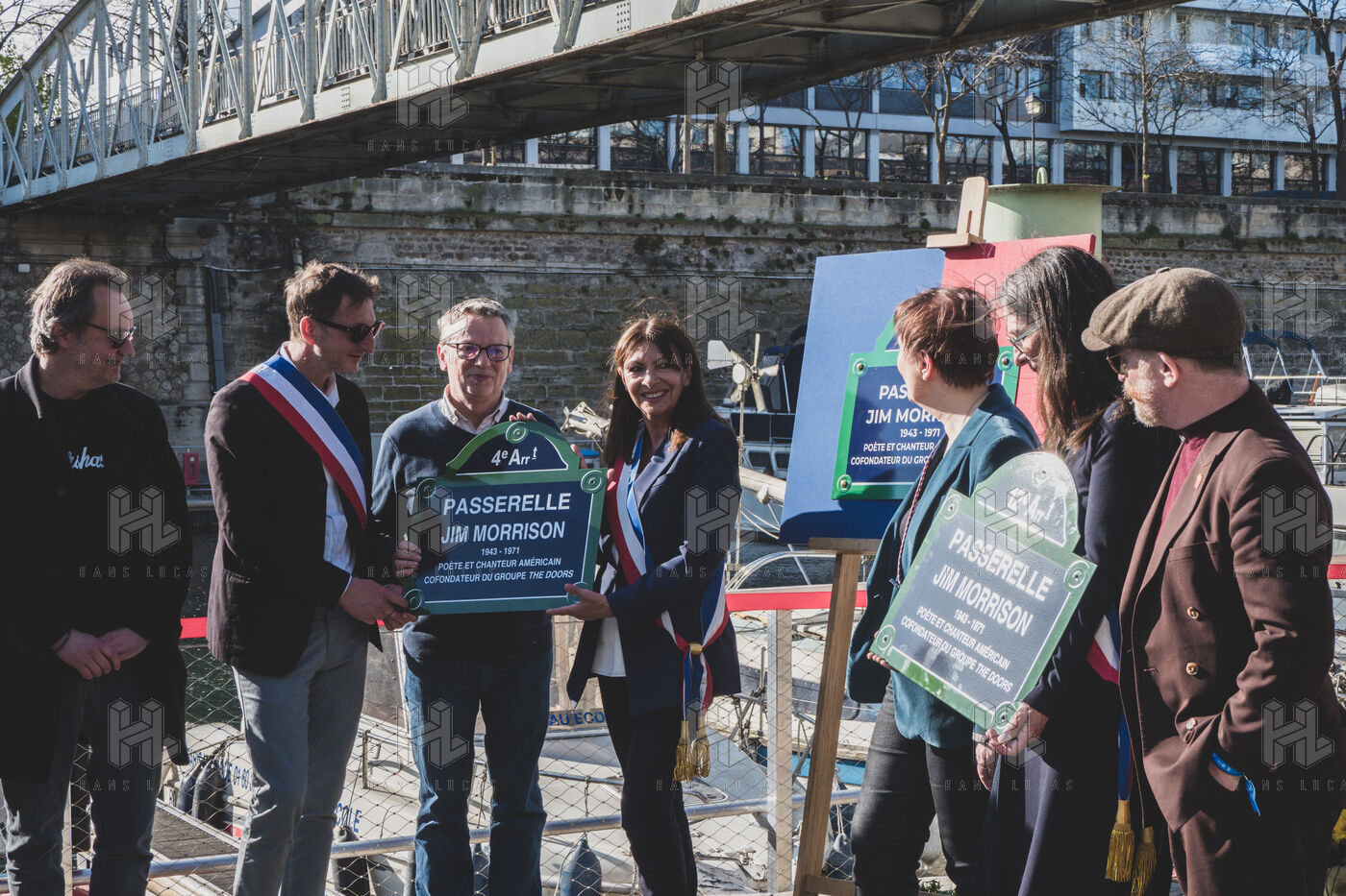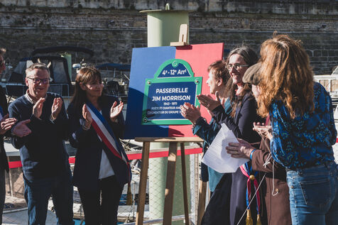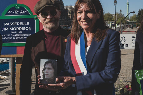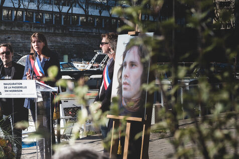 Anne Hidalgo, Mayor of Paris, pays tribute to Jim Morrison, naming the footbridge spanning the Port de l'Arsenal after the legendary singer of The Doors.