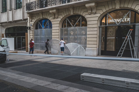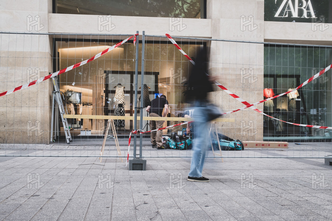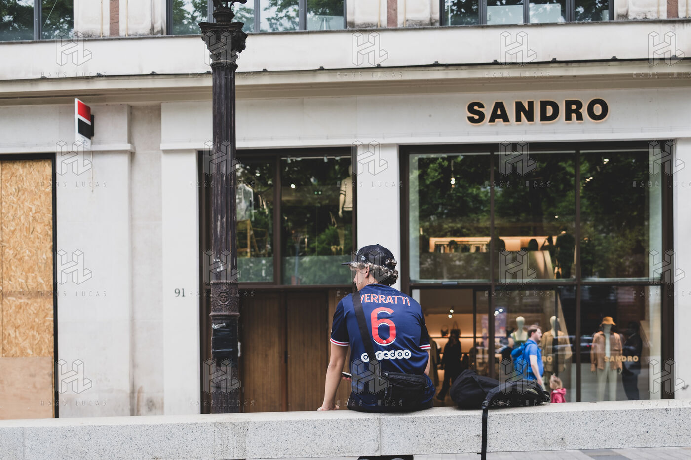 Jour J, les Champs Elysées se préparent pour le match du PSG en finale de la Champions League. Les boutiques protègent leurs vitrines, les supporters arborent leurs maillots.