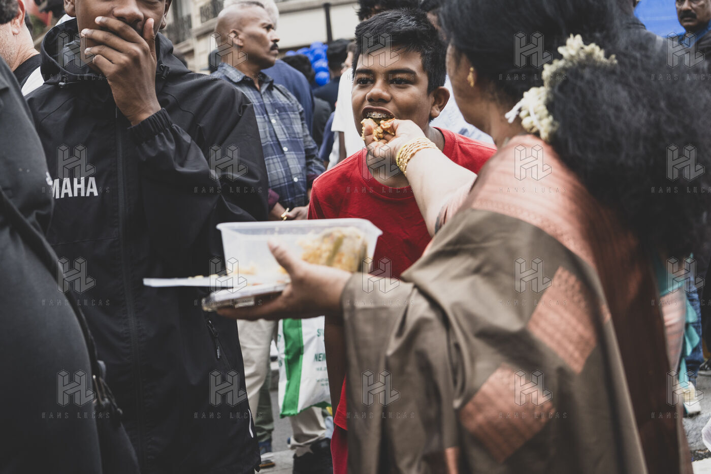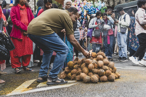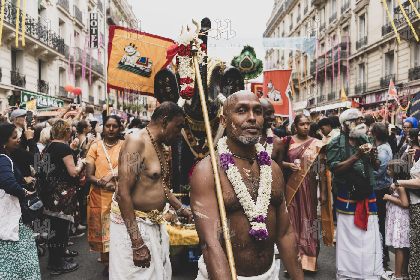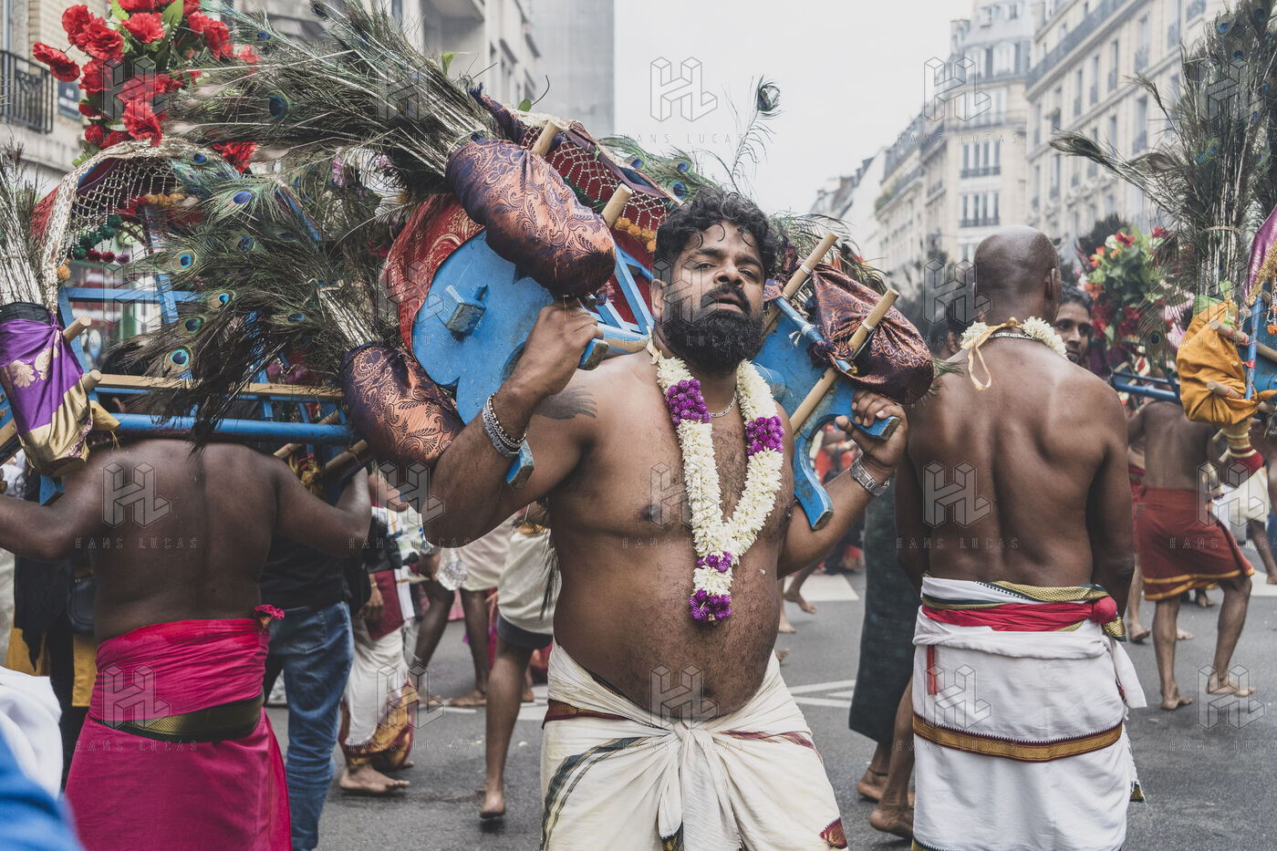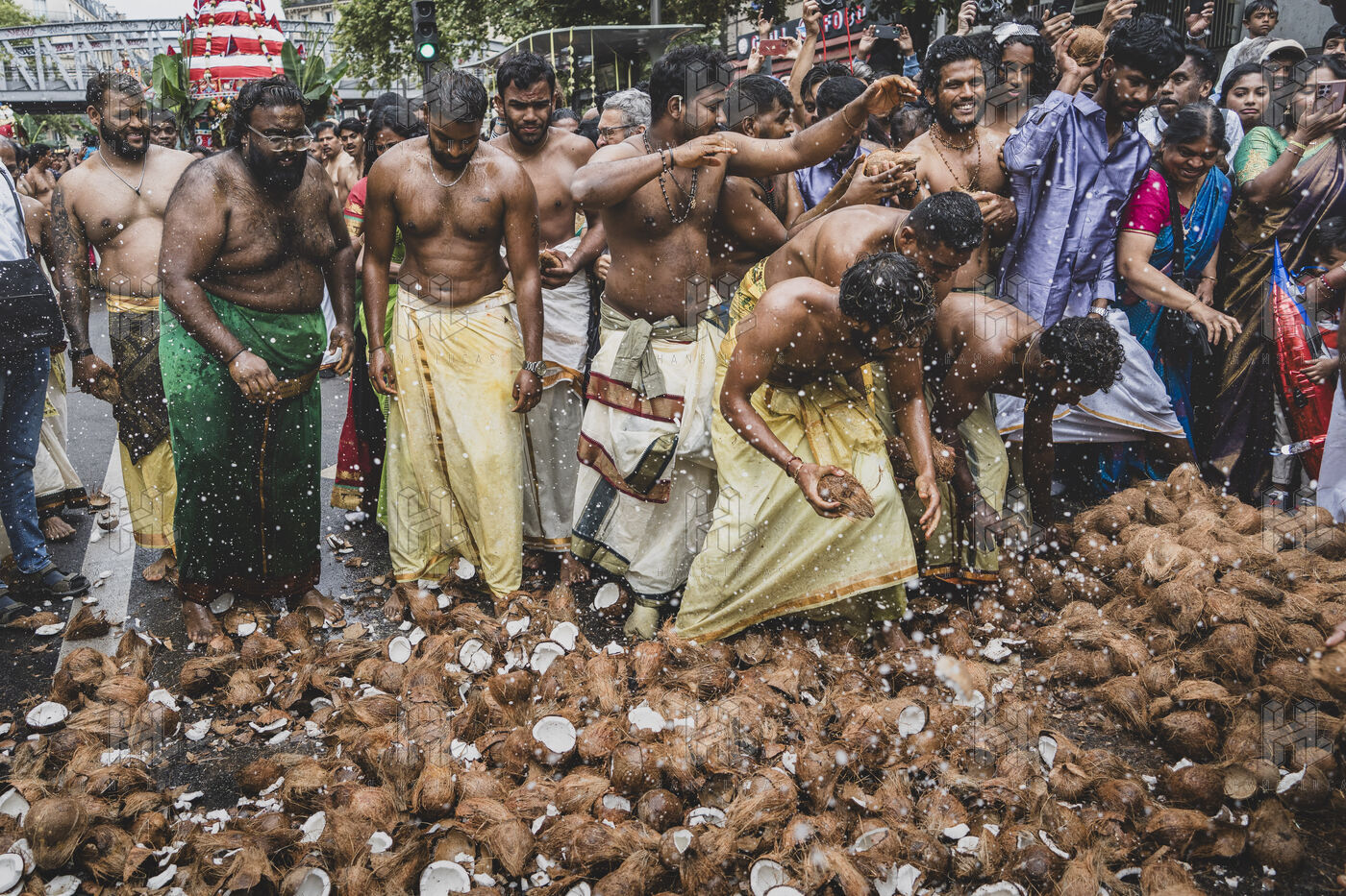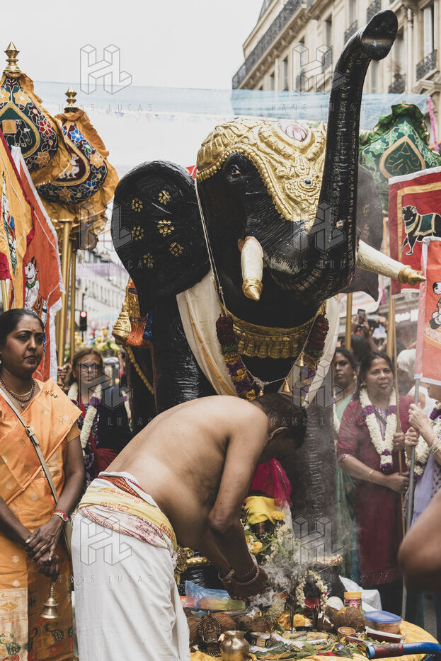 It is around the Sri Manicka Vinayakar Alayam temple located in the 18th arrondissement of Paris, that Ganesh is celebrated every year in the capital. During this day of celebration, religious ceremonies and a procession take place in the streets of the neighborhood. During this religious parade, coconuts are broken: the shell represents the illusion of the world, the flesh represents individual karma, and the coconut water represents the ego. This water is poured as the representation of Ganesha passes by. Next come the dancers, who carry large peacock feather arches called kavadi on their shoulders, and the female dancers, who carry terracotta pots with burning camphor on their heads.
