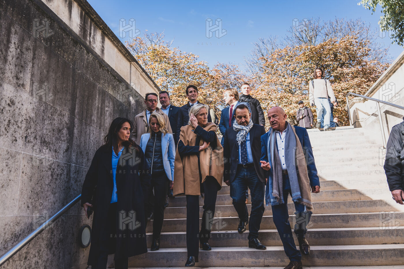 Marine Le Pen en déplacement au Salon du Patrimoine culturel au carrousel du Louvre, point presse.