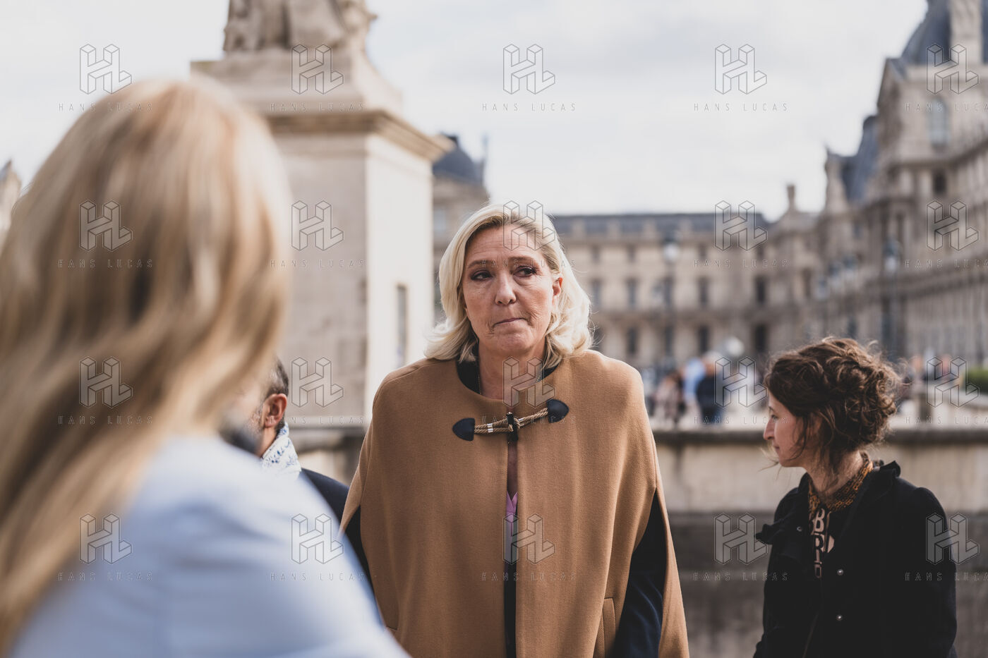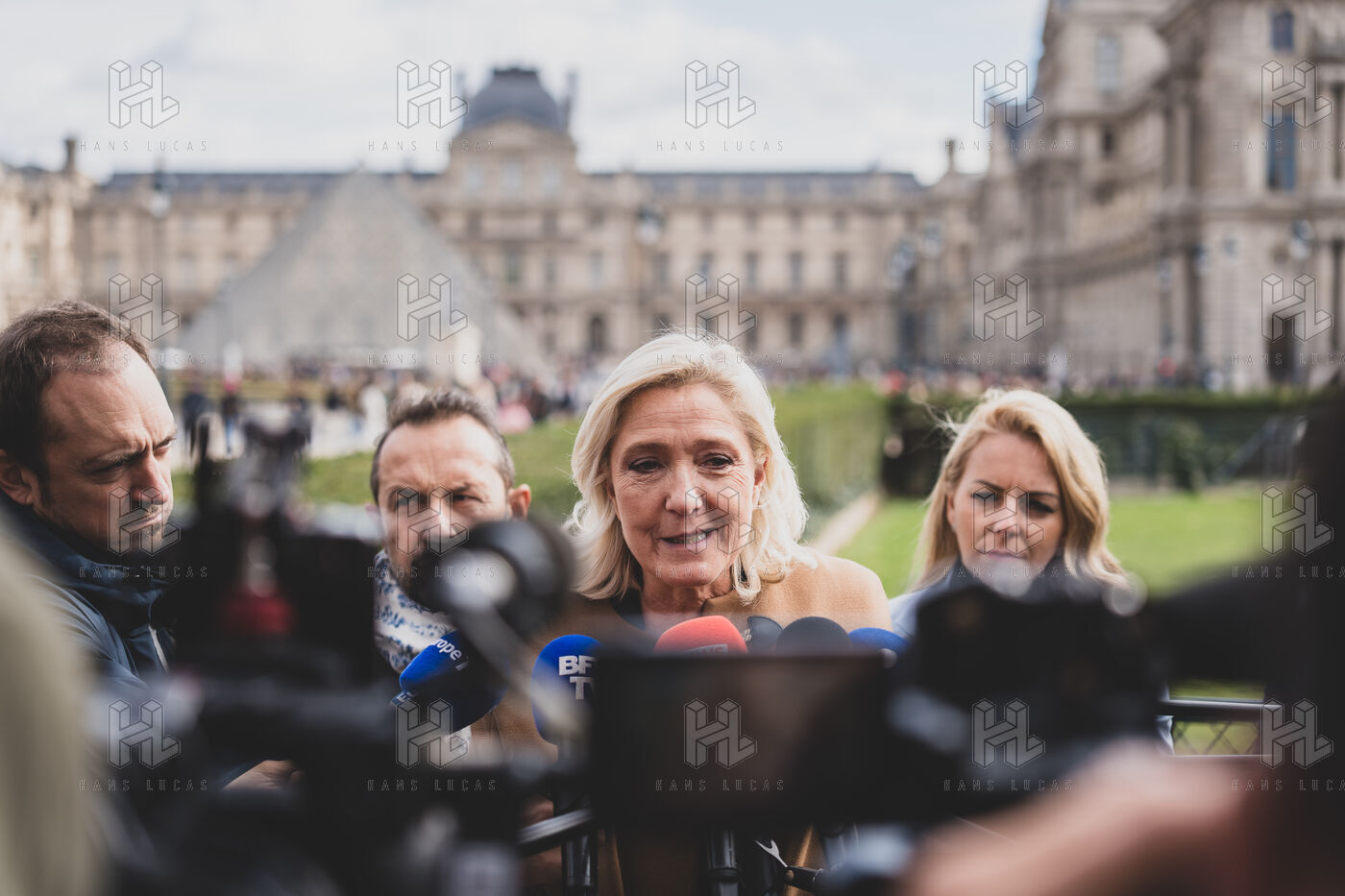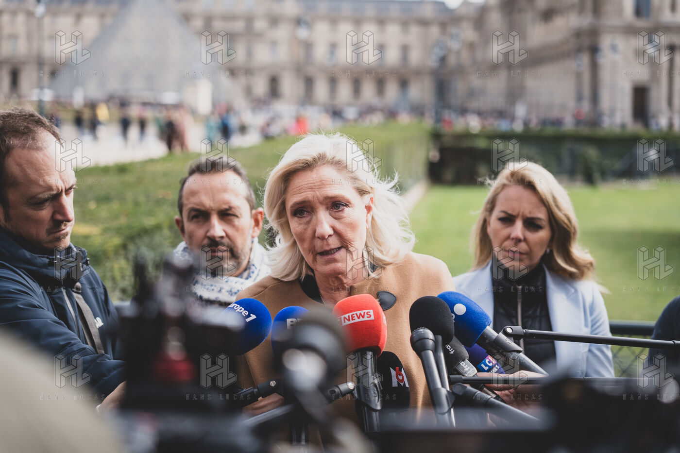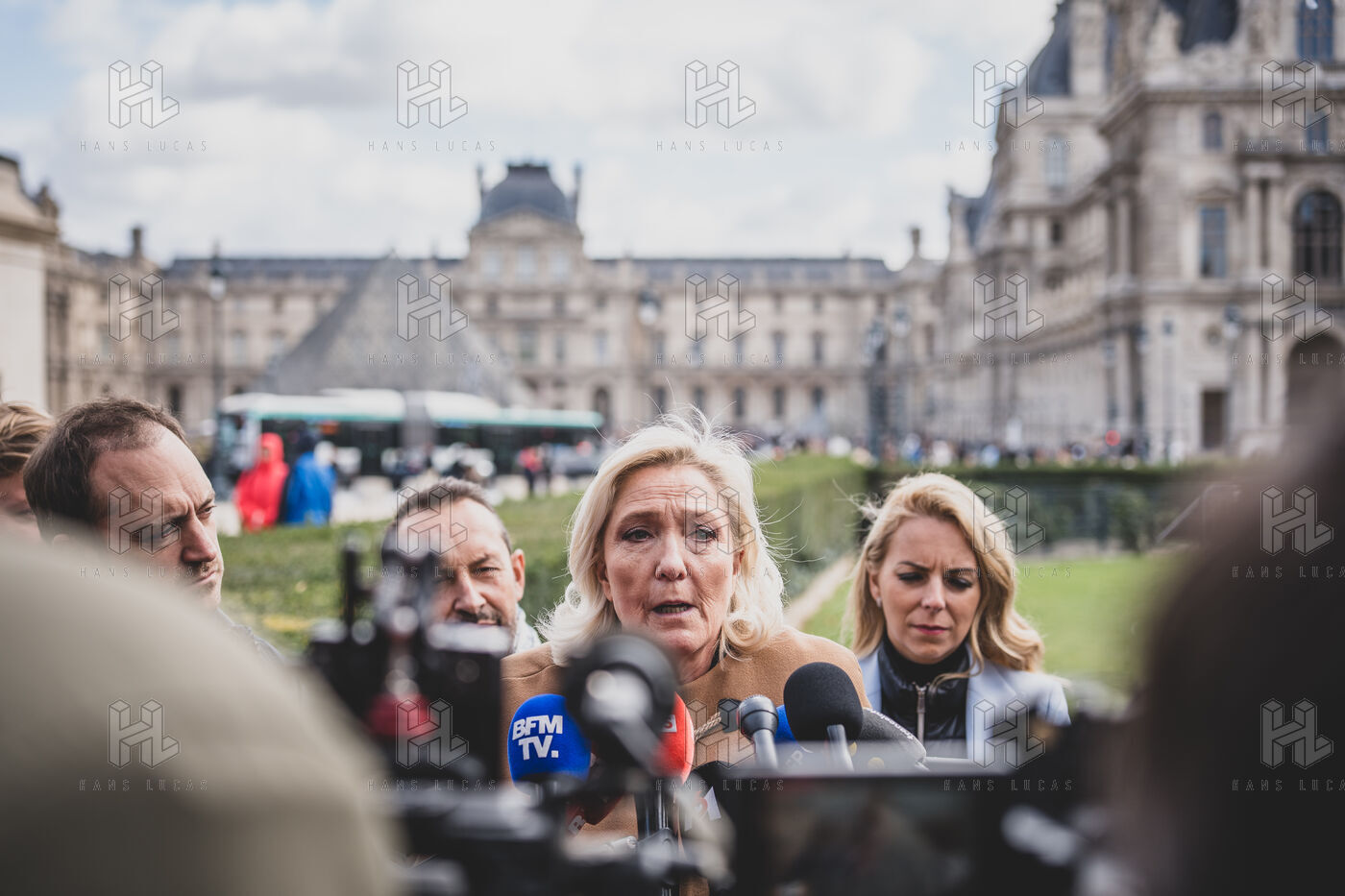 Marine Le Pen visiting the Cultural Heritage Fair at the Carrousel du Louvre, press briefing.
