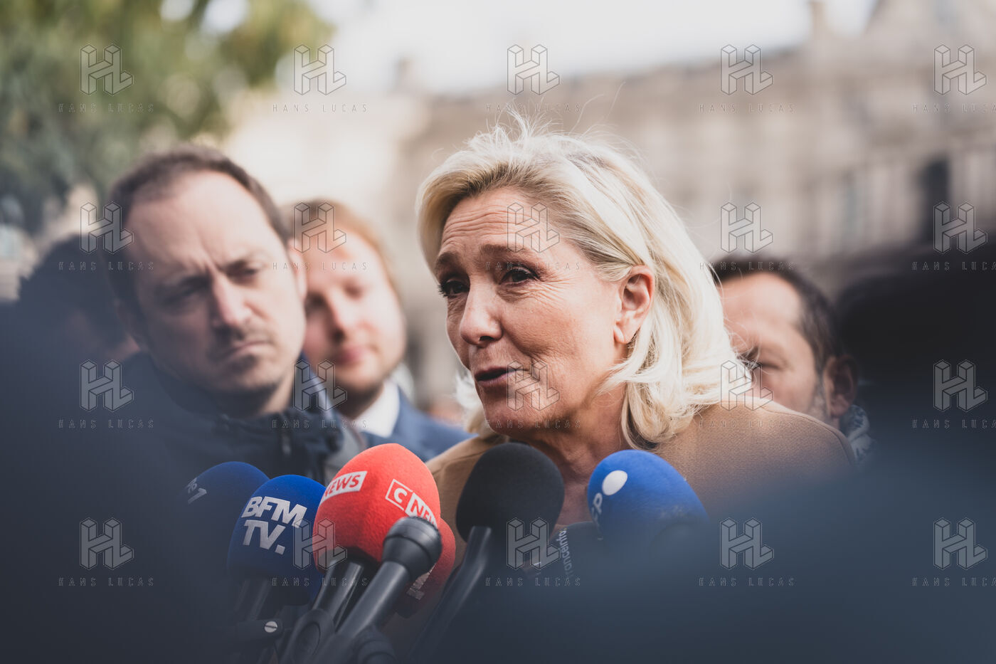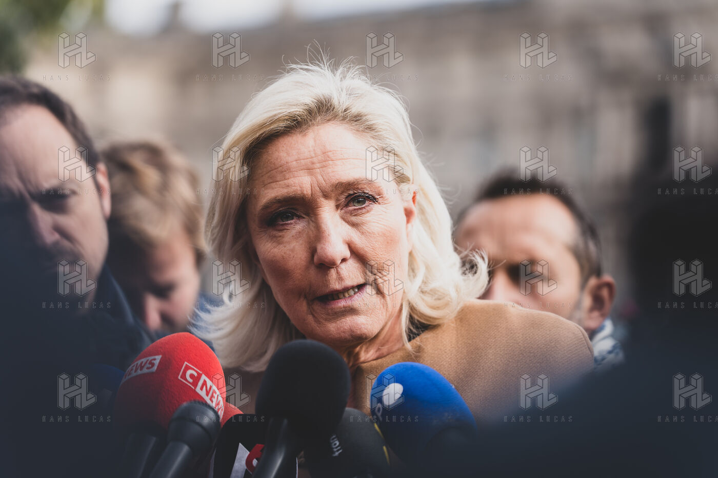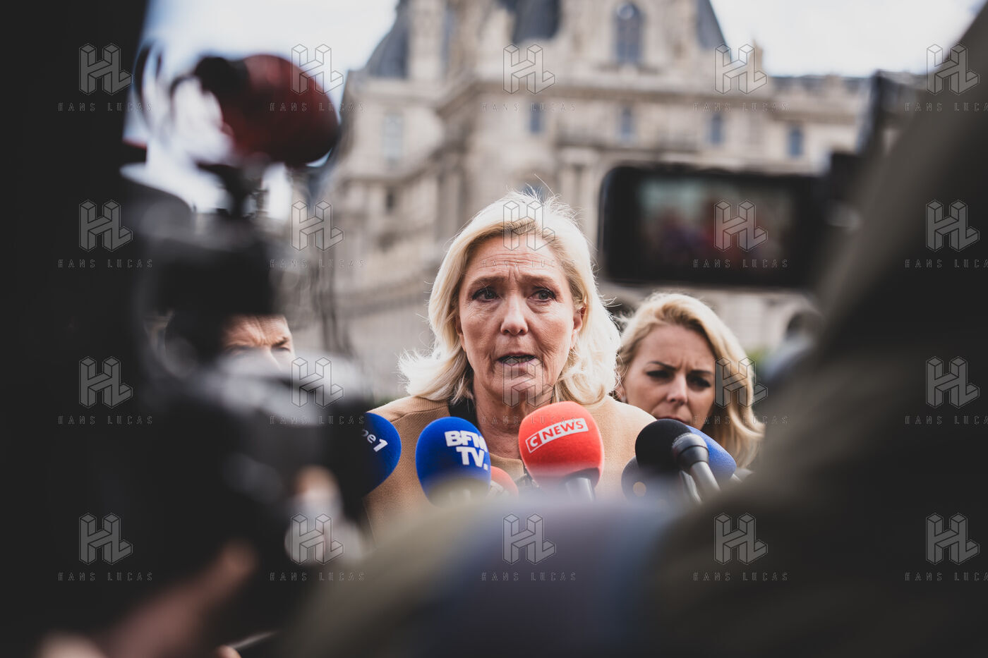Marine Le Pen visiting the Cultural Heritage Fair at the Carrousel du Louvre, press briefing.